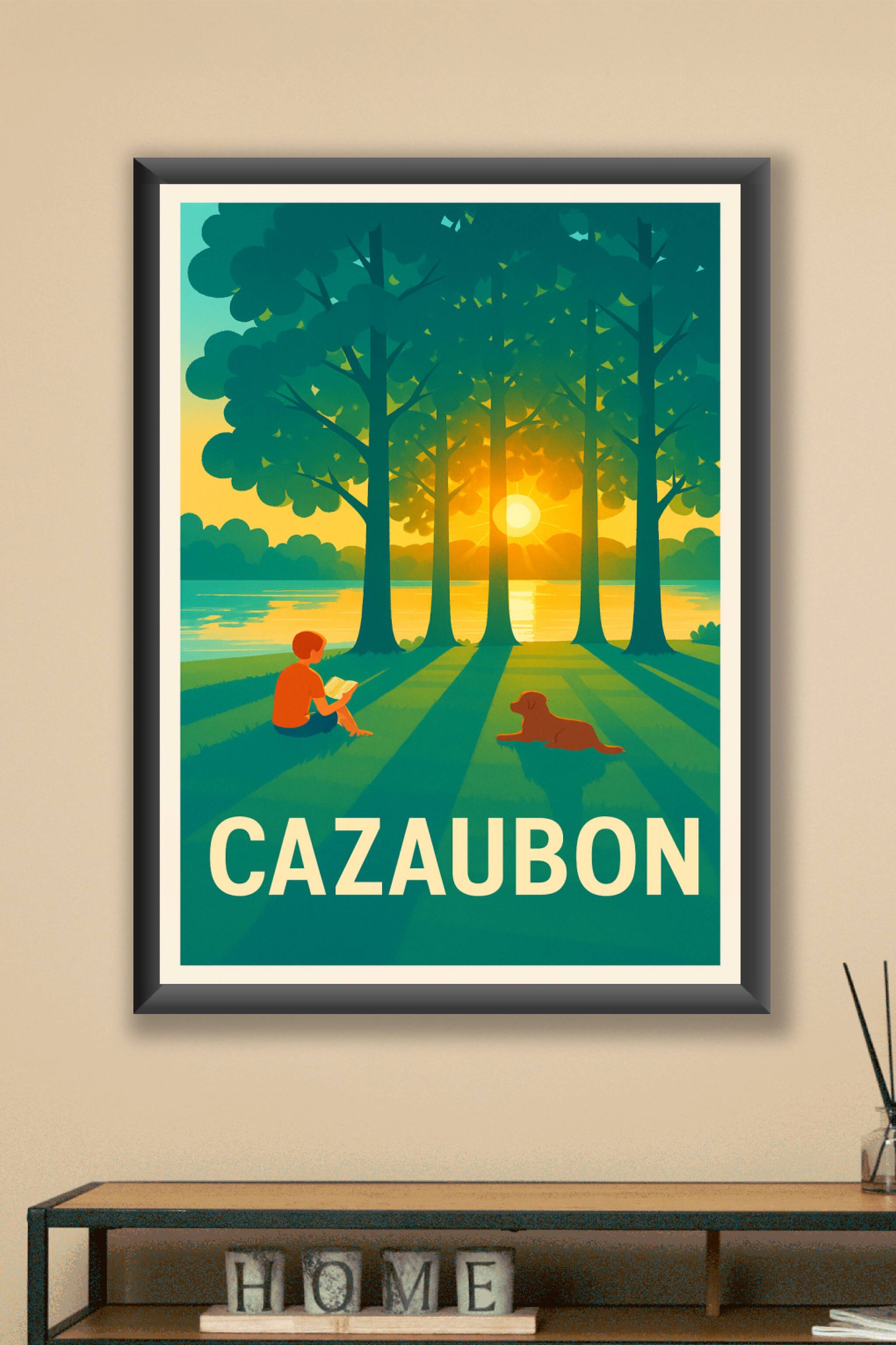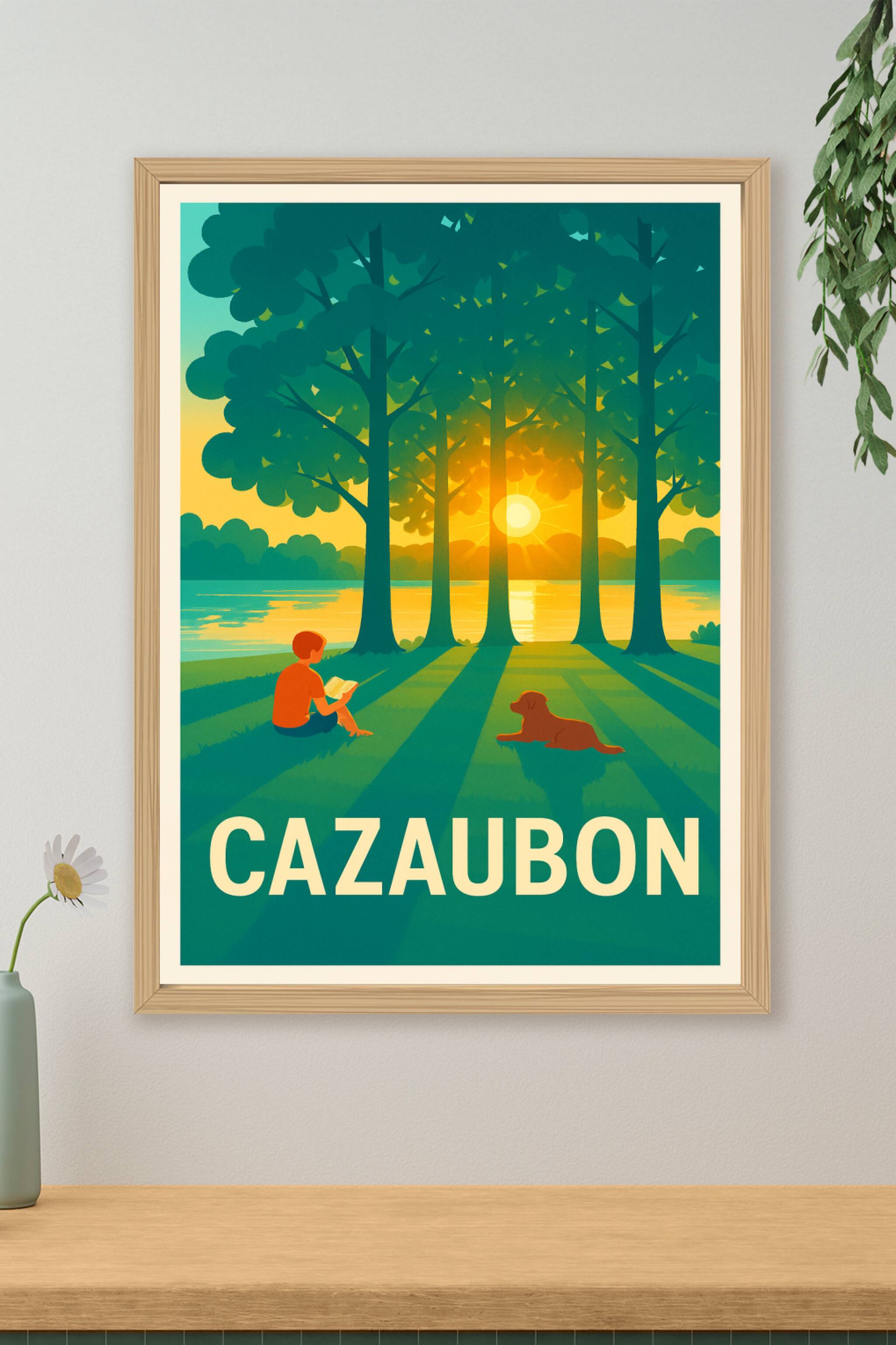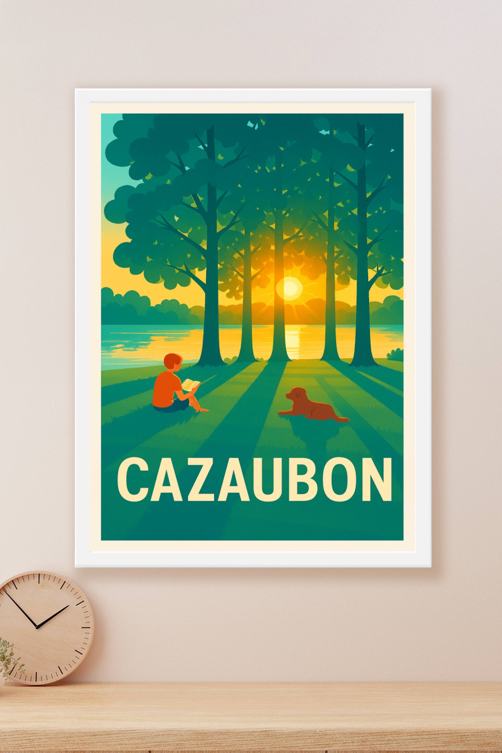 Découvrez la douceur et la quiétude de Cazaubon avec cette affiche illustrant un moment paisible au bord de l'eau, où un enfant lit tranquillement ...