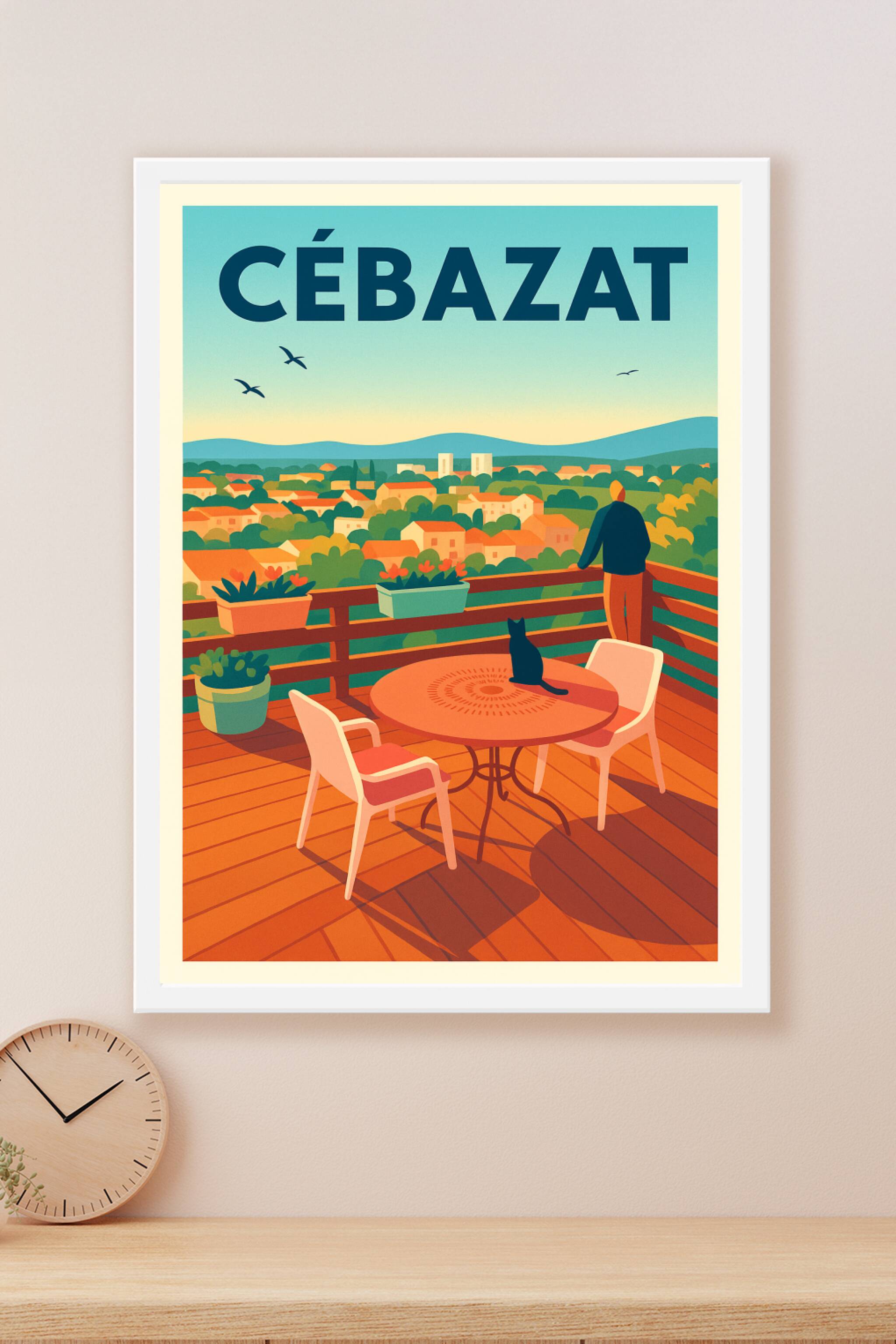 Cette affiche colorée et chaleureuse capture un moment de sérénité à Cébazat, où un personnage contemple un panorama bucolique depuis une terrasse ...