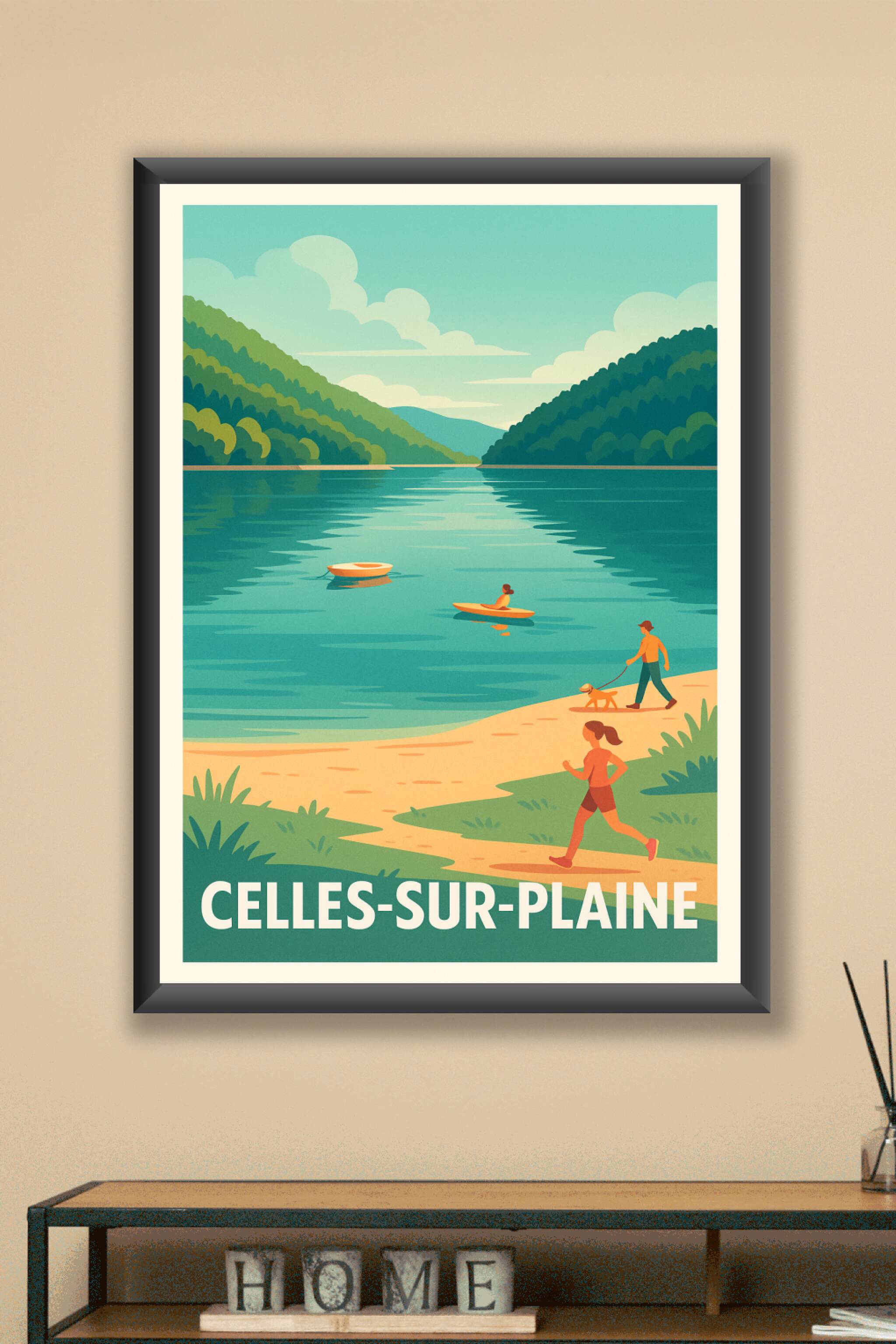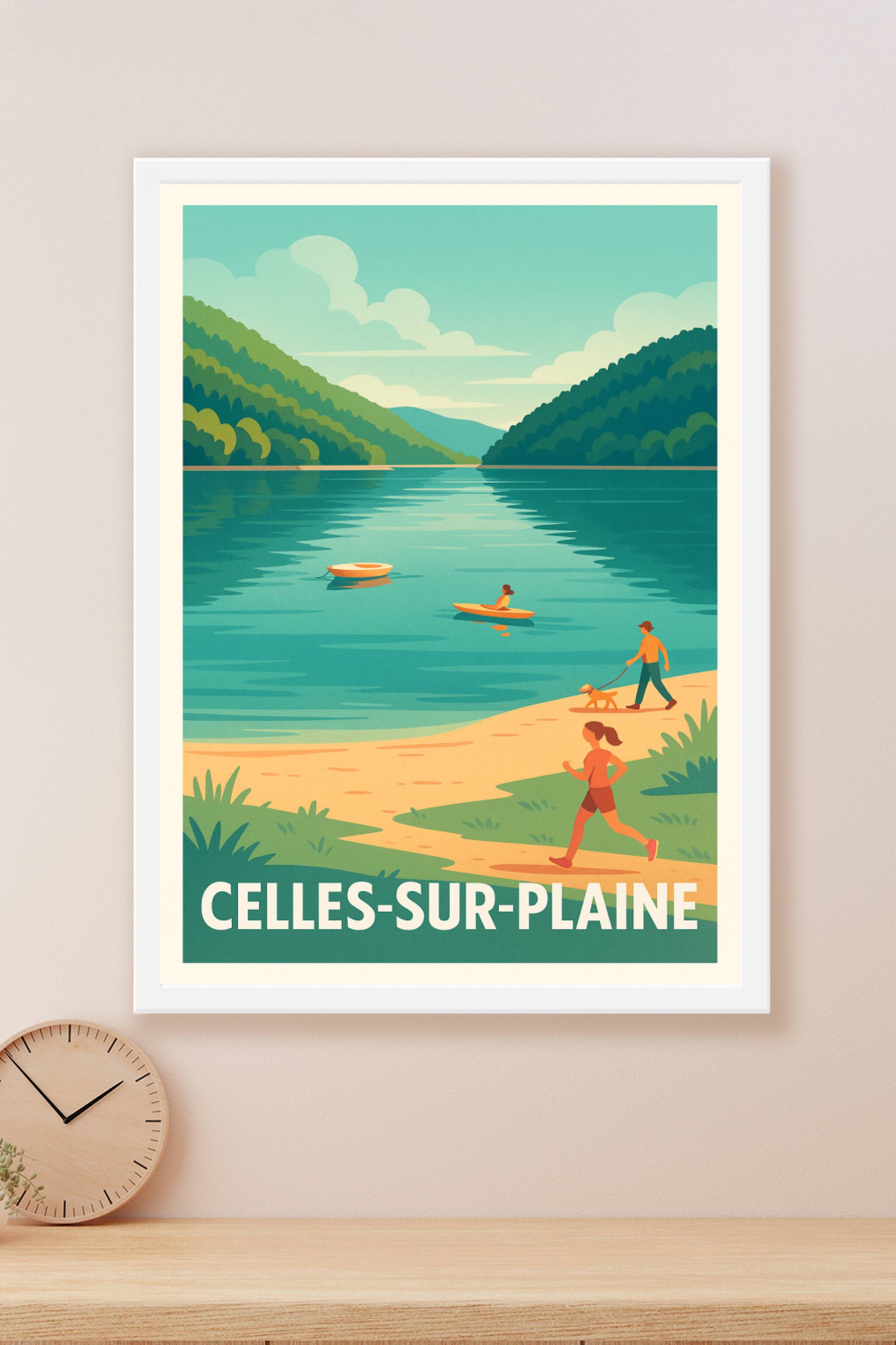 Découvrez la sérénité de Celles-sur-Plaine à travers cette affiche illustrée, mettant en scène un paysage apaisant où l’eau calme reflète les collines verdoyantes. Une invitation à la détente et aux activités en plein air avec des personnages en promenade, kayak ou jogging.Ce poster est imprimé en tirage "Fine Art" sur papier 305g coton, garantissant une qualité d'impression exceptionnelle et une durabilité optimale. Disponible en formats A1 à A4, avec ou sans cadre, cette affiche sublimera votre intérieur et apportera une touche naturelle et vivante à votre décoration. Fabriqué avec soin en France, ce tirage premium est parfait pour offrir ou se faire plaisir en valorisant le charme unique de Celles-sur-Plaine.
