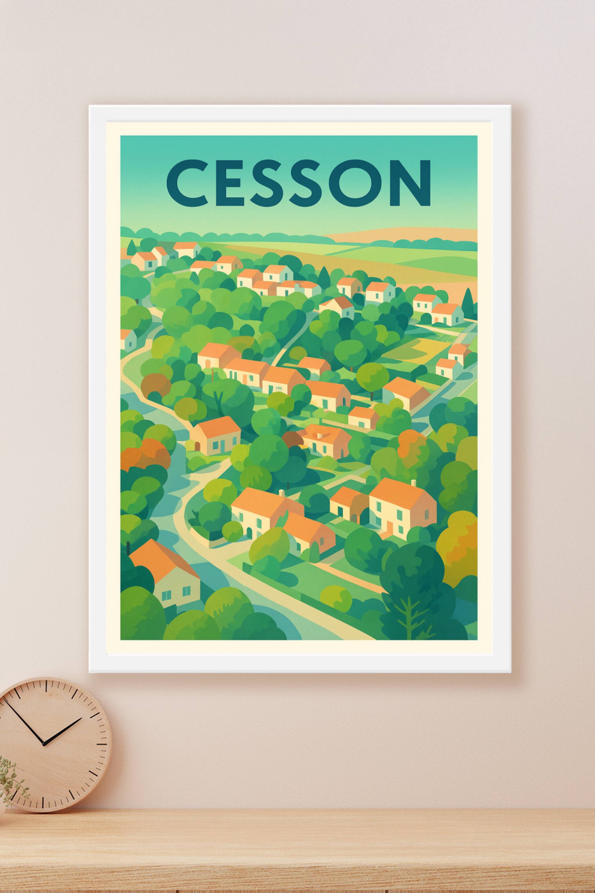 Découvrez l'atmosphère douce et apaisante de Cesson à travers cette affiche illustrée, représentant un village verdoyant aux maisons à toitures ora...