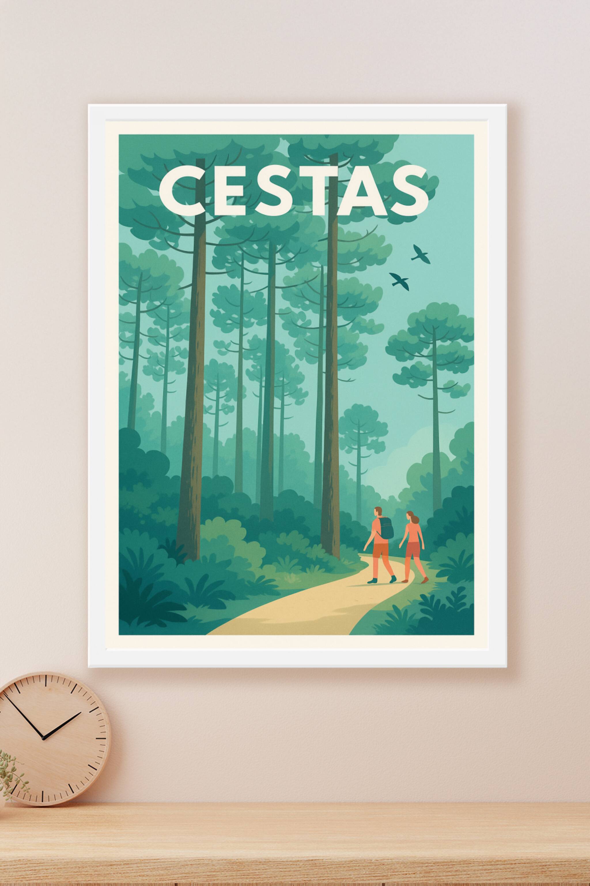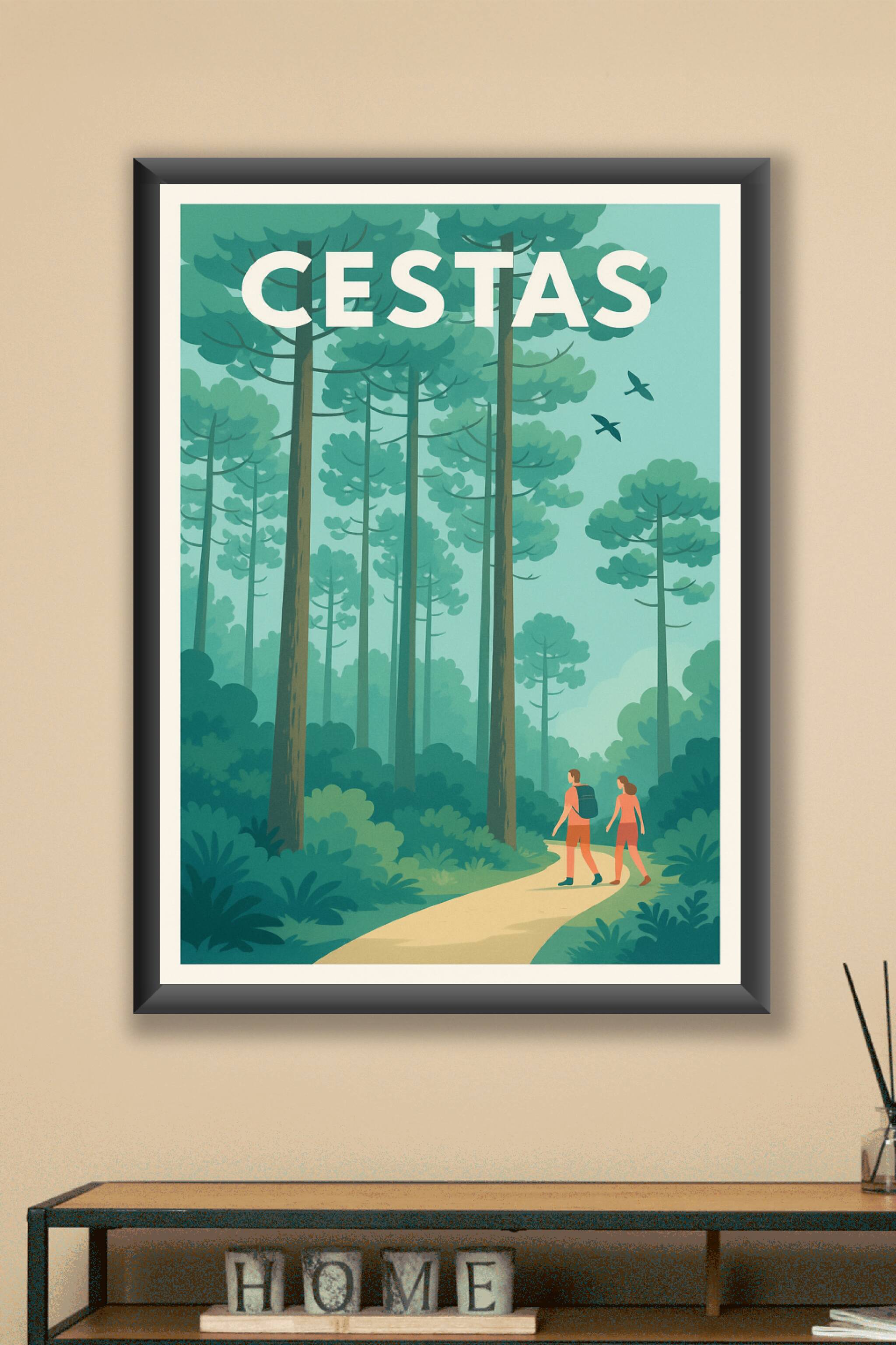 Découvrez la sérénité des forêts de Cestas à travers cette magnifique affiche vintage qui capture l'essence d'une promenade en pleine nature. Ce po...