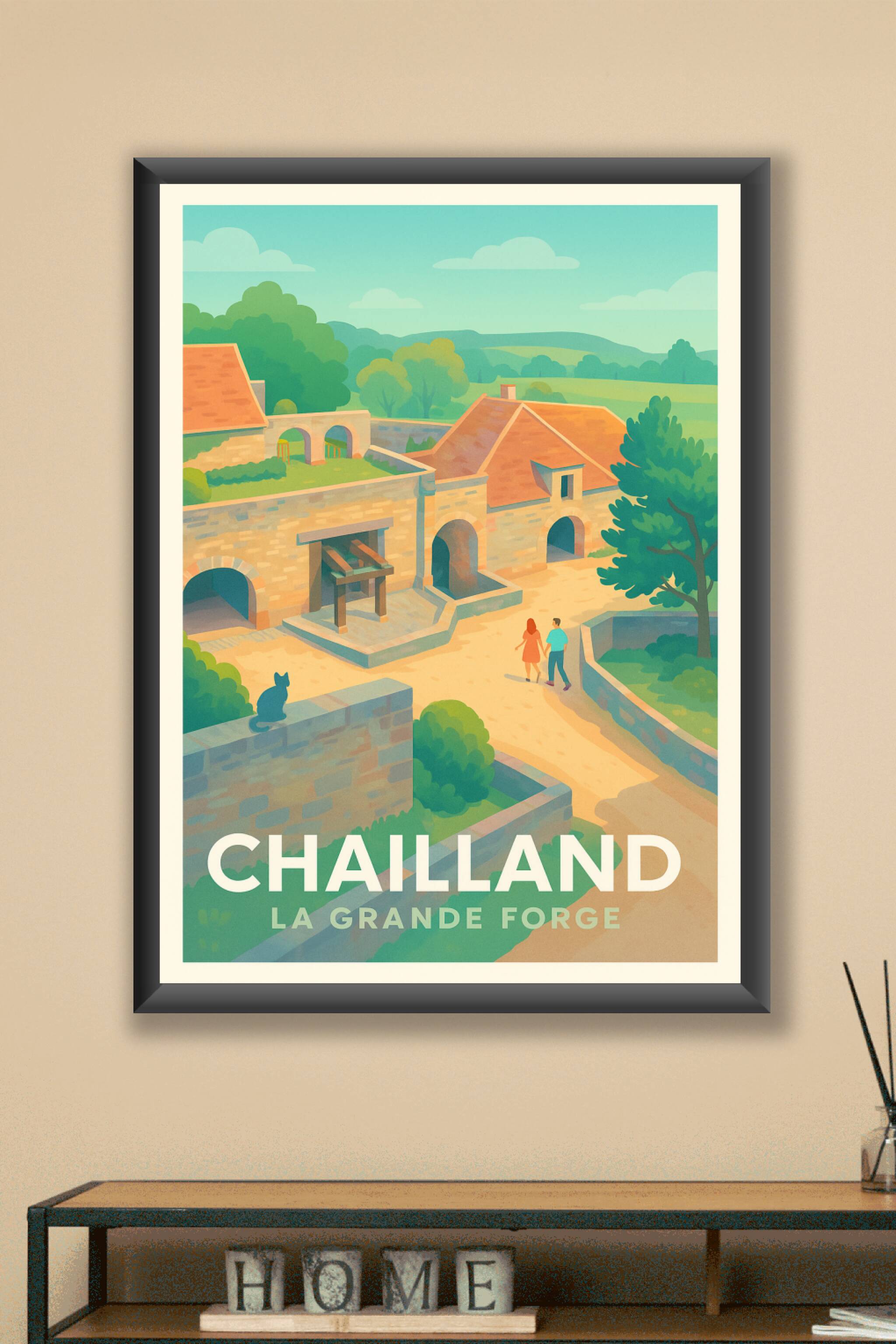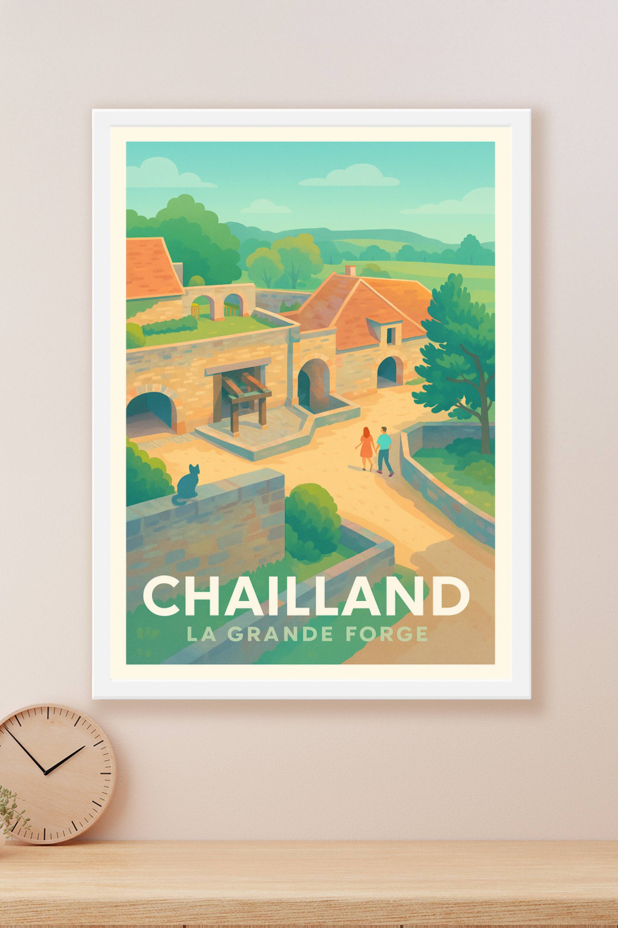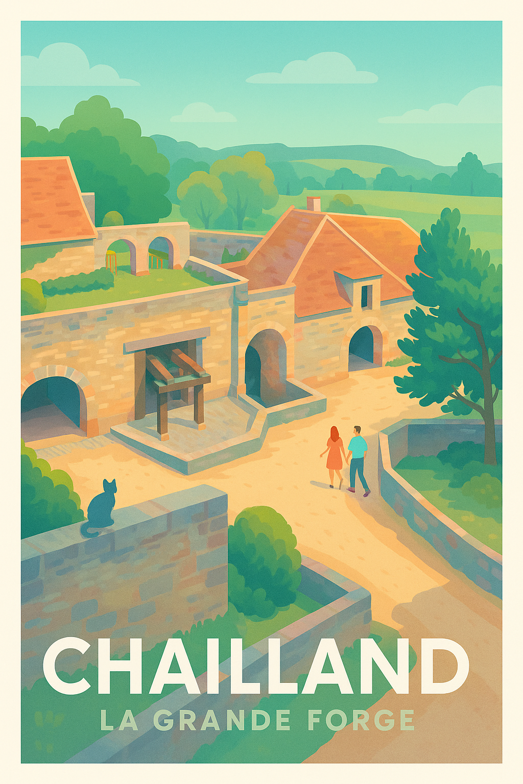 Découvrez l'élégance rustique de Chailland à travers cette affiche illustrée mettant en scène la célèbre Grande Forge et son cadre historique. Ce p...