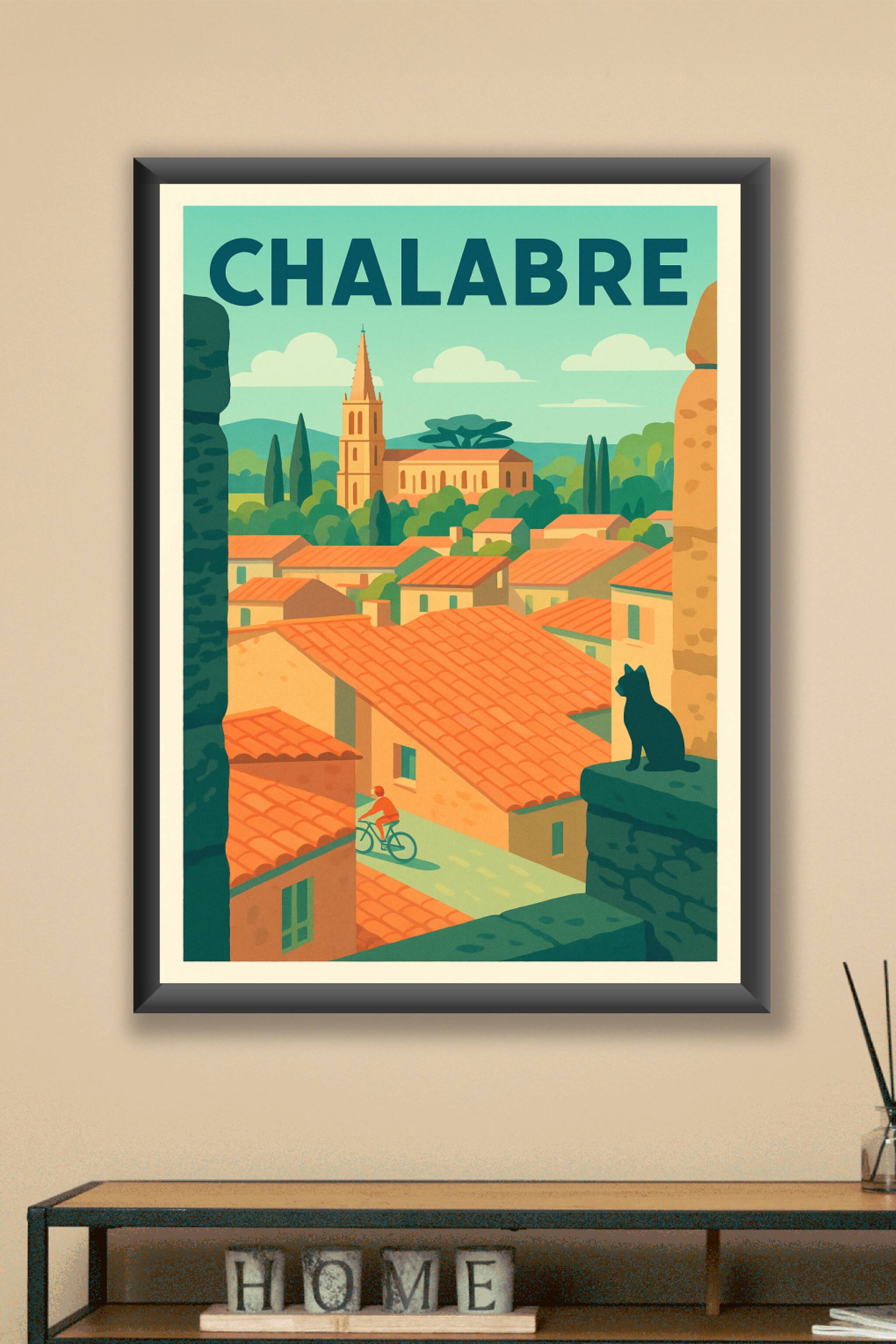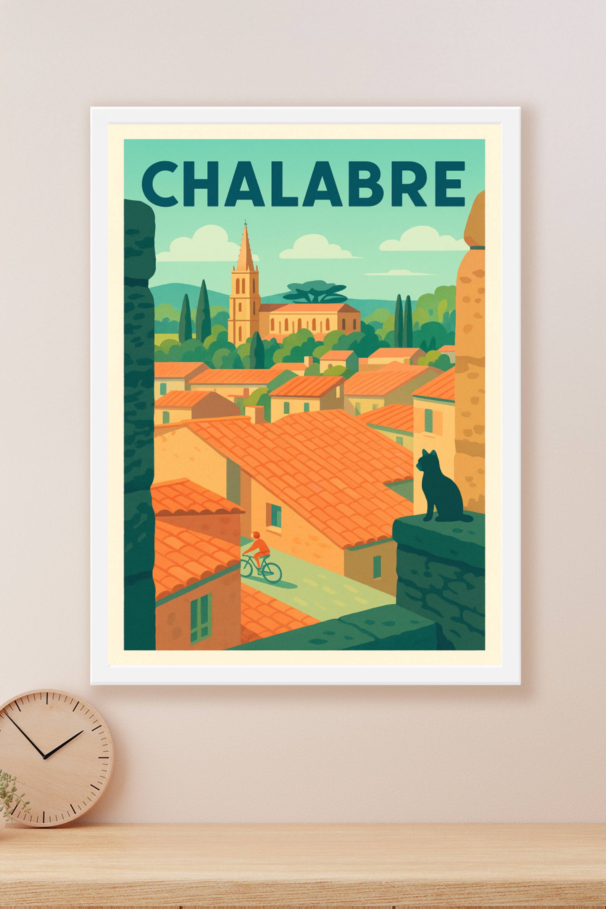 Découvrez l'élégance intemporelle de Chalabre à travers cette affiche au style rétro, mettant en lumière les toits de tuiles orangées, les ruelles paisibles et le clocher emblématique niché au cœur de la nature verdoyante. Cette scène apaisante est sublimée par un chat observateur et un cycliste circulant tranquillement, symboles du rythme doux de la vie locale.Ce poster est imprimé en tirage "Fine Art" sur un papier de qualité supérieure 305g coton, garantissant une profondeur des couleurs et une durabilité hors pair. Disponible en formats A1 à A4, avec ou sans cadre, cette affiche est idéale pour apporter une touche d'authenticité et de charme méridional à votre intérieur ou pour offrir un souvenir élégant de Chalabre.Profitez d'une impression premium, 100% française, qui fera de cette création un élément central de votre décoration.