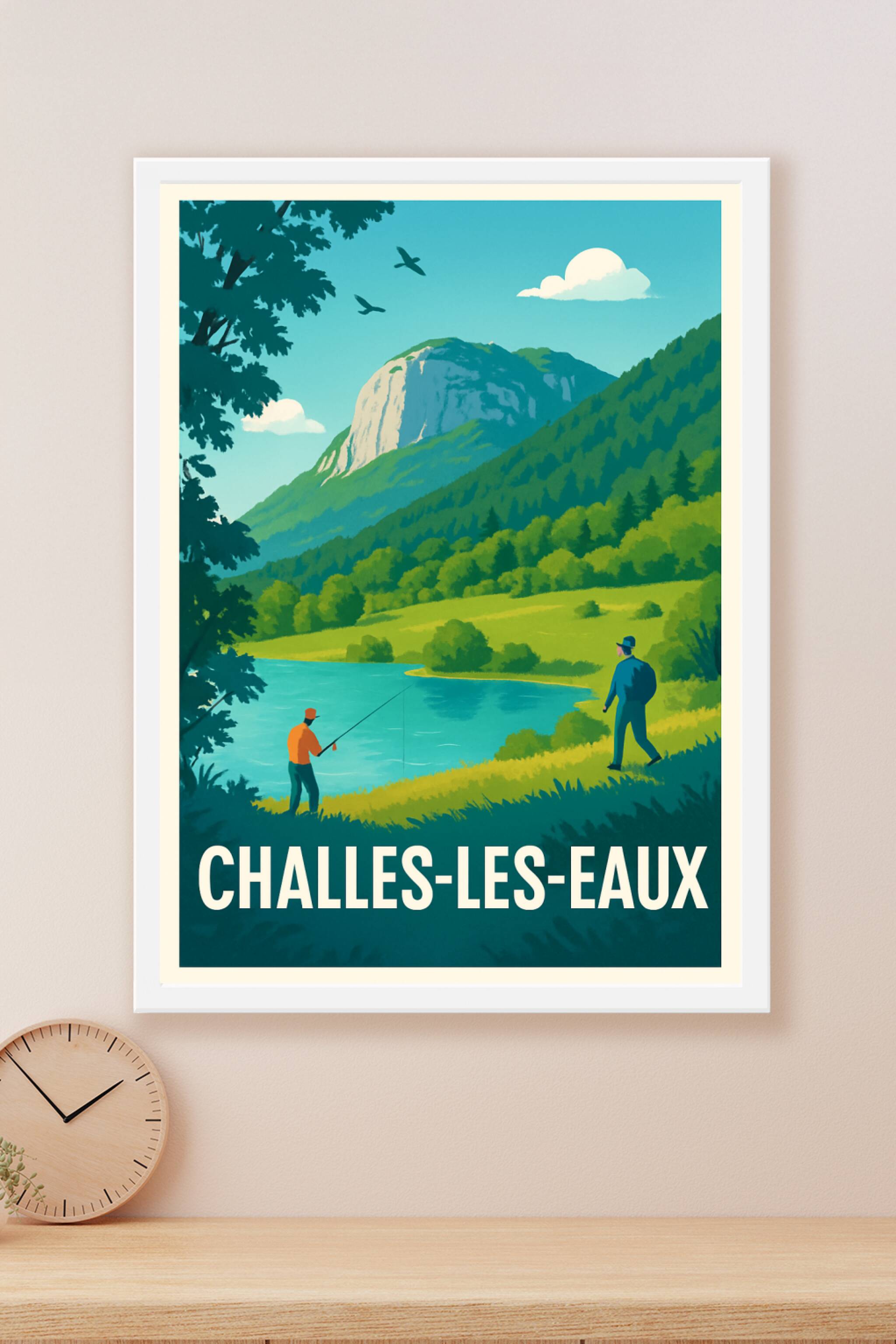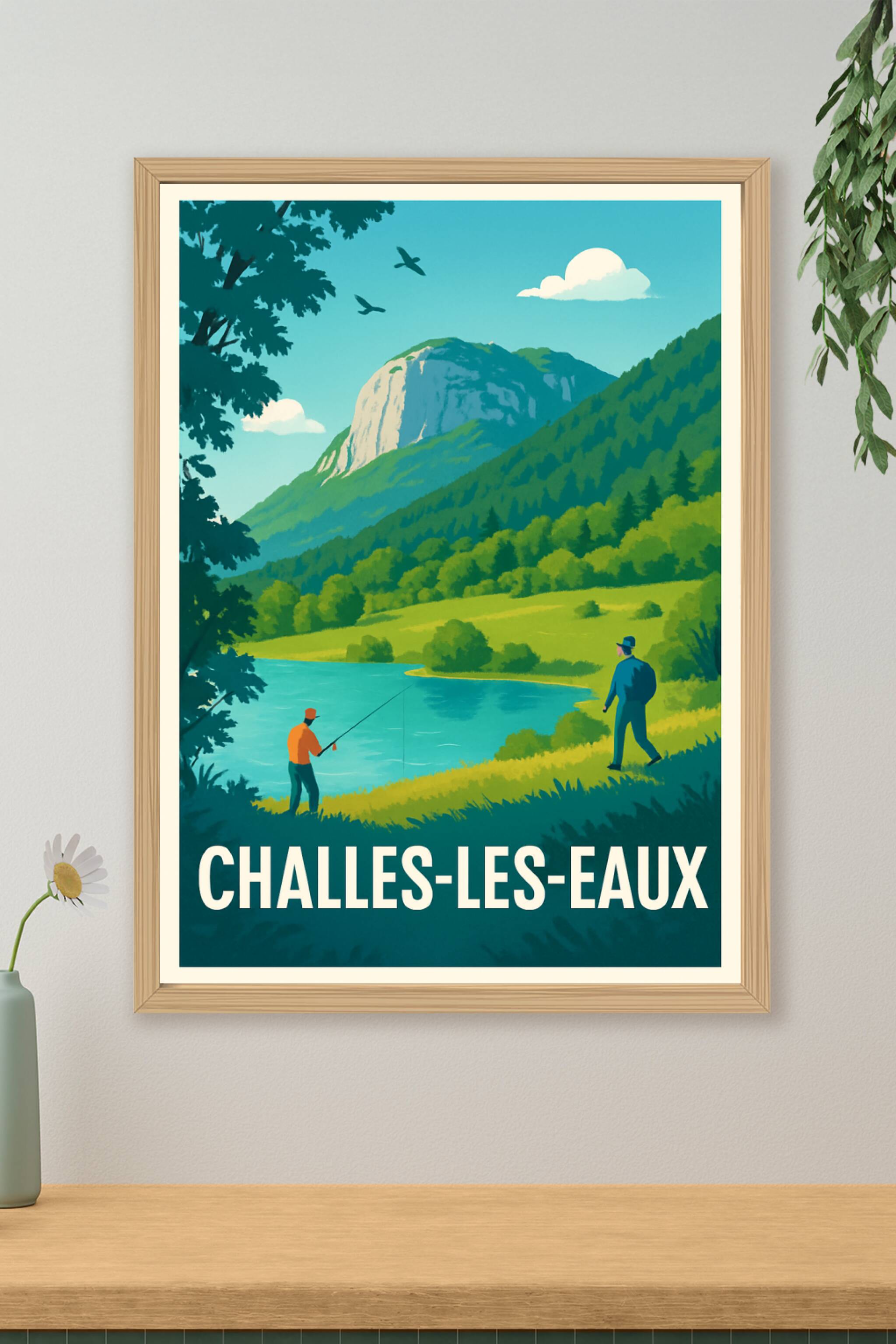 Découvrez la sérénité de Challes-les-Eaux avec cette affiche illustrée représentant une scène paisible au bord d’un lac, entourée de montagnes et d...
