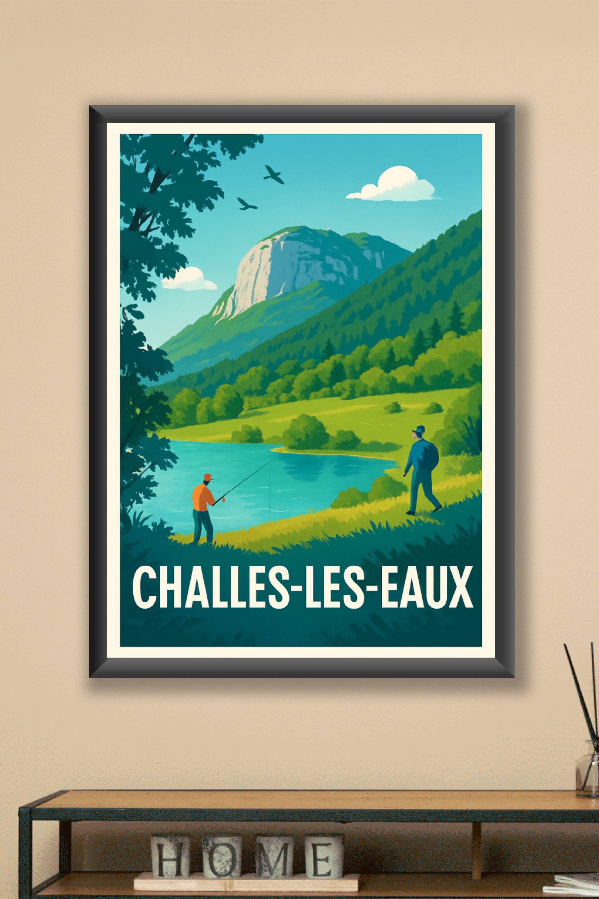 Découvrez la sérénité de Challes-les-Eaux avec cette affiche illustrée représentant une scène paisible au bord d’un lac, entourée de montagnes et de verdure luxuriante. Parfaite pour apporter une touche de fraîcheur et de calme à votre intérieur, ce poster est imprimé en tirage « Fine Art » sur un papier 305g coton d’une qualité exceptionnelle, garantissant des couleurs vives et une grande finesse de détails. Disponible en formats A1 à A4, avec ou sans cadre, cette affiche s’adapte à tous vos projets déco. Profitez d’une impression premium 100% fabriquée en France pour embellir votre maison ou offrir un souvenir authentique de Challes-les-Eaux.