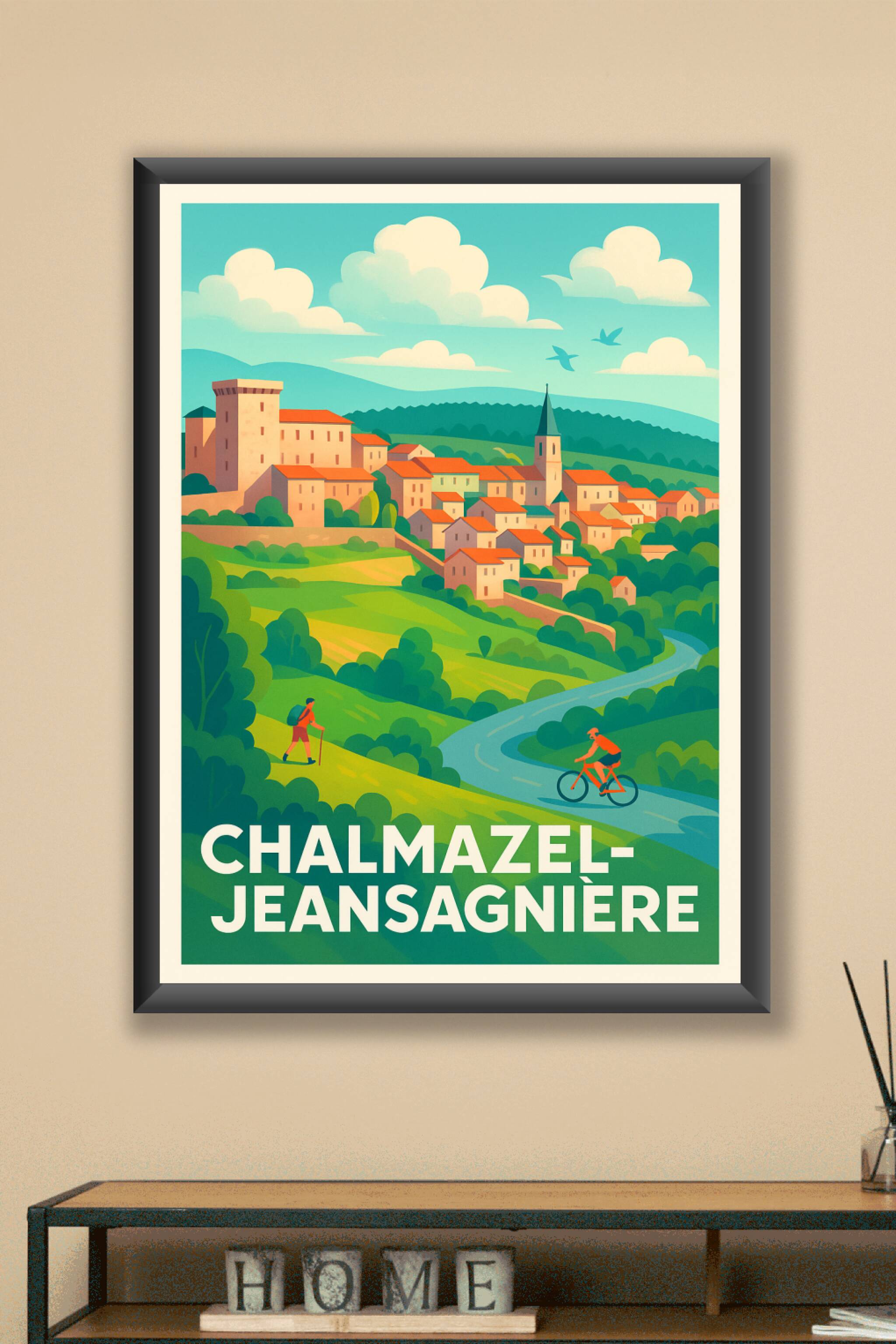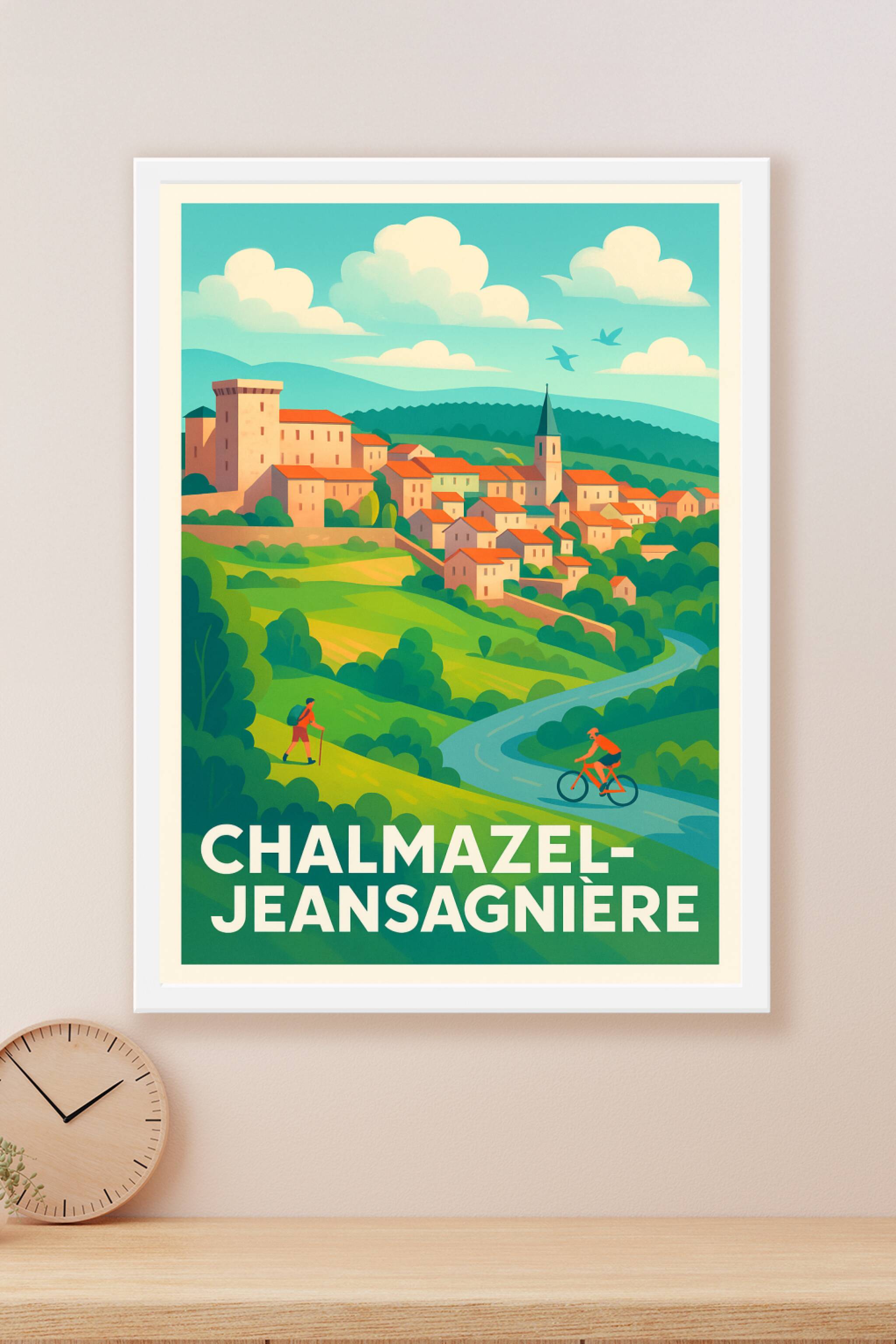 Découvrez le charme bucolique de Chalmazel-Jeansagnière avec cette affiche illustrée aux couleurs vives et apaisantes. Ce poster met en scène un vi...