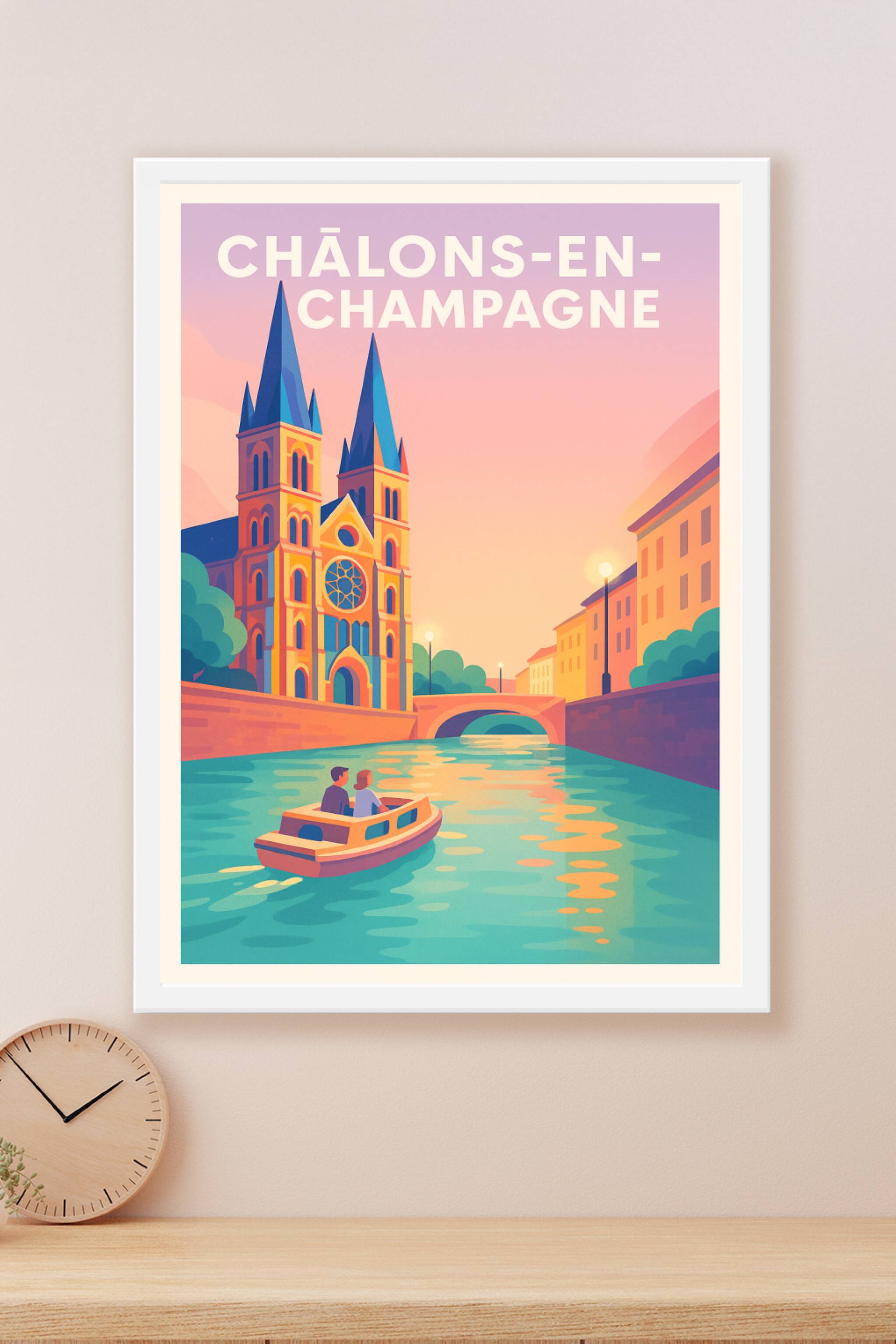 Découvrez la magie de Châlons-en-Champagne à travers cette affiche au style vintage et aux couleurs chaleureuses. Illustrant une promenade en batea...