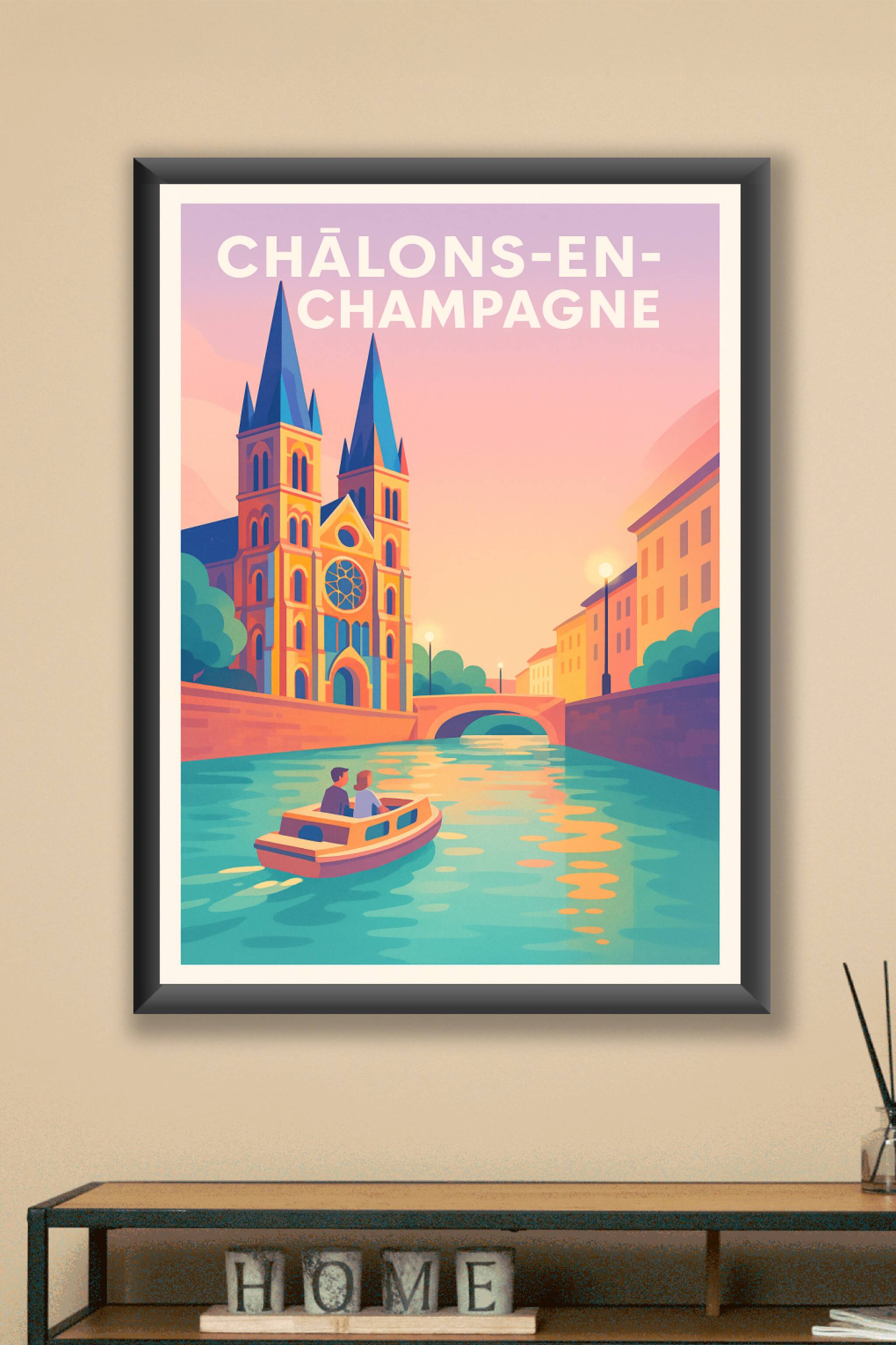 Découvrez la magie de Châlons-en-Champagne à travers cette affiche au style vintage et aux couleurs chaleureuses. Illustrant une promenade en bateau sur les canaux entourés de l'architecture emblématique de la ville, ce poster invite à la détente et au rêve. Imprimée en tirage 'Fine Art' sur papier 305g coton, cette affiche offre une qualité d'impression exceptionnelle, fidèle et durable. Disponible en formats A1 à A4, avec ou sans cadre, elle saura embellir votre intérieur ou devenir un cadeau parfait pour les amoureux de la Champagne. Profitez d'une impression premium 100% fabriquée en France pour une décoration élégante et raffinée.