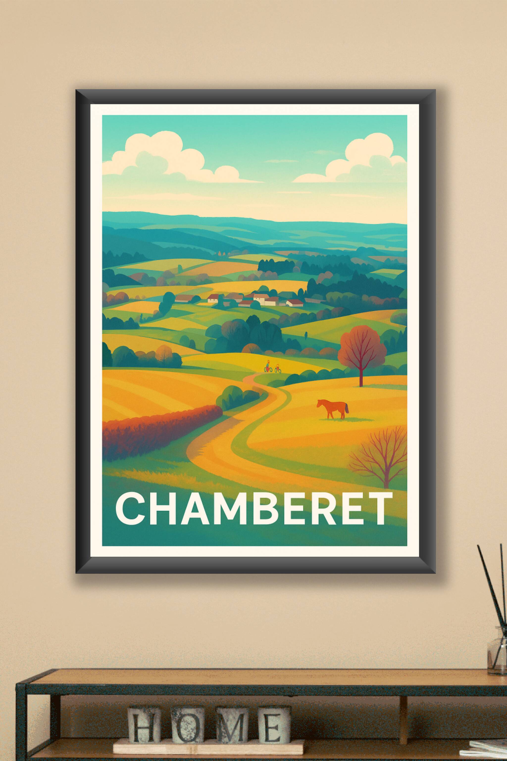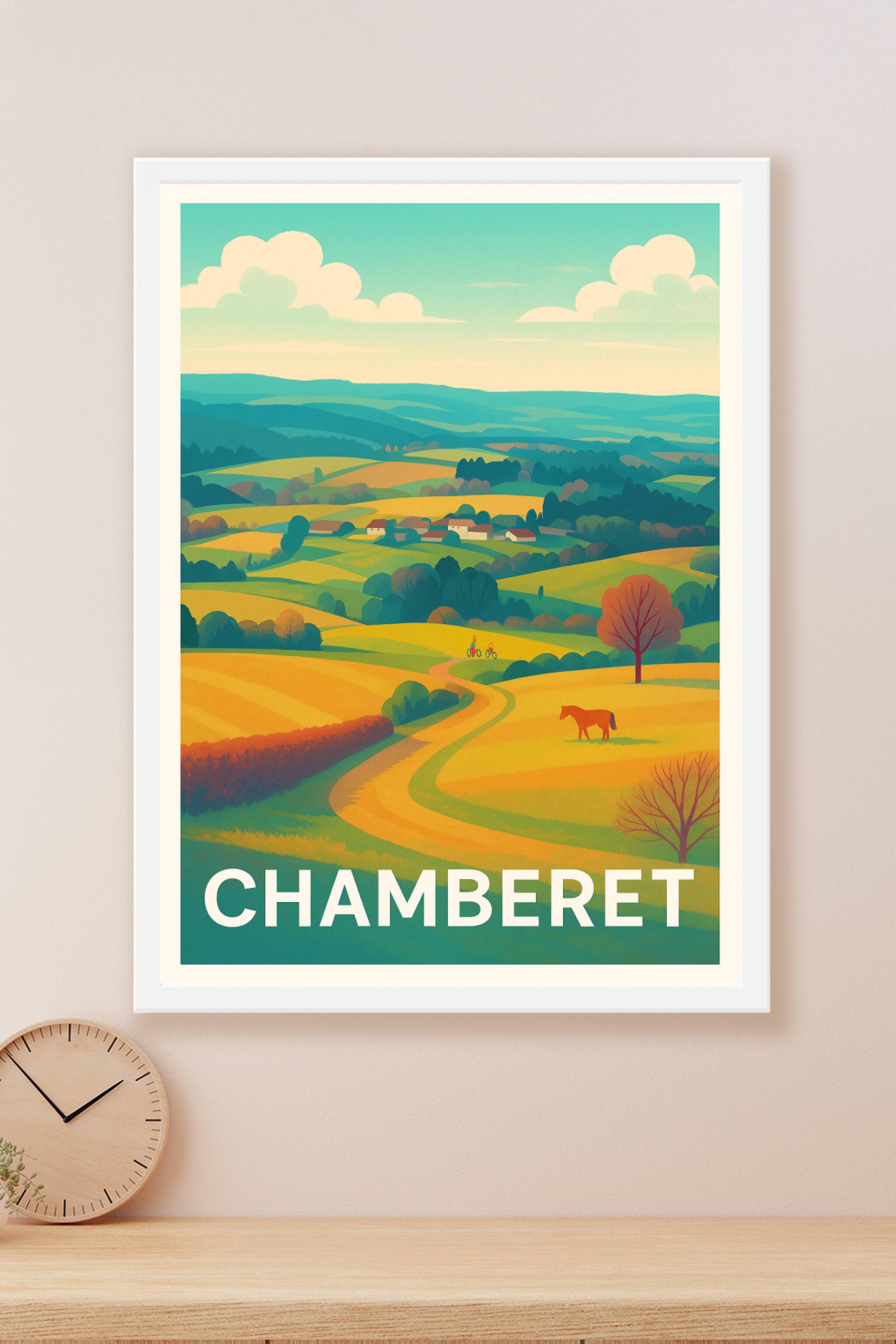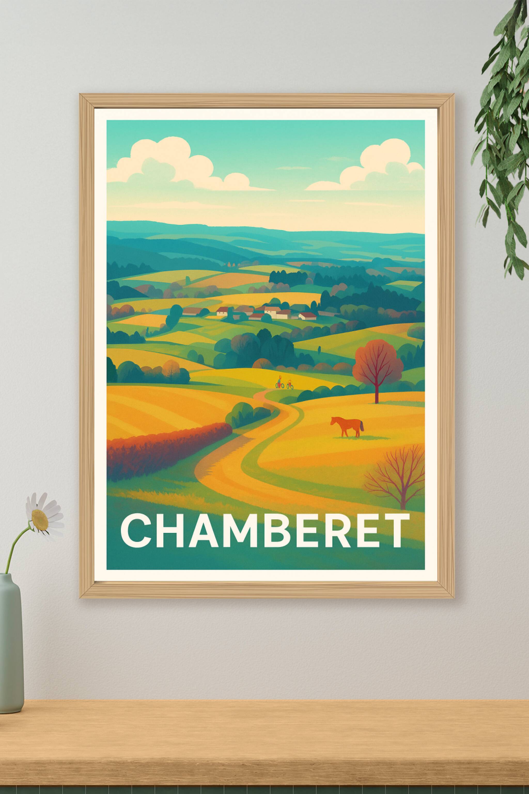 Découvrez la beauté apaisante des paysages de Chamberet à travers cette affiche illustrée aux couleurs chaudes et harmonieuses. Ce poster met en sc...