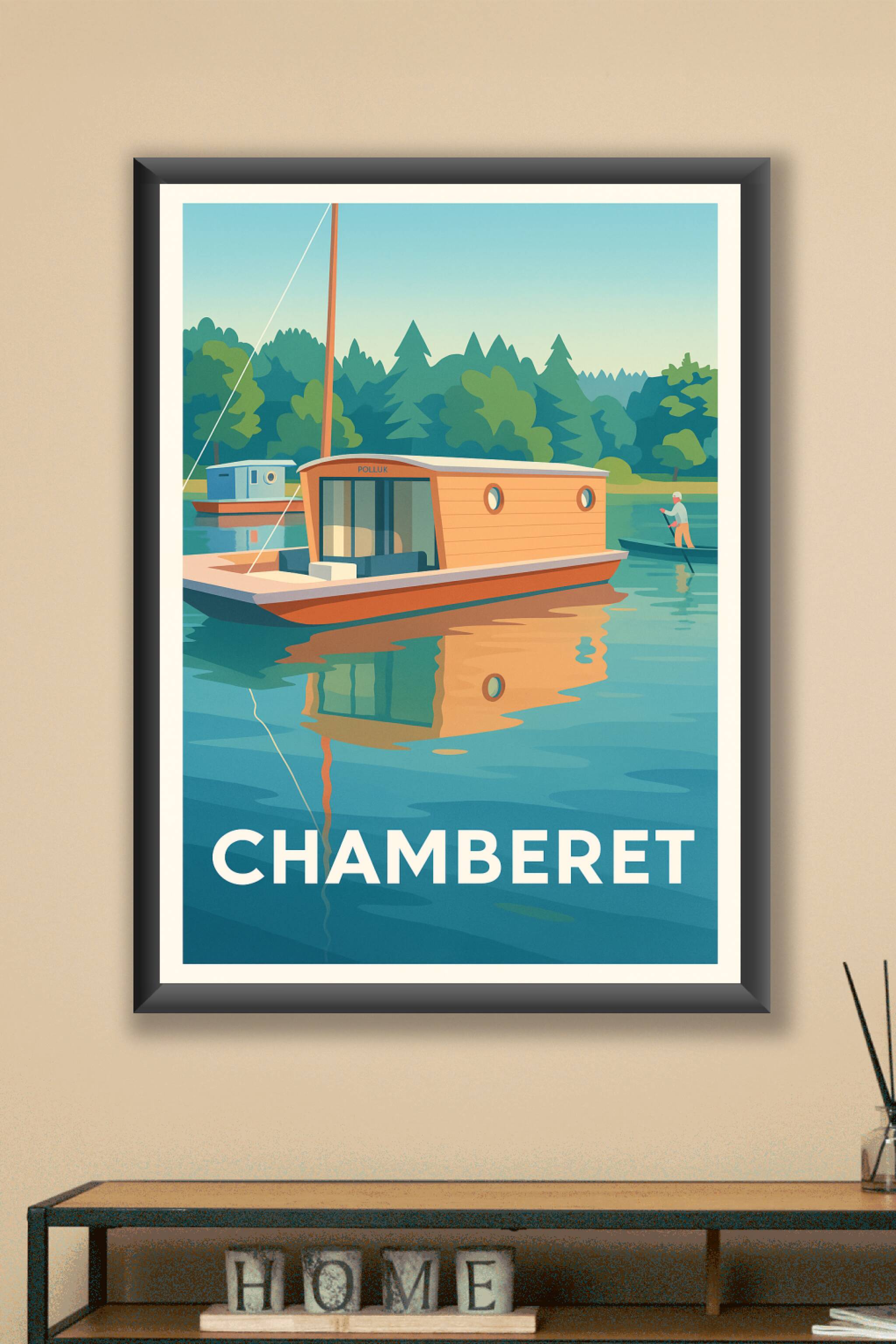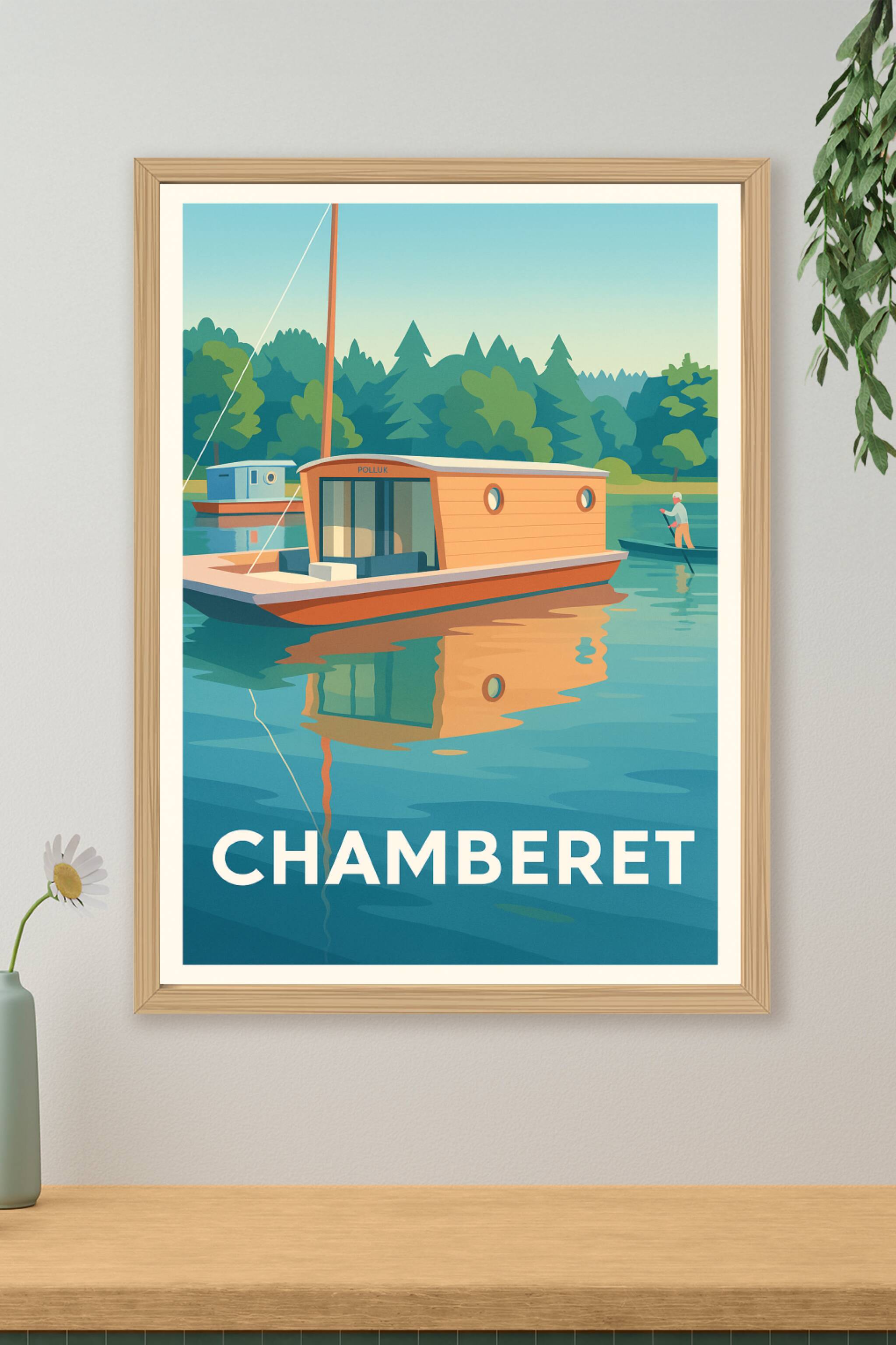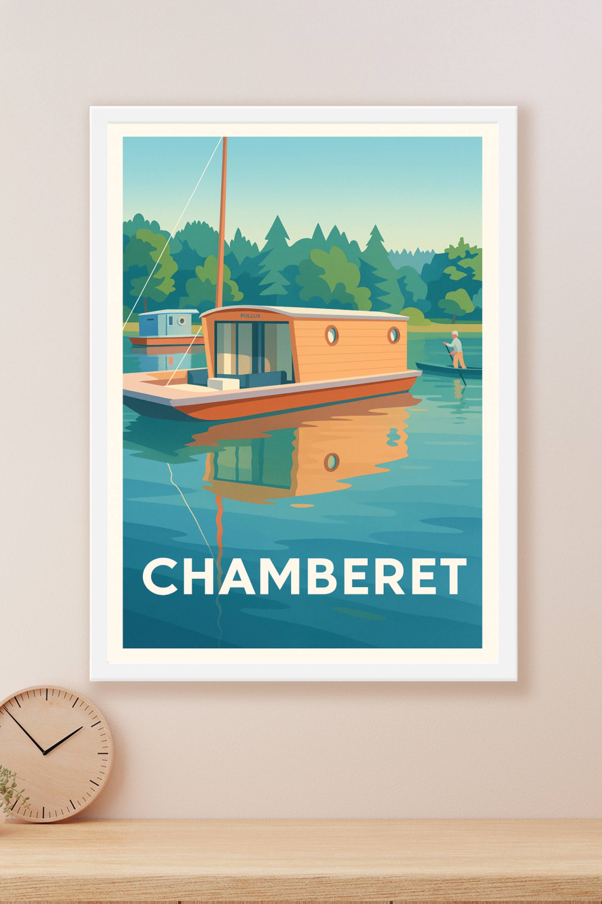 Découvrez la douceur paisible de Chamberet avec cette affiche illustrée mettant en scène une péniche colorée flottant sur les eaux calmes, entourée...