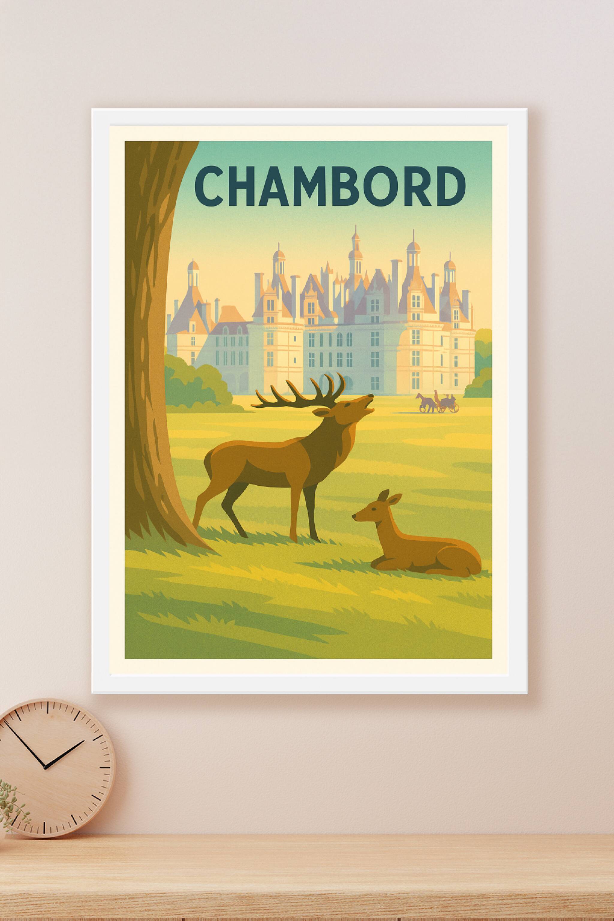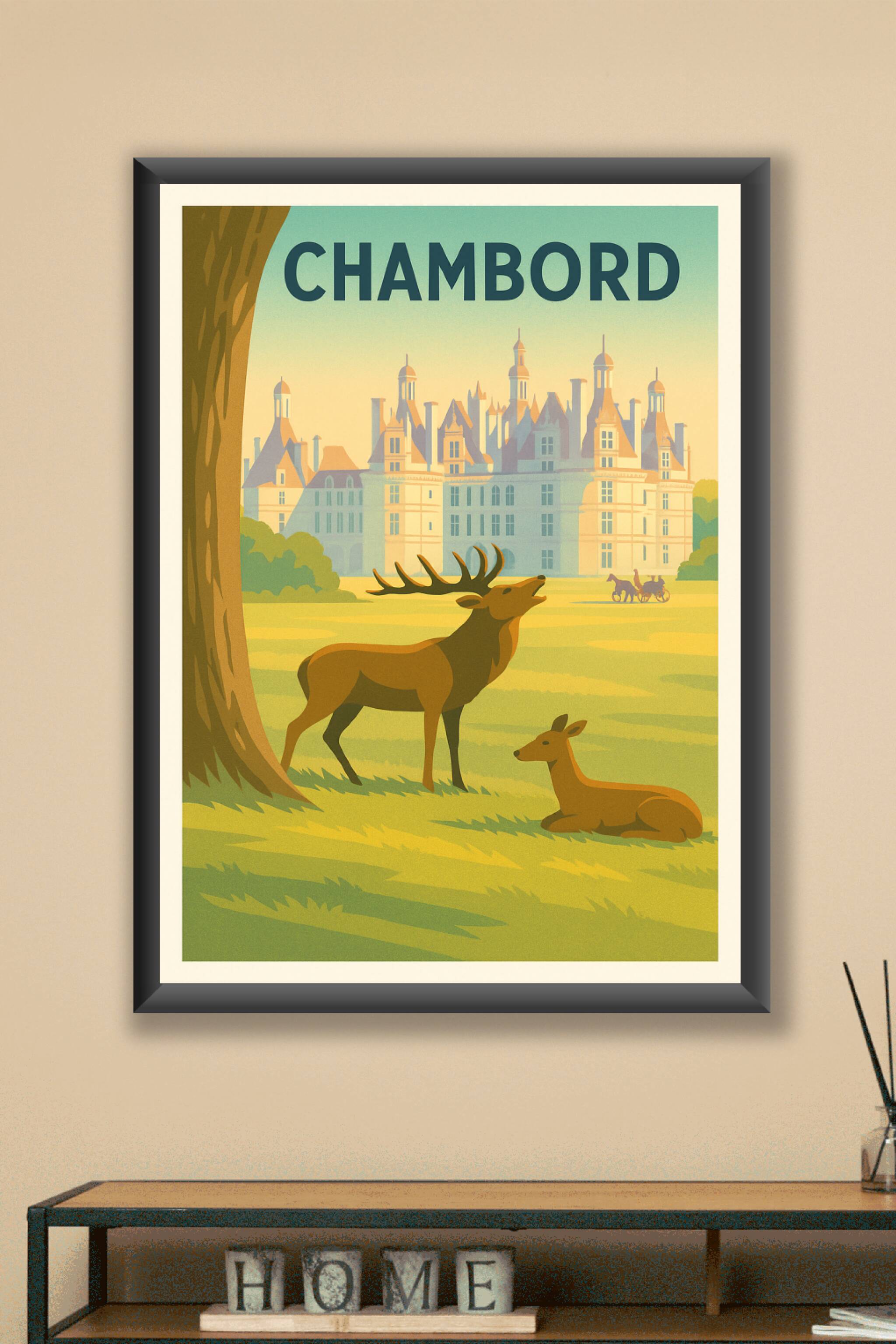 Redécouvrez le charme intemporel du Château de Chambord avec cette affiche au style vintage évoquant la majesté des lieux et la beauté de la nature...