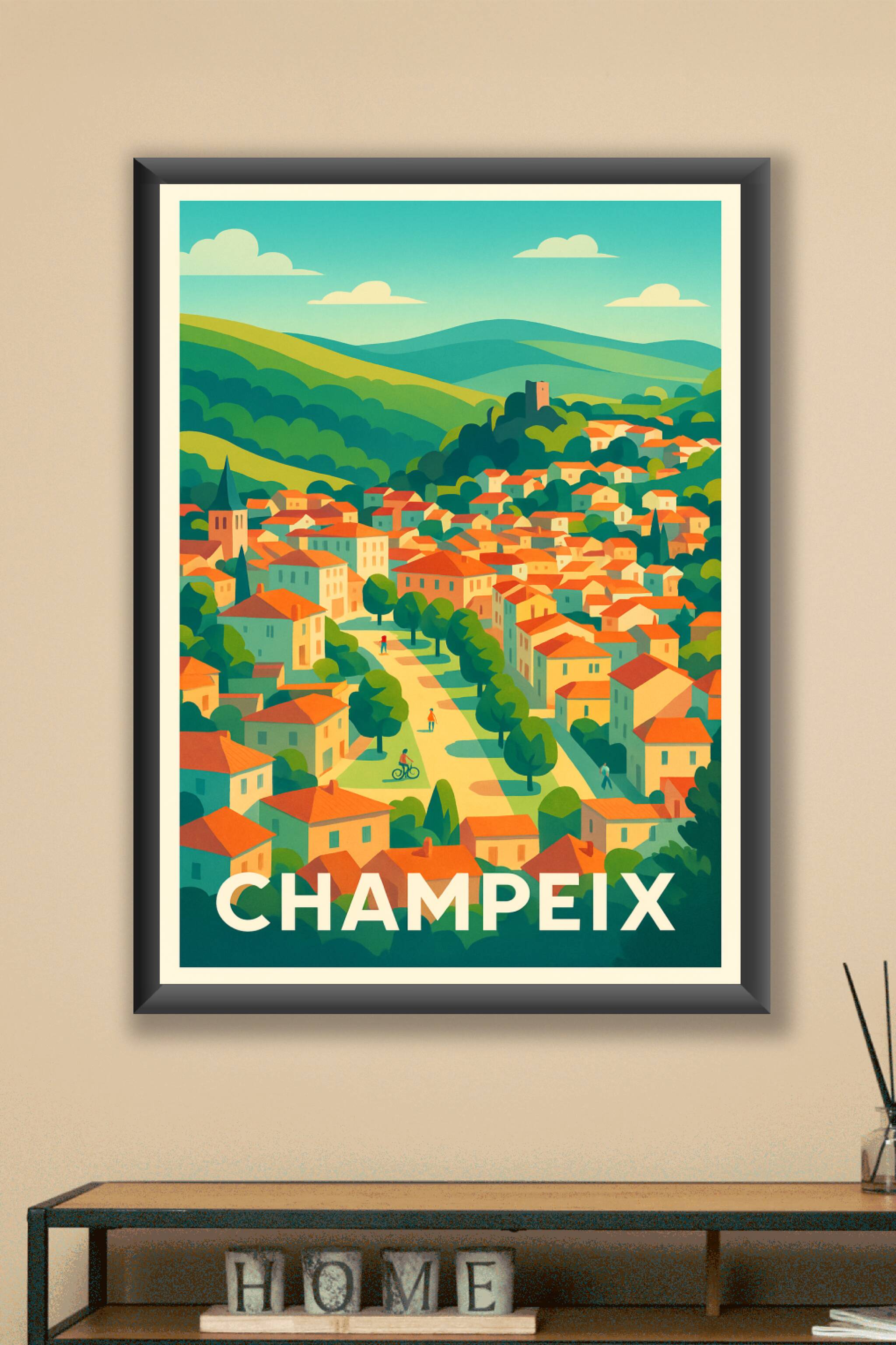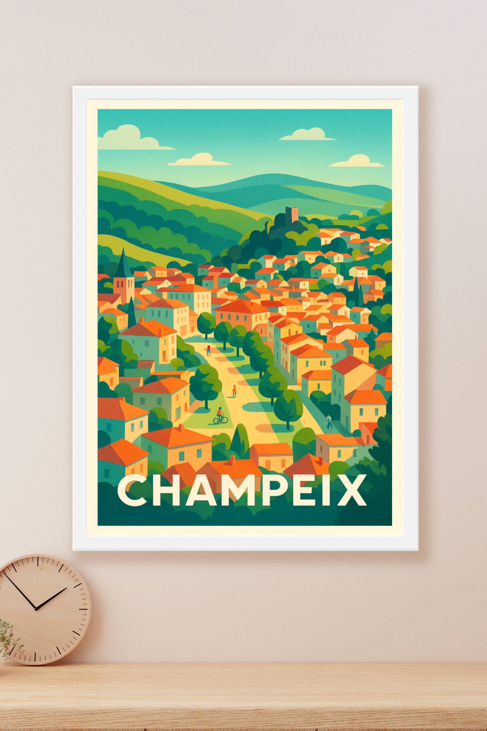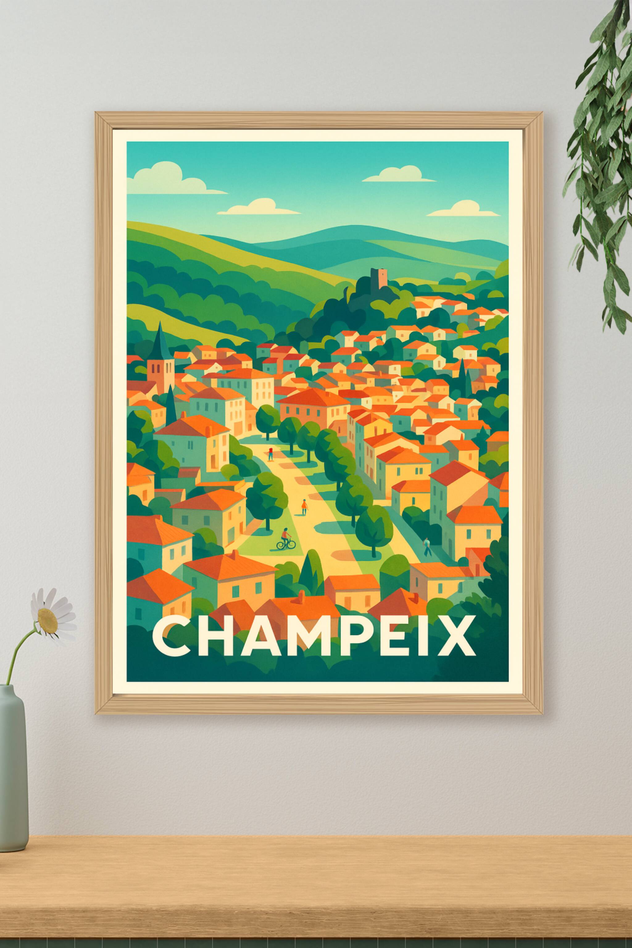 Découvrez l'ambiance paisible et colorée de Champeix avec cette affiche illustrée qui met en valeur le village niché au creux des collines verdoyan...