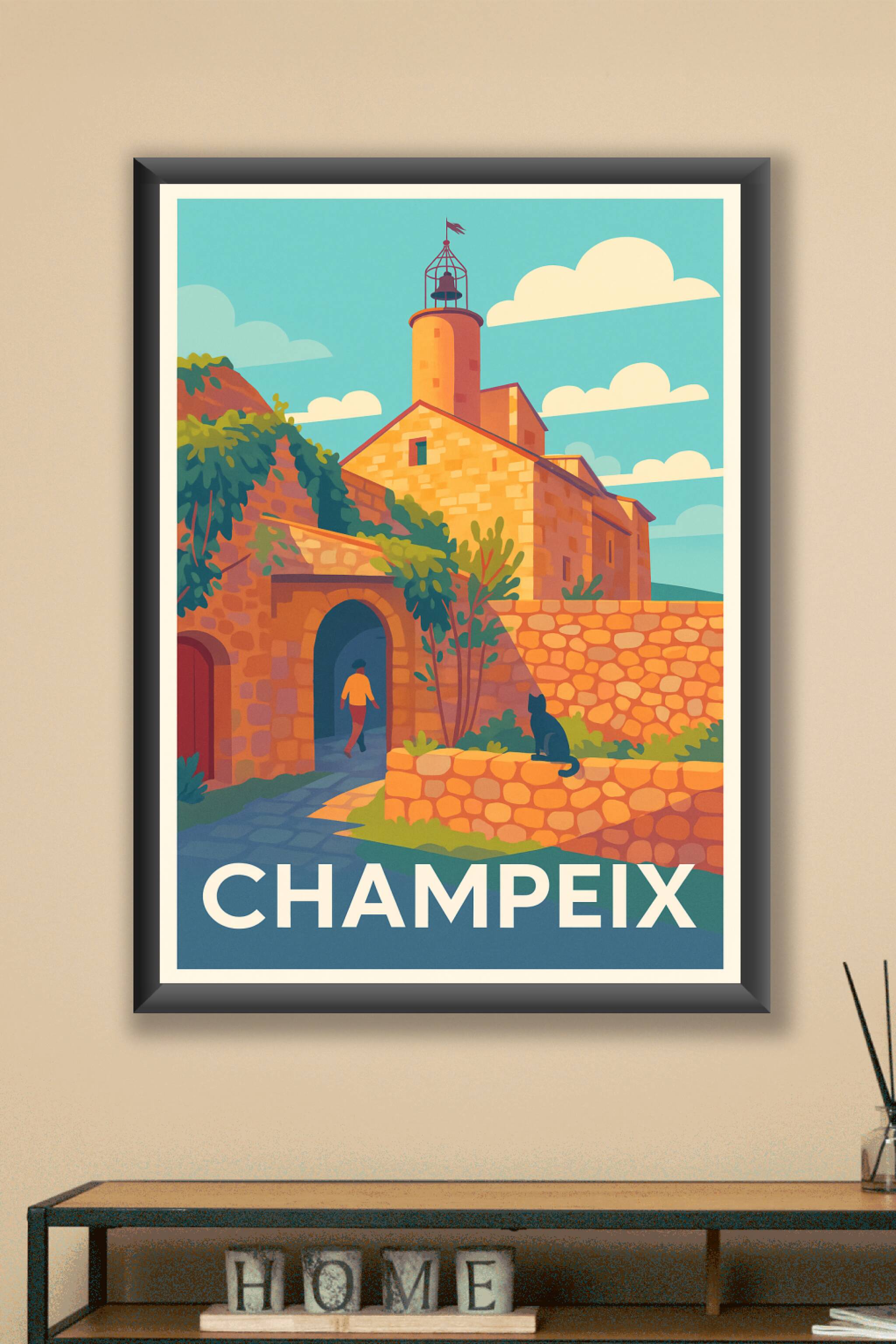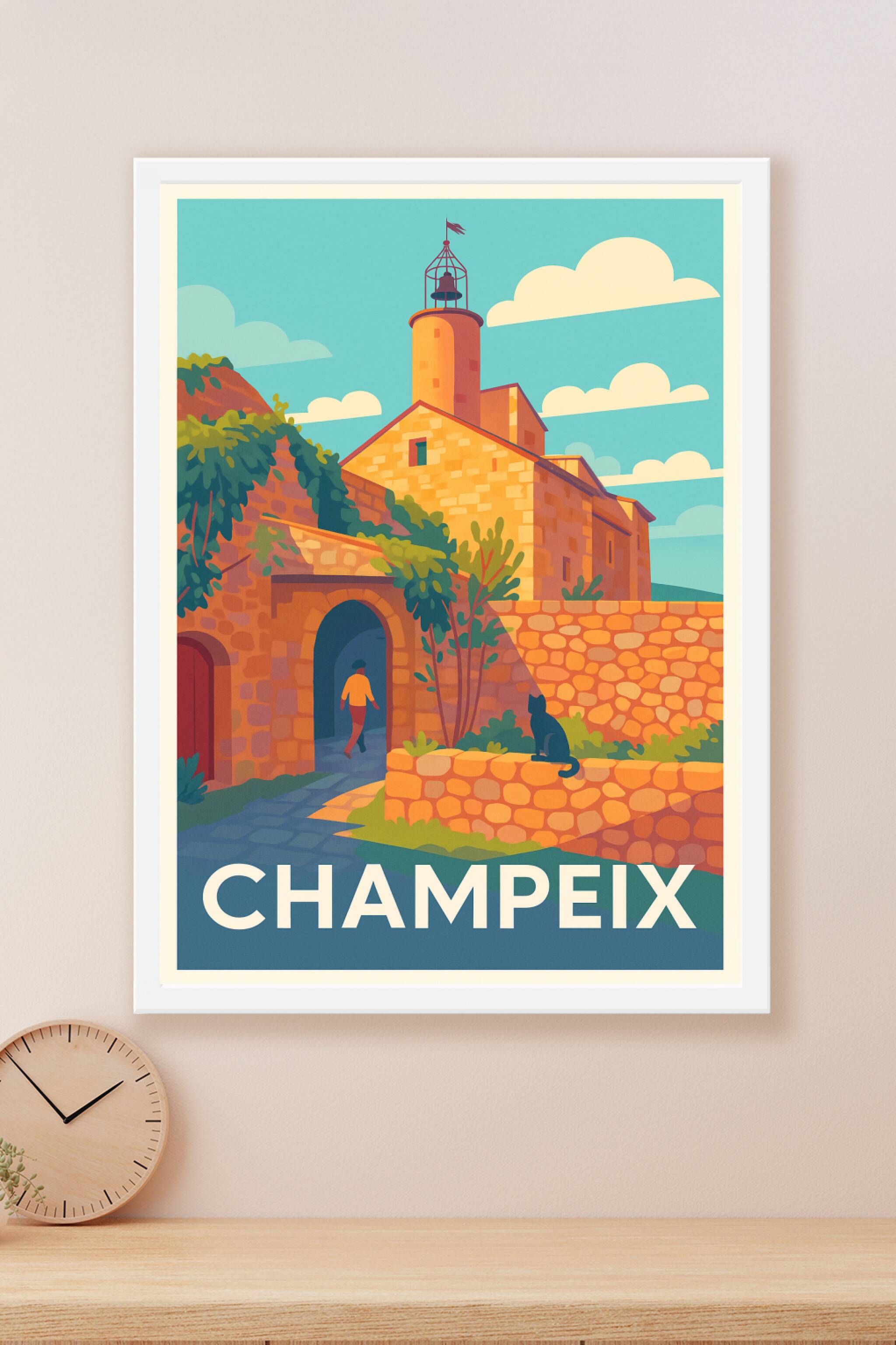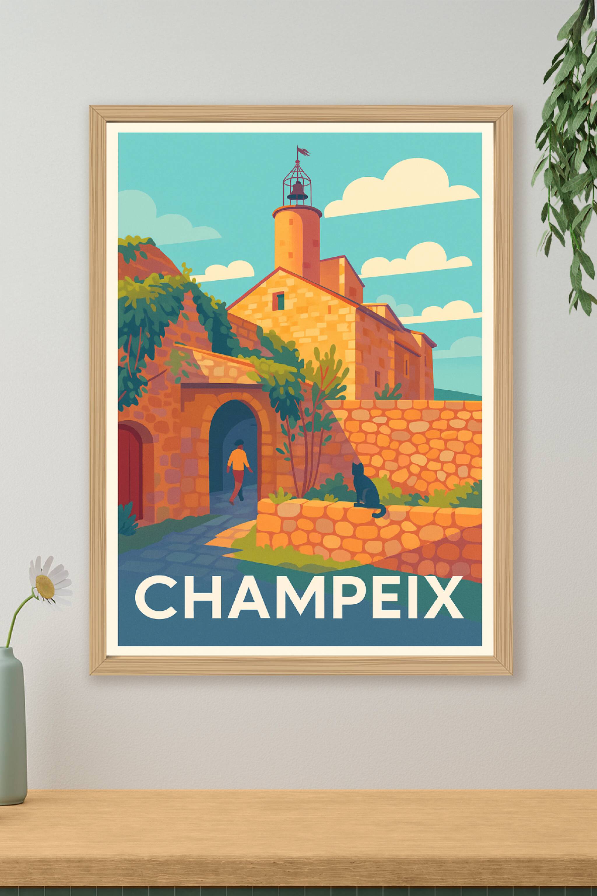 Découvrez la beauté intemporelle de Champeix avec cette affiche illustrée, qui capture l'architecture médiévale et l'atmosphère paisible de cette v...