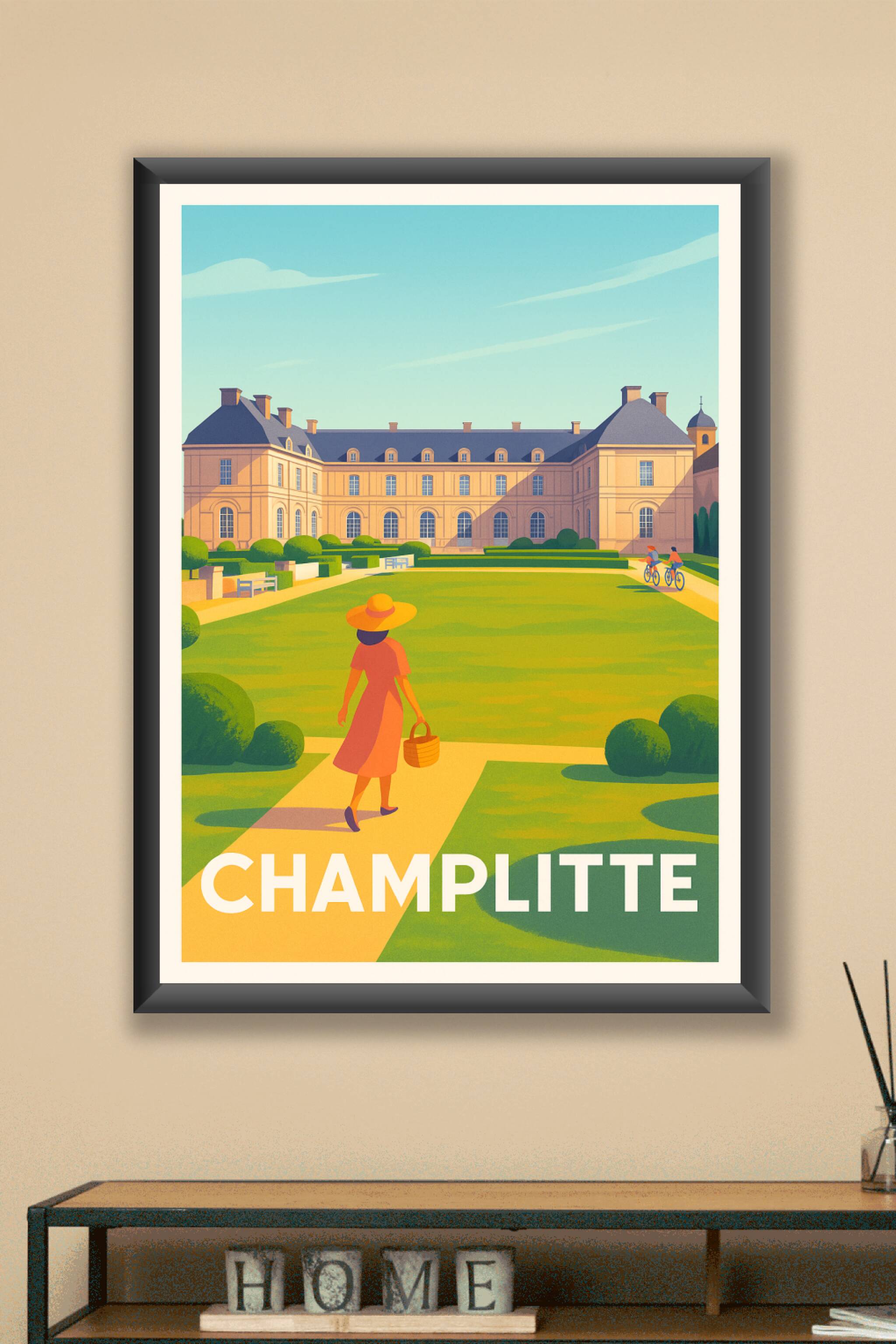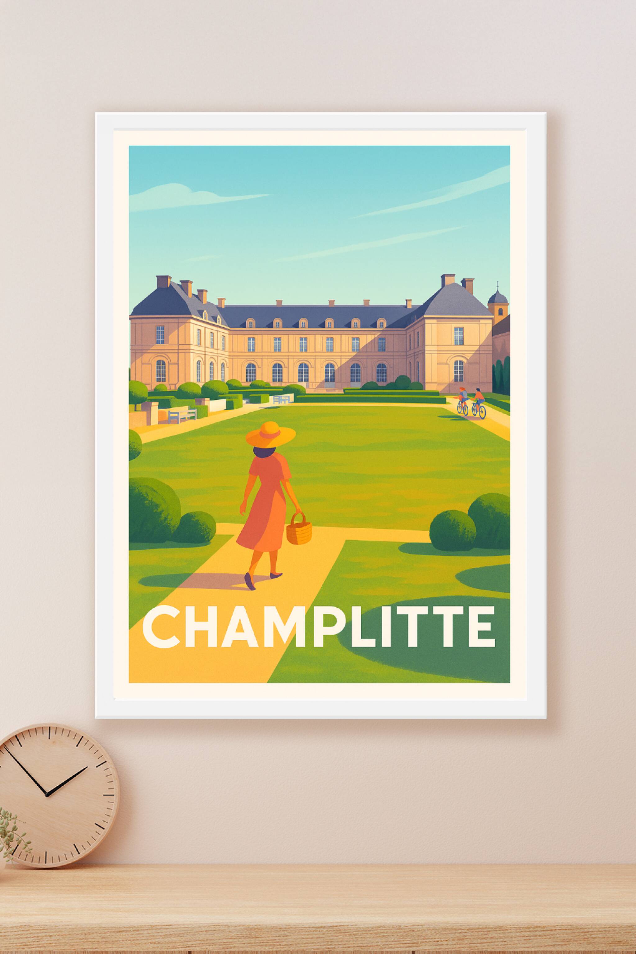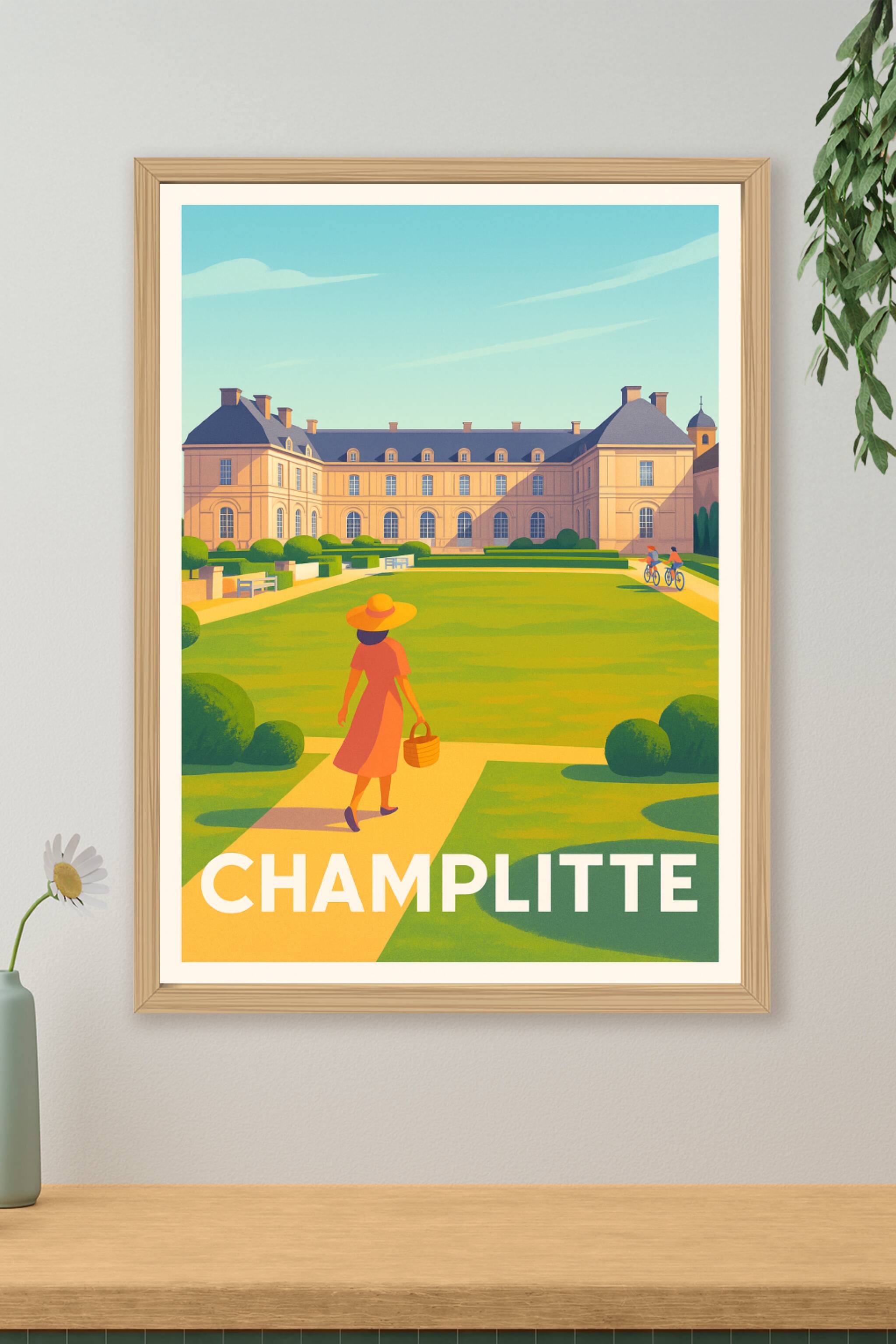 Découvrez la douceur de vivre à Champlitte avec cette affiche illustrée, mettant en scène le charme intemporel du domaine et ses jardins soignés ba...