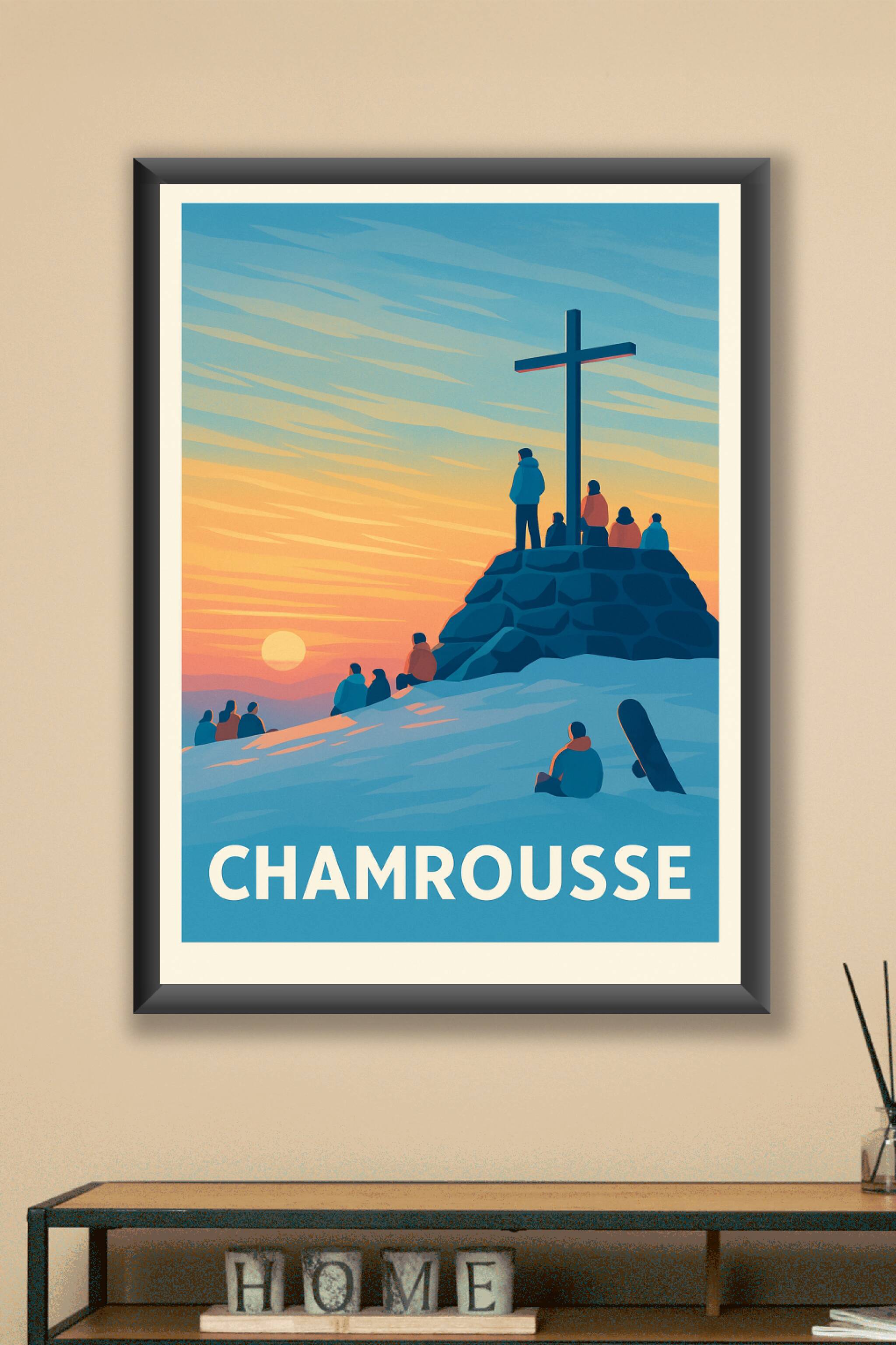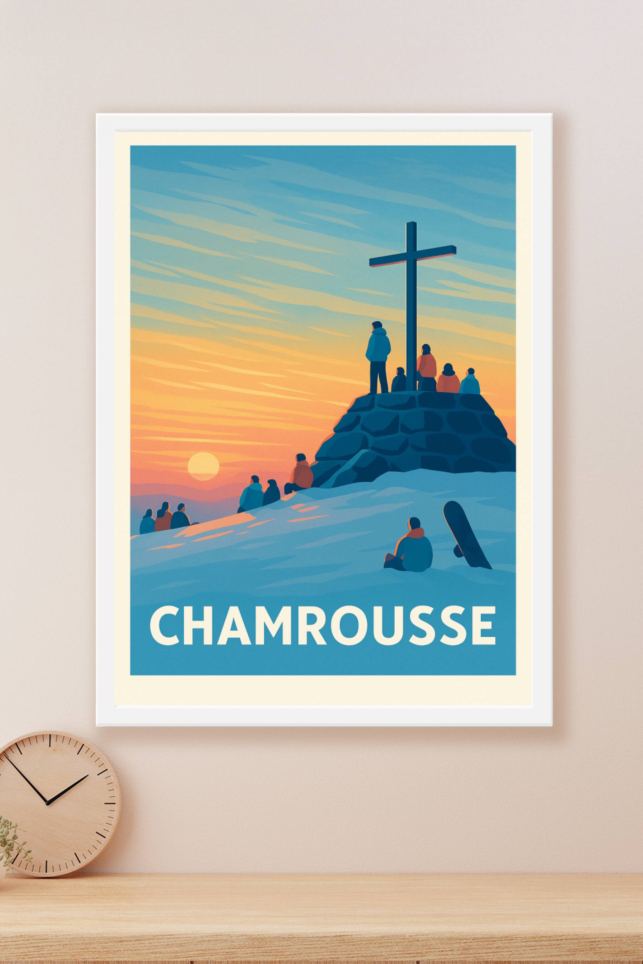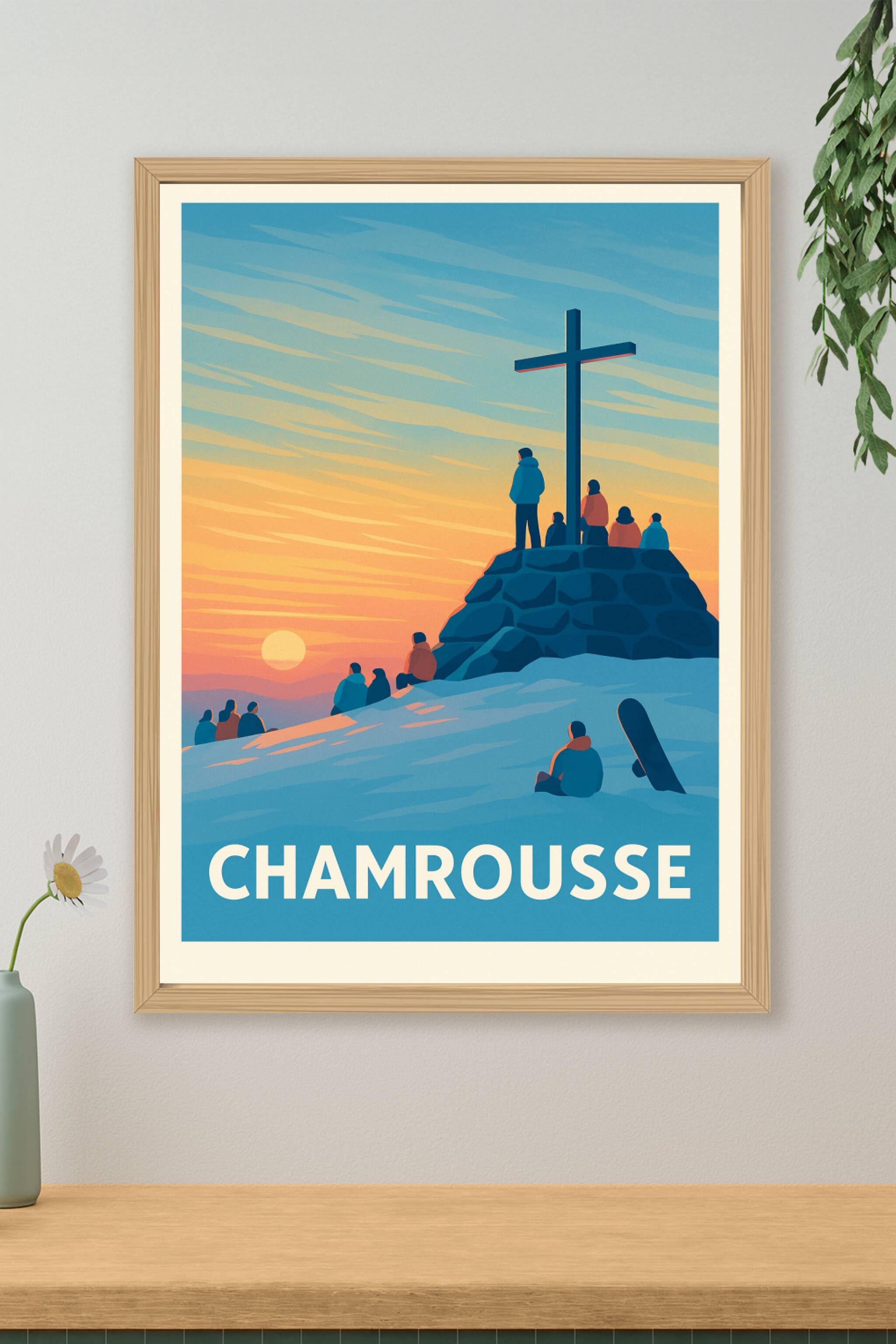 Découvrez l'atmosphère paisible et majestueuse de Chamrousse avec cette affiche illustrant un groupe de personnes admirant un coucher de soleil depuis le sommet enneigé, marqué par une grande croix. Ce poster aux couleurs douces et harmonieuses apporte une touche nature et sérénité à votre décoration intérieure. Imprimée en tirage "Fine Art" sur papier 305g coton, cette affiche garantit une qualité d'impression exceptionnelle et une durabilité optimale. Disponible en formats A1 à A4, avec ou sans cadre, elle s'adapte parfaitement à tous vos espaces, que ce soit pour embellir votre salon, bureau ou chambre. Offrez-vous une immersion au cœur des Alpes avec ce poster de qualité premium, 100% fabriqué en France.