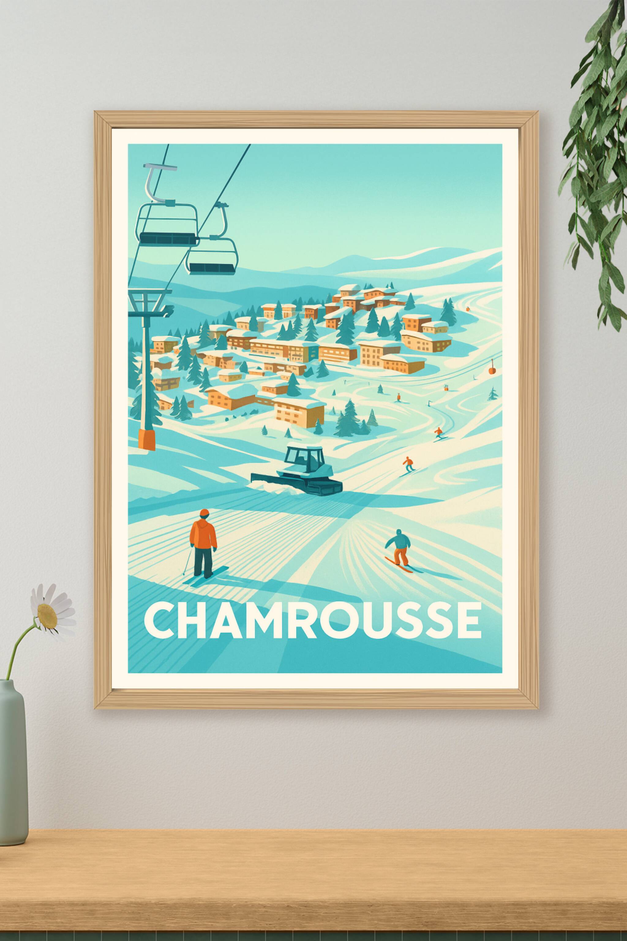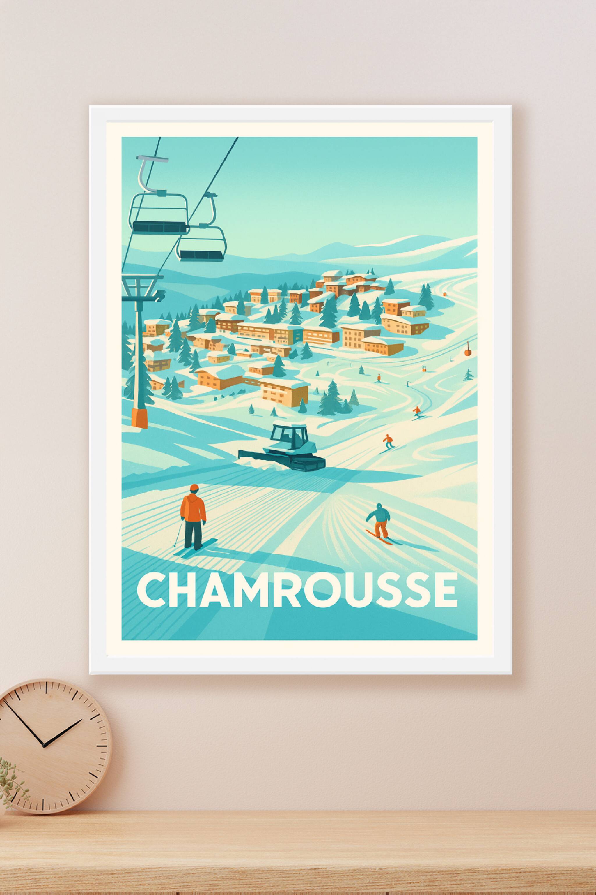 Découvrez l'ambiance vibrante et enneigée de Chamrousse à travers cette affiche vintage qui capture à merveille les cimes enneigées, les skieurs et...
