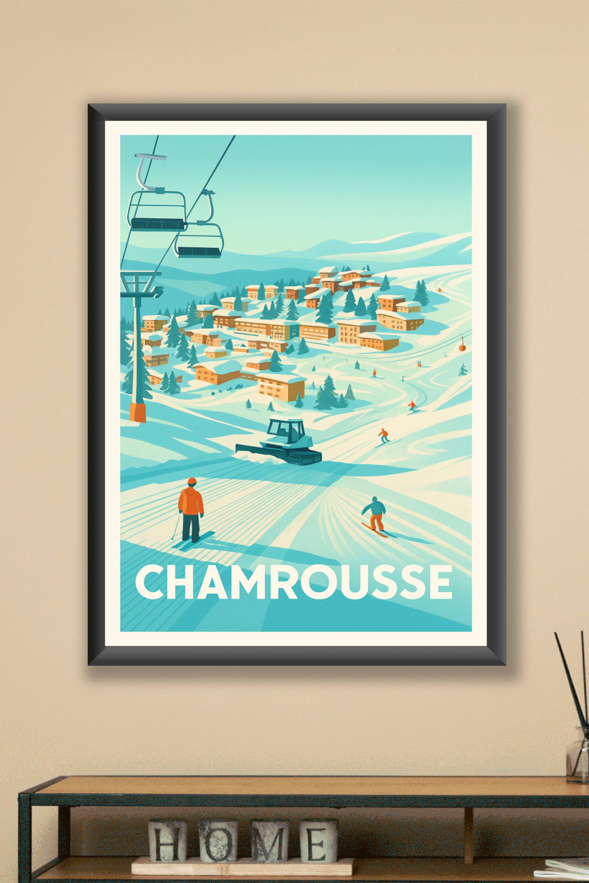 Découvrez l'ambiance vibrante et enneigée de Chamrousse à travers cette affiche vintage qui capture à merveille les cimes enneigées, les skieurs et les remontées mécaniques caractéristiques de cette station de montagne. Ce poster est imprimé en tirage "Fine Art" sur papier 305g coton, garantissant une finesse et une durabilité d'exception. Disponible en plusieurs formats allant de A1 à A4, avec ou sans cadre, cette affiche est idéale pour apporter une touche alpine chaleureuse et authentique à votre décoration intérieure. Profitez d'une impression de qualité premium, réalisée en France, pour revivre l'expérience unique des sports d'hiver depuis votre salon ou offrir un souvenir raffiné aux amateurs de montagne.