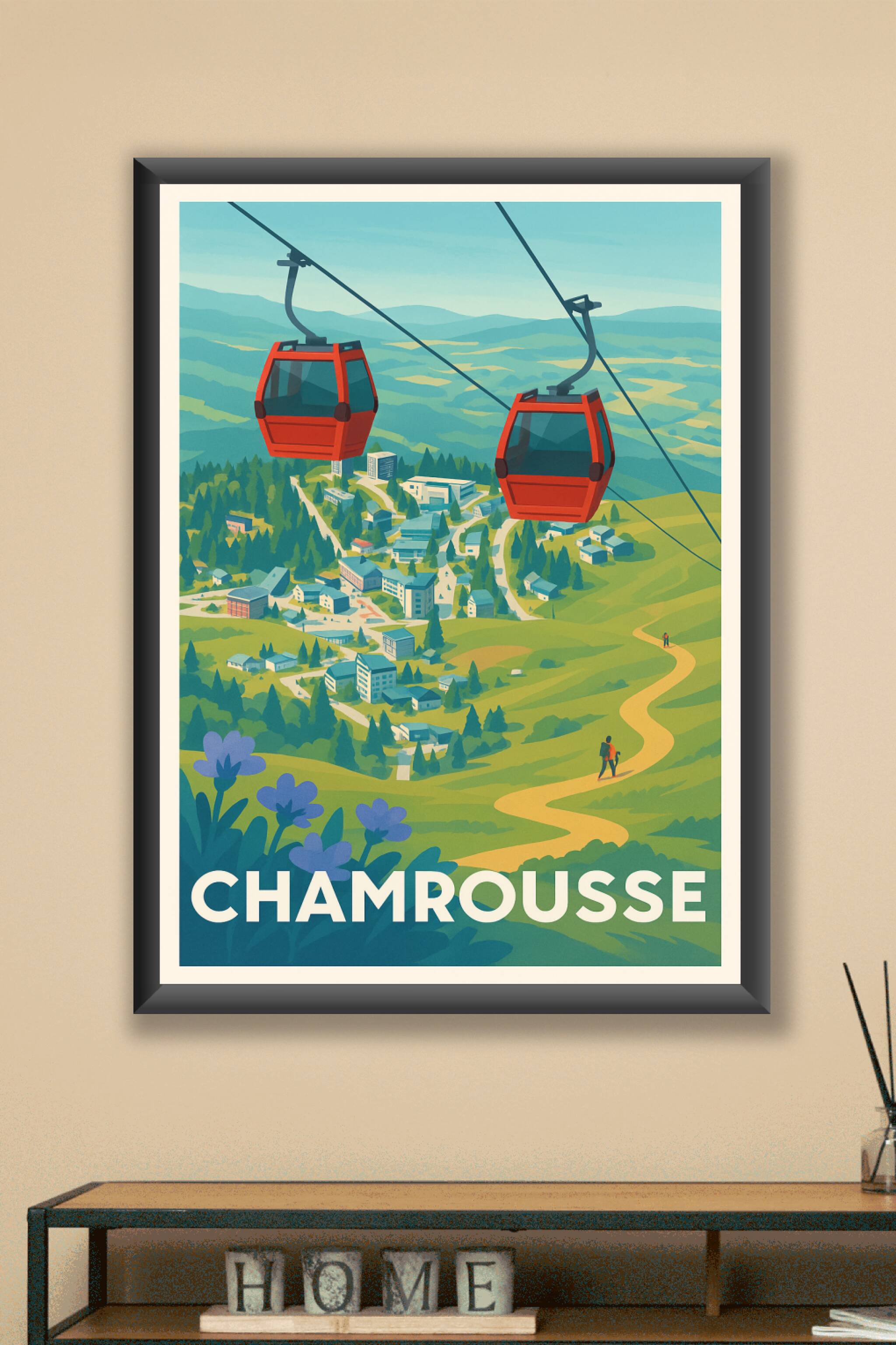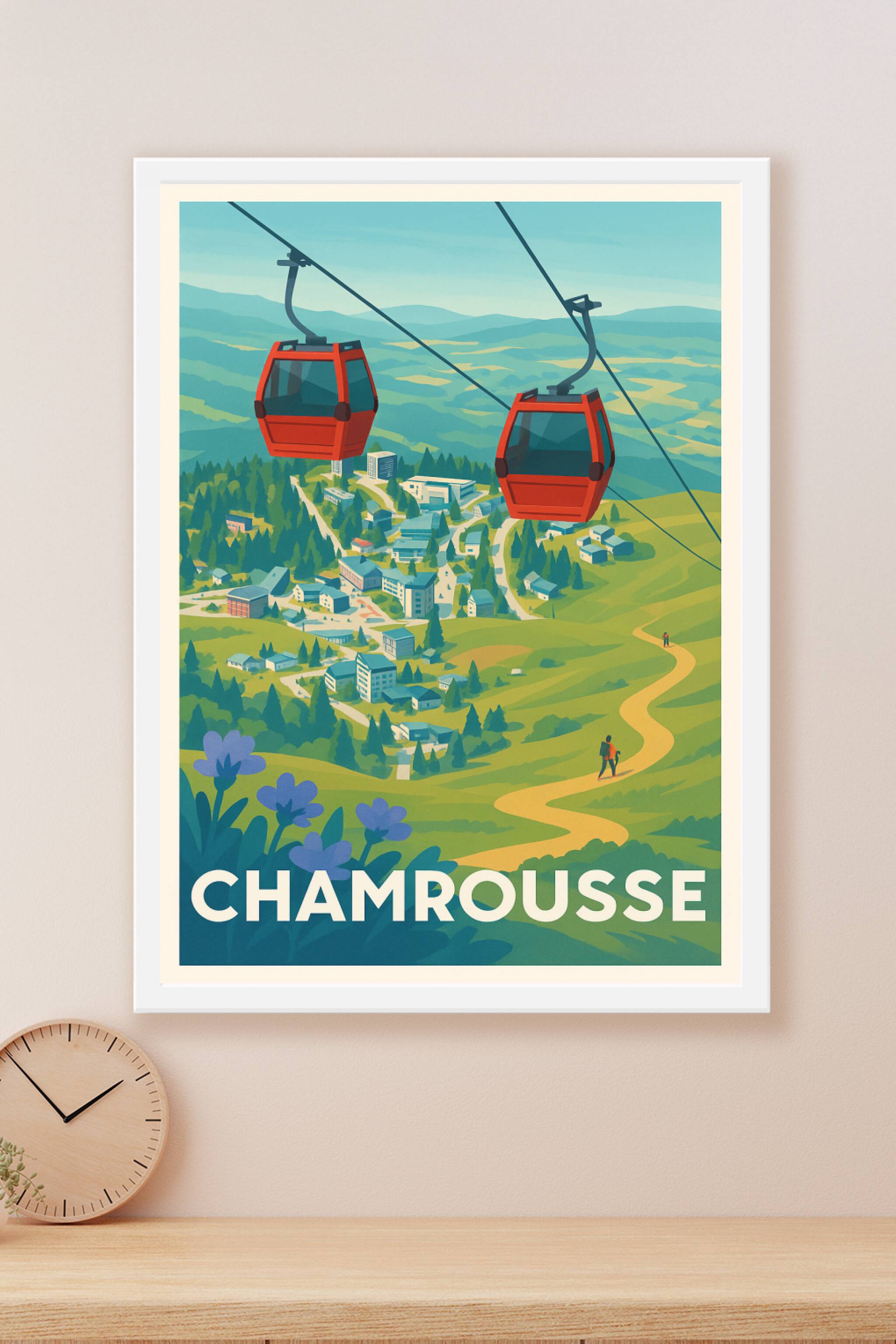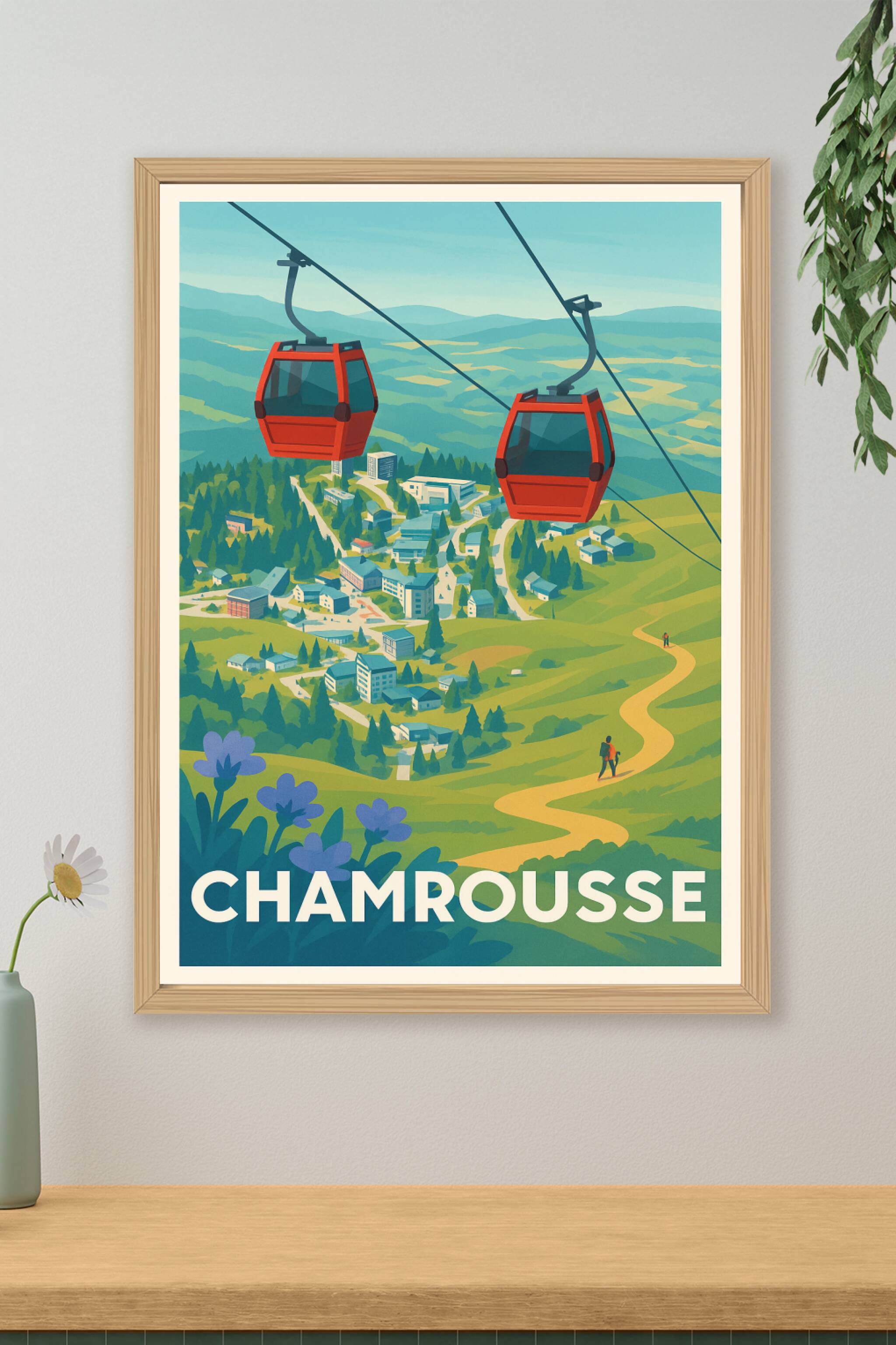 Découvrez la beauté sereine de Chamrousse avec cette affiche qui capture l'essence des montagnes alpines à travers des téléphériques rouges vifs su...