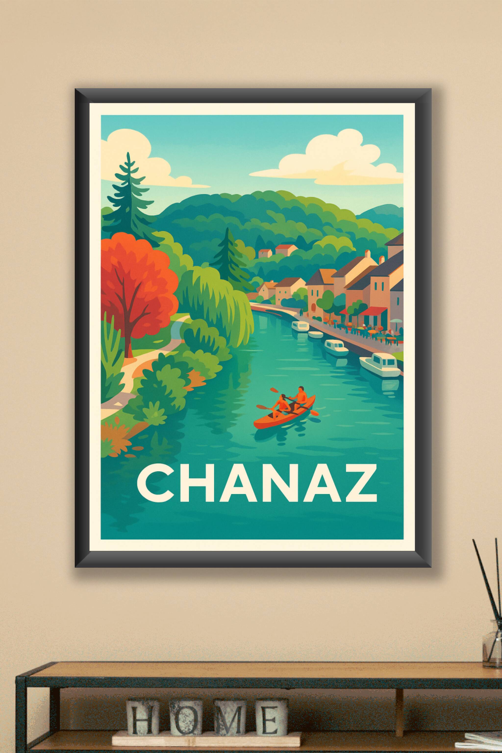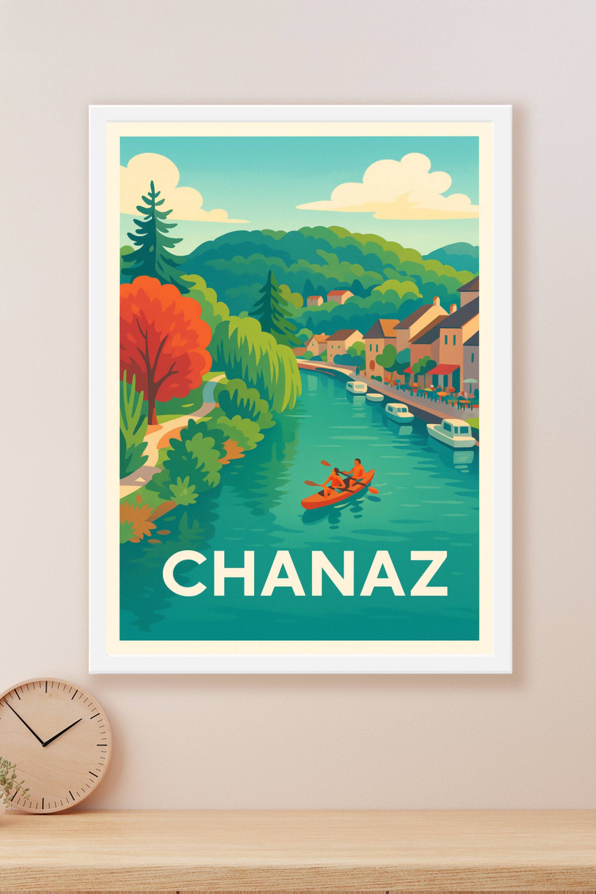 Découvrez la douceur de vivre de Chanaz avec cette affiche illustrée pleine de couleurs et de sérénité. Représentant un couple sur une barque au fi...