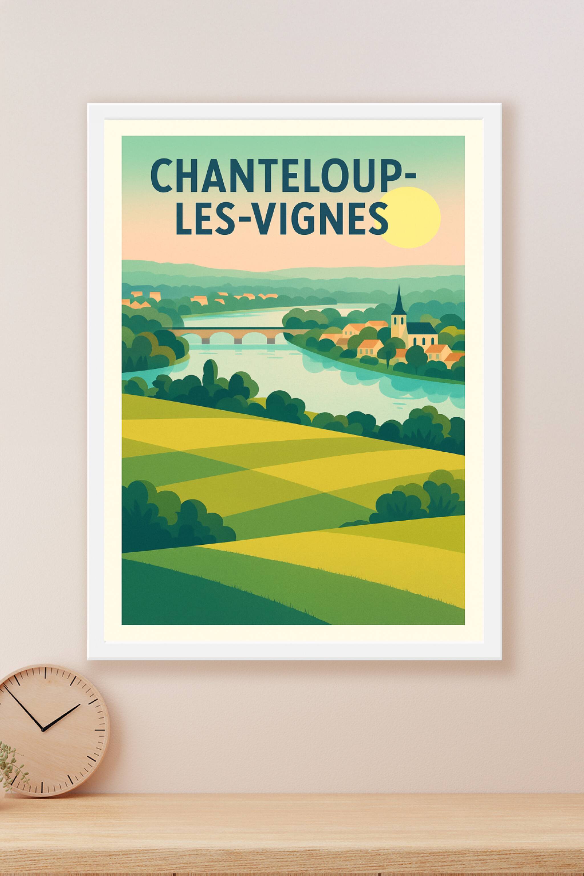 Découvrez la beauté paisible de Chanteloup-les-Vignes avec cette affiche au style vintage revisité, mettant en scène ses paysages verdoyants, la ri...