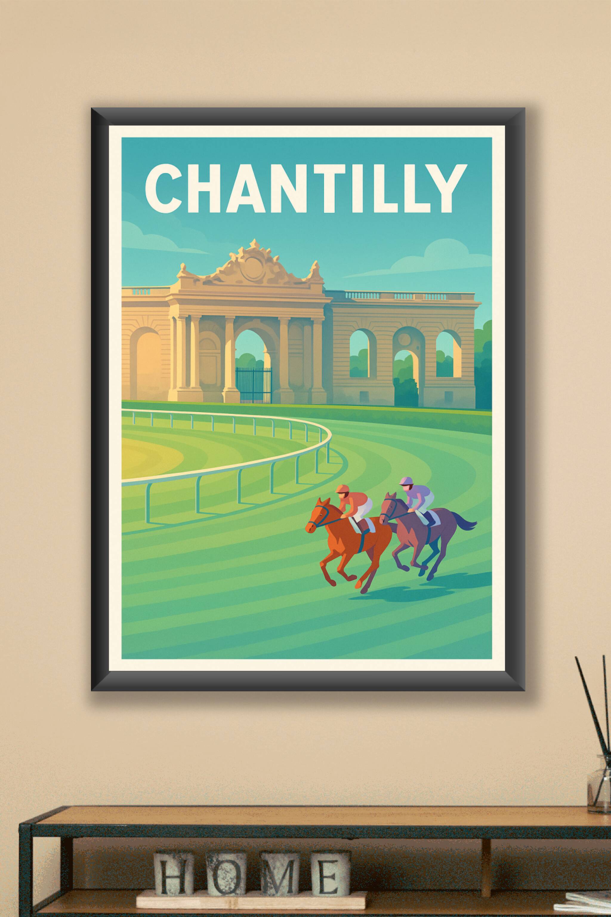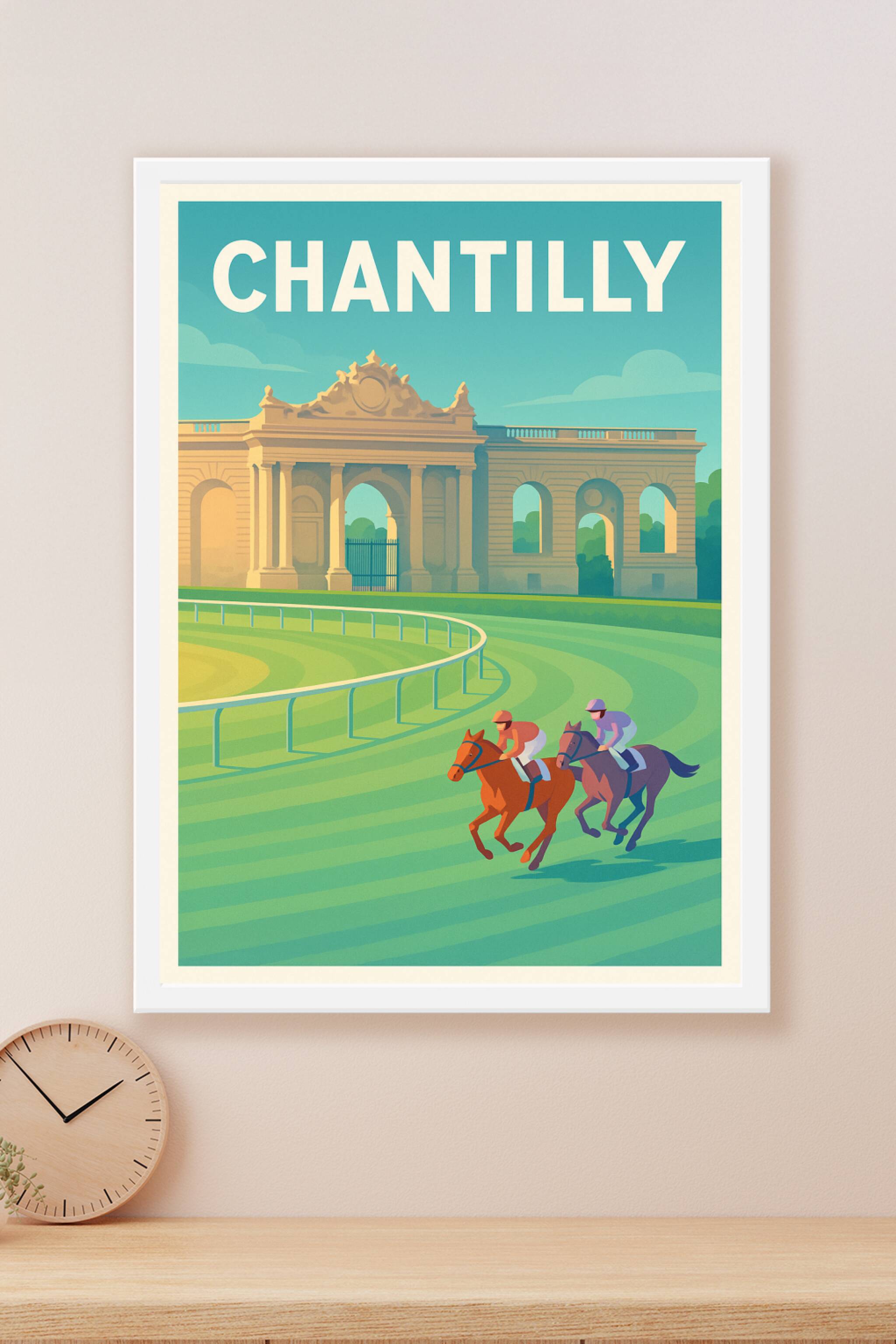 Découvrez l'atmosphère unique des célèbres courses hippiques de Chantilly avec cette affiche illustrée au style vintage et élégant. Le poster met e...