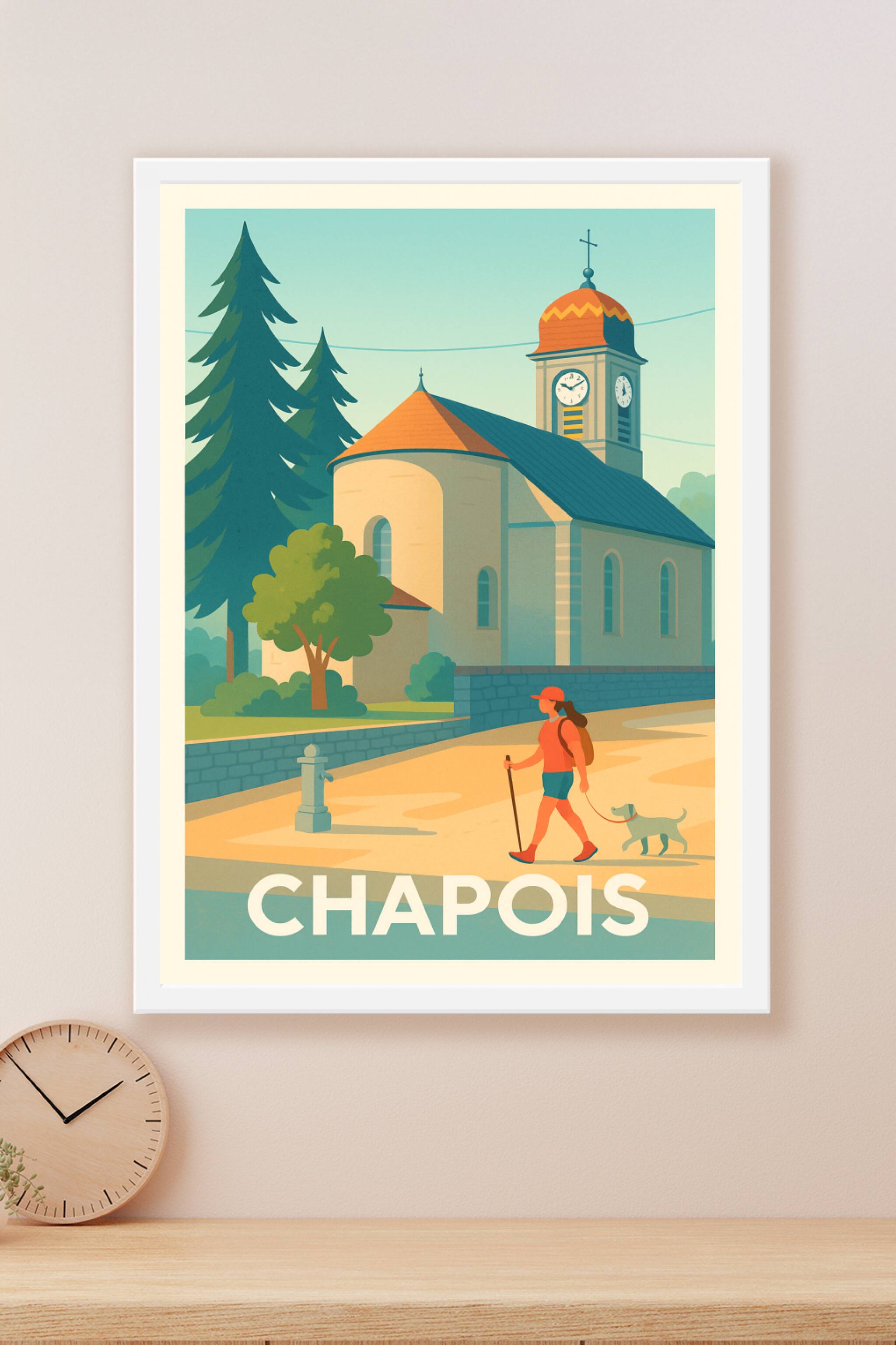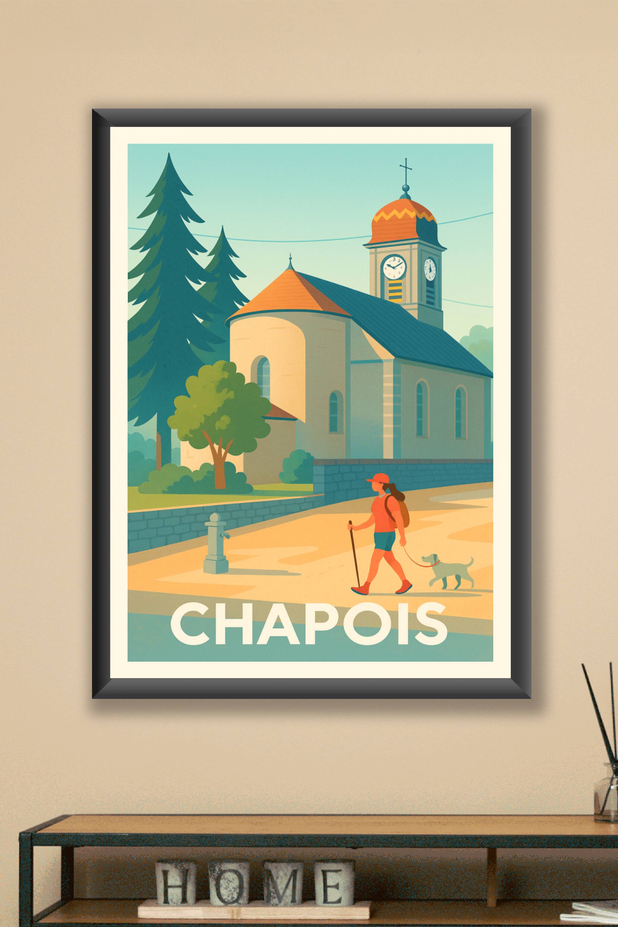 Découvrez la sérénité d'une balade dans le charmant village de Chapoix avec cette affiche vintage au style doux et épuré. L'illustration met en scè...