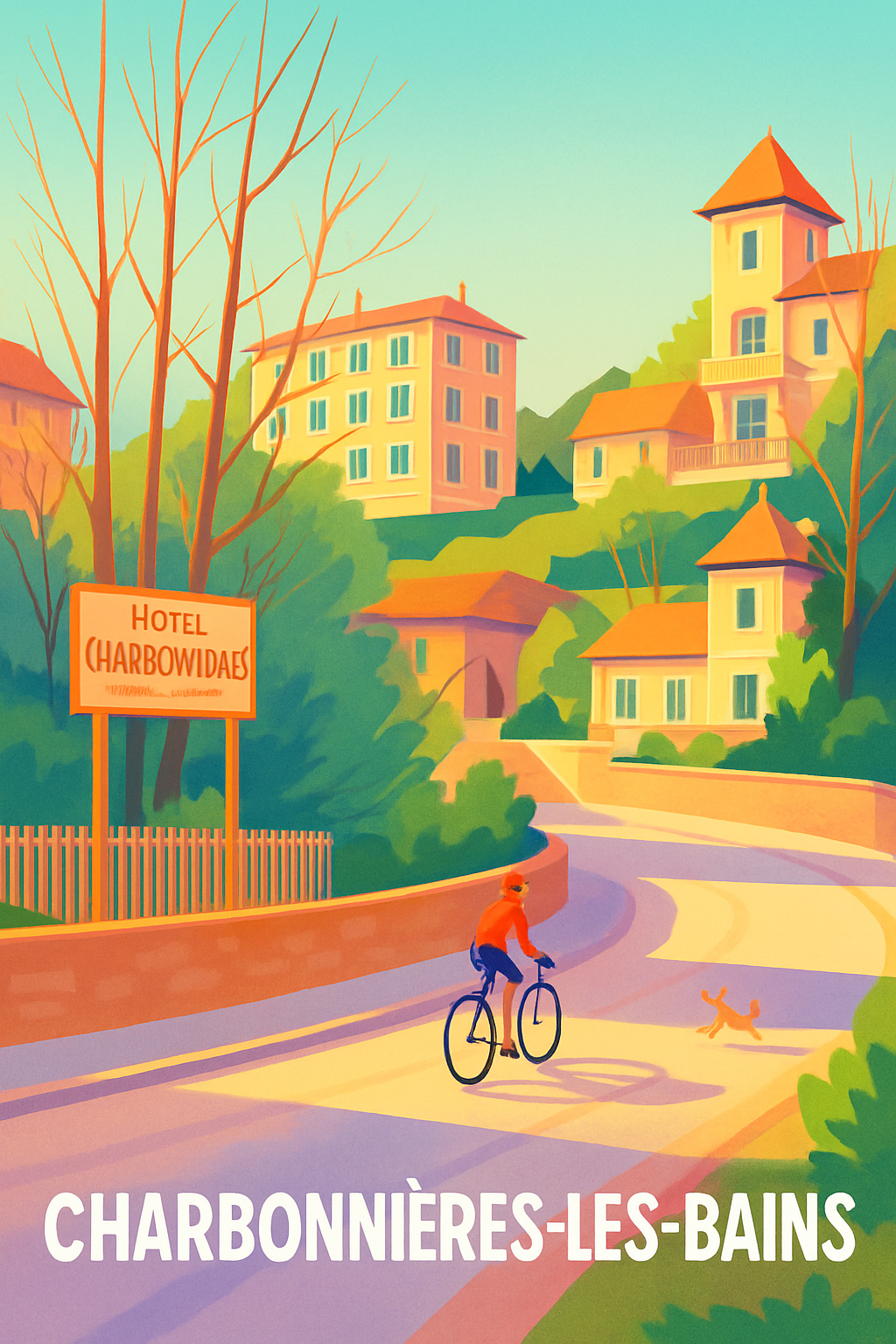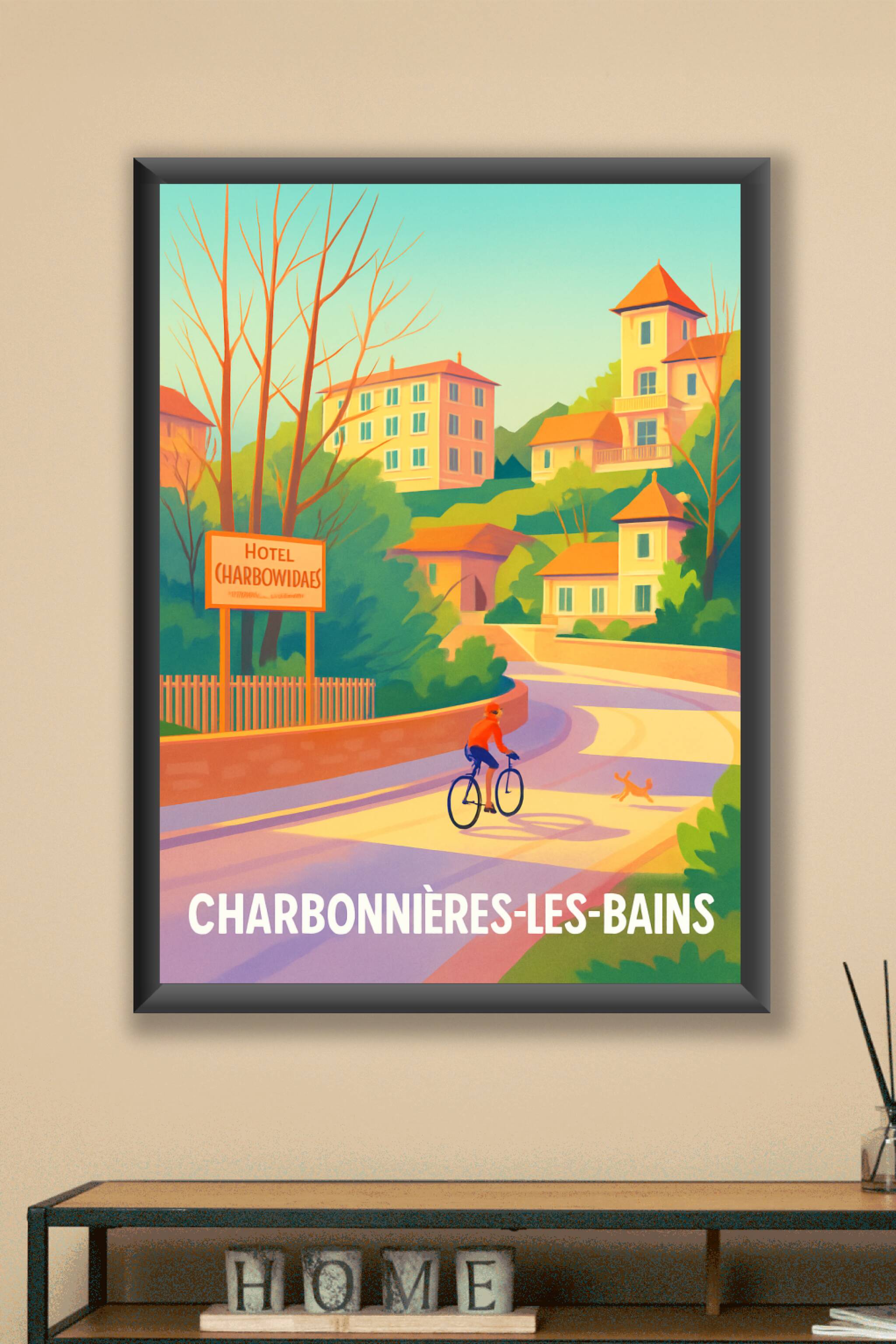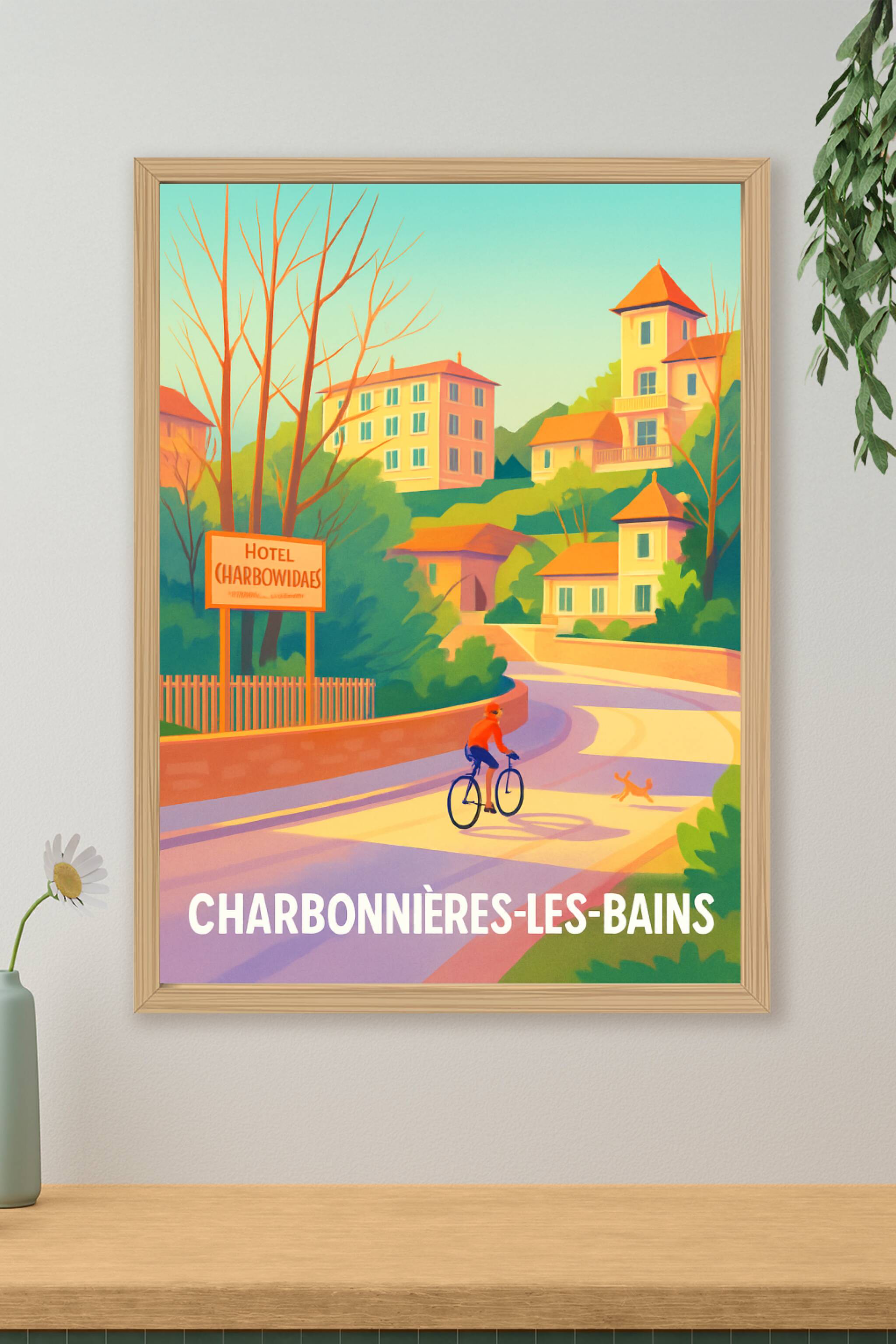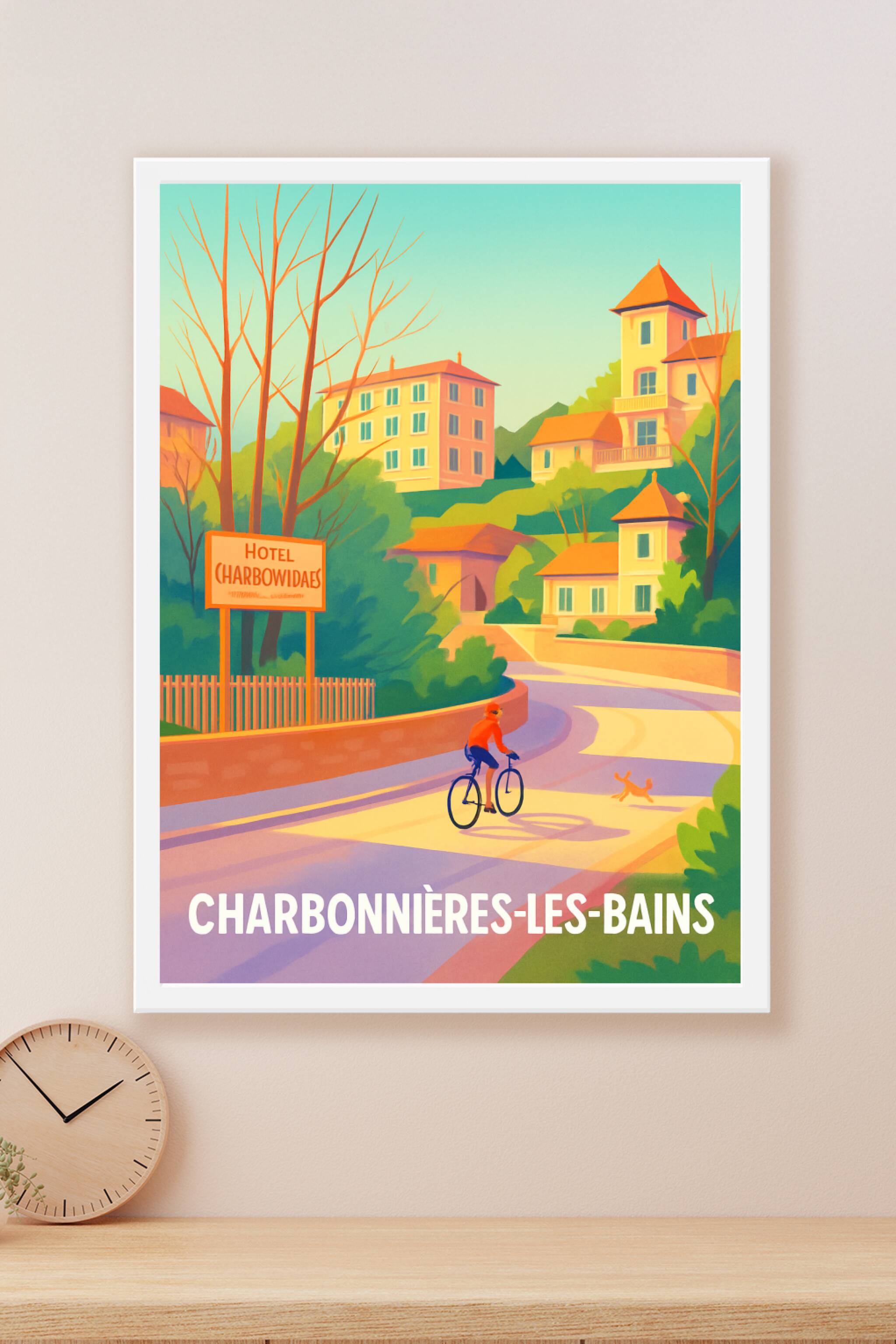 Découvrez le charme paisible de Charbonnières-les-Bains avec cette affiche illustrée, qui capture un instant doux où un cycliste traverse une rue b...