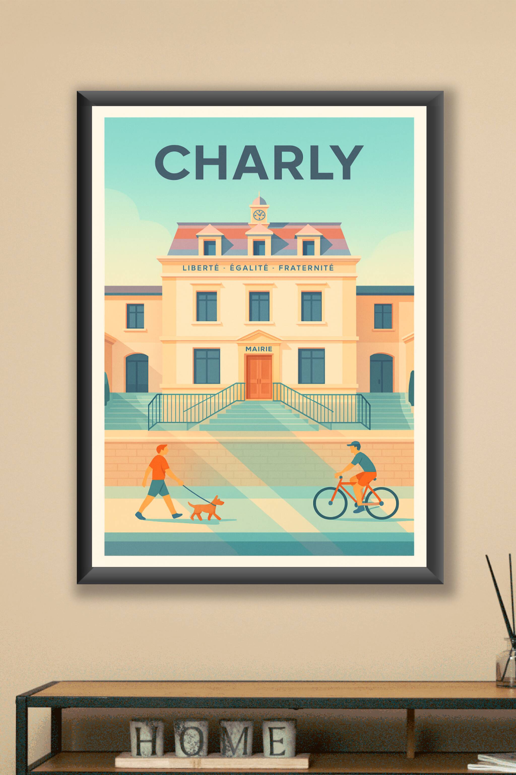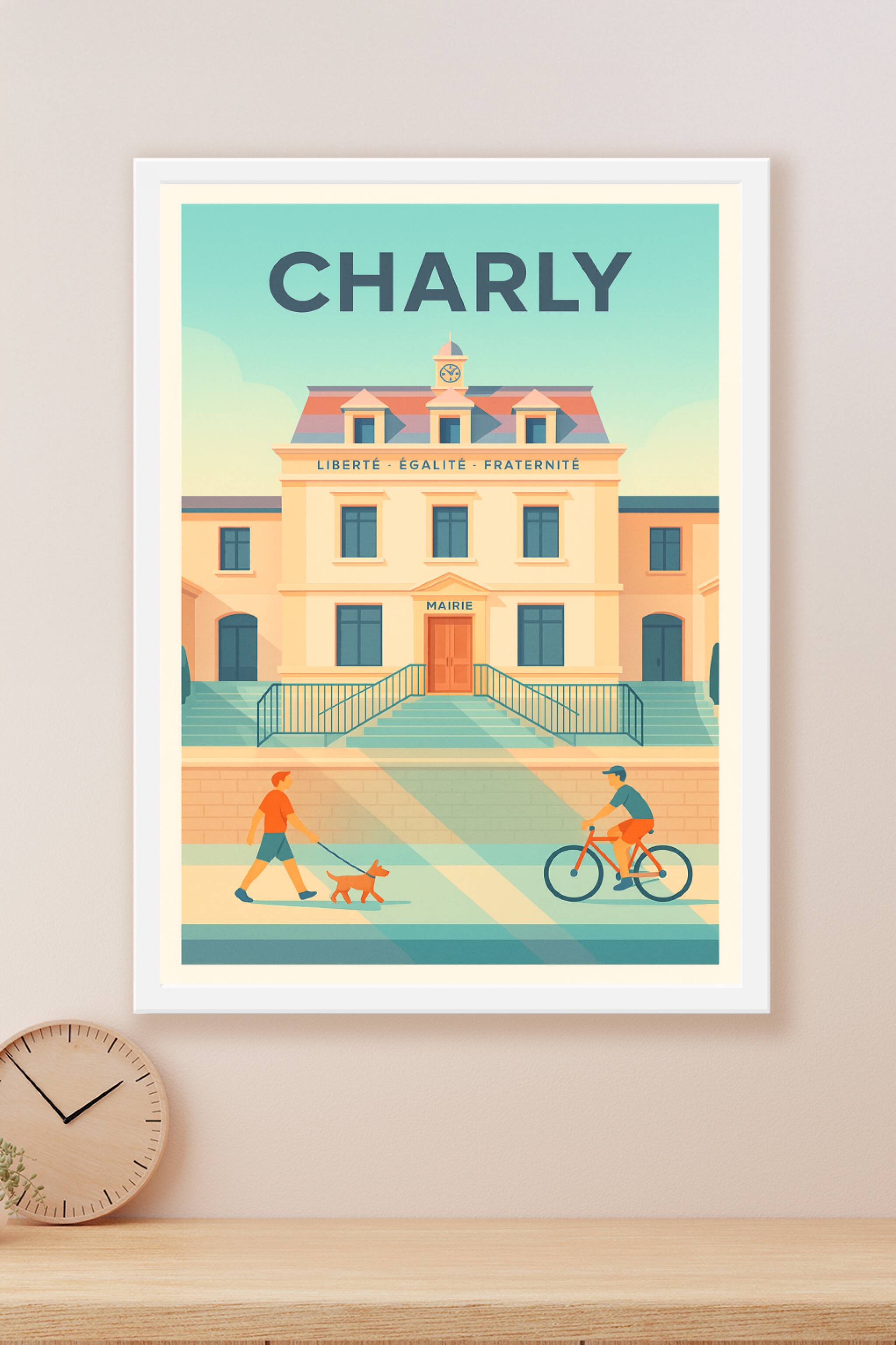 Découvrez l'ambiance paisible de la ville de Charly à travers cette superbe affiche illustrée mettant en scène la mairie et la douceur de vivre loc...
