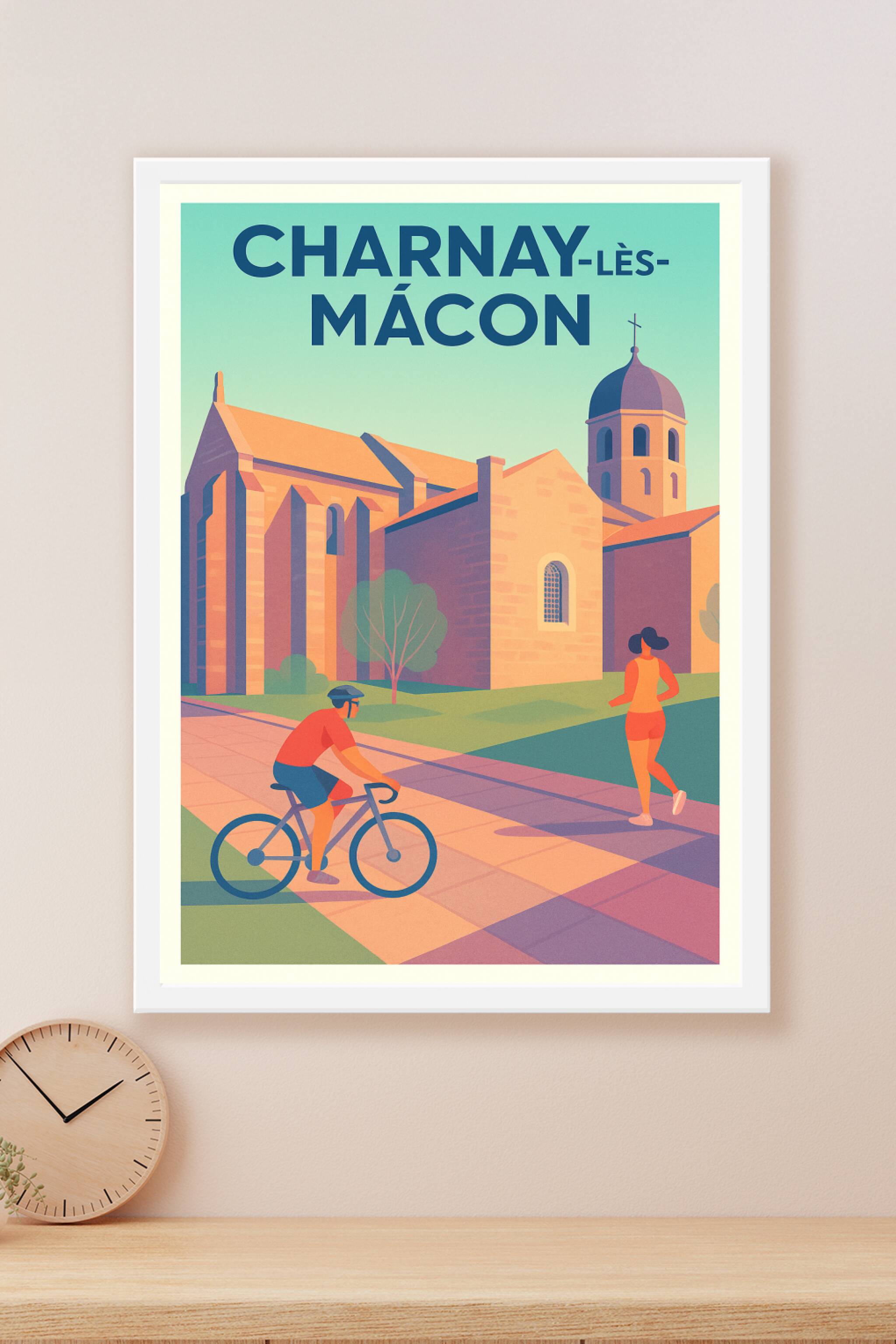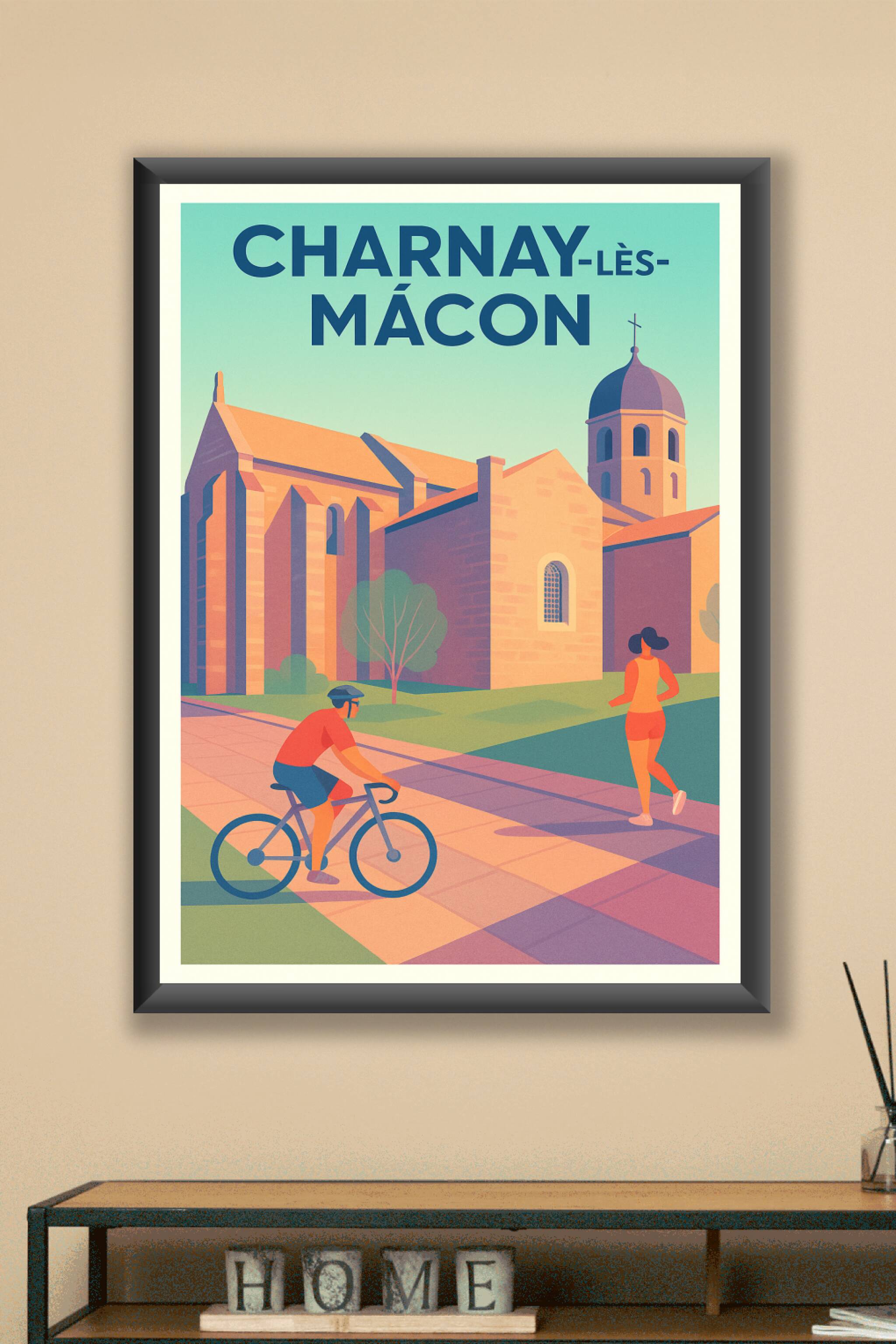 Découvrez cette superbe affiche illustrée mettant en scène la ville de Charnay-lès-Mâcon, où patrimoine architectural et vie active se rencontrent ...
