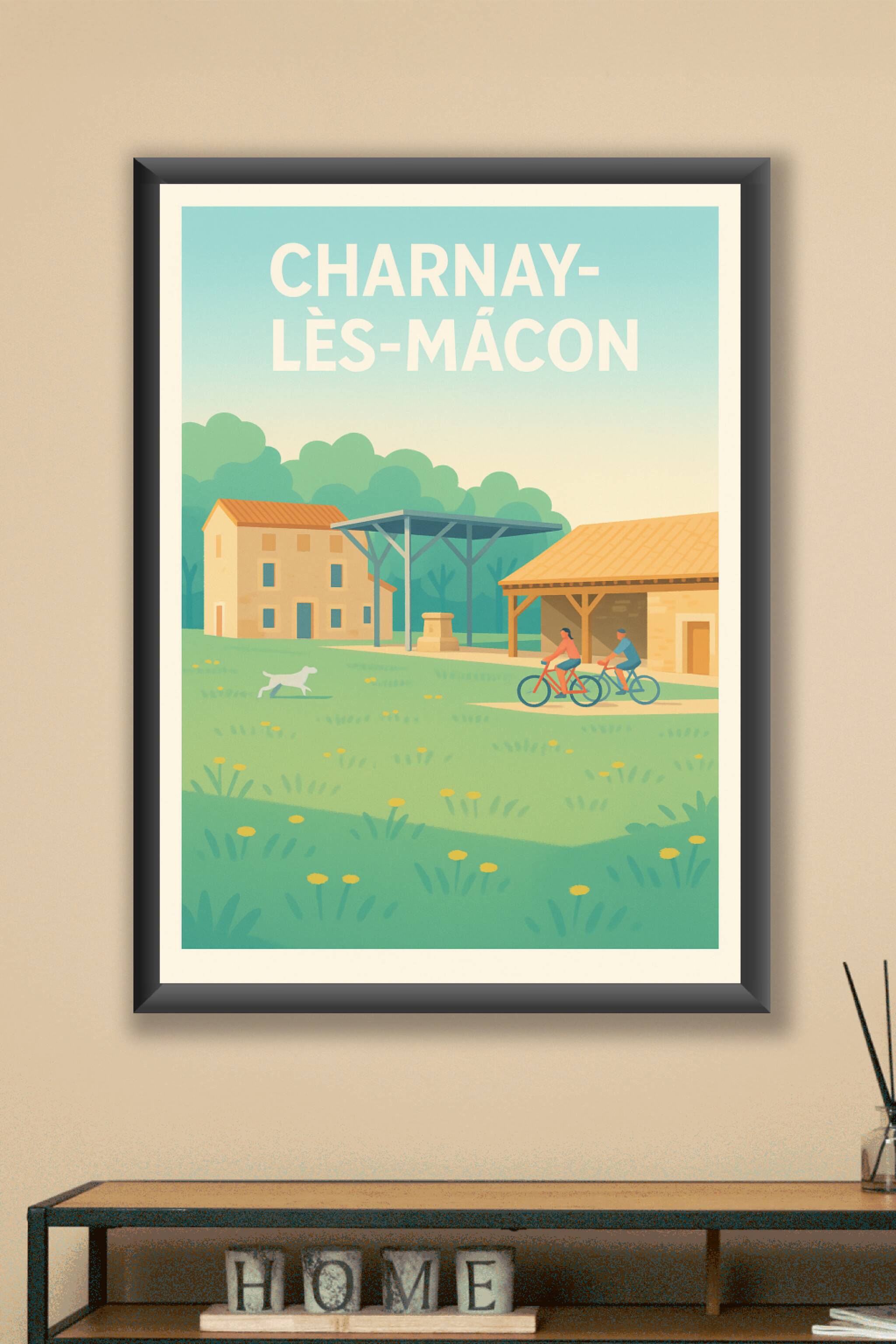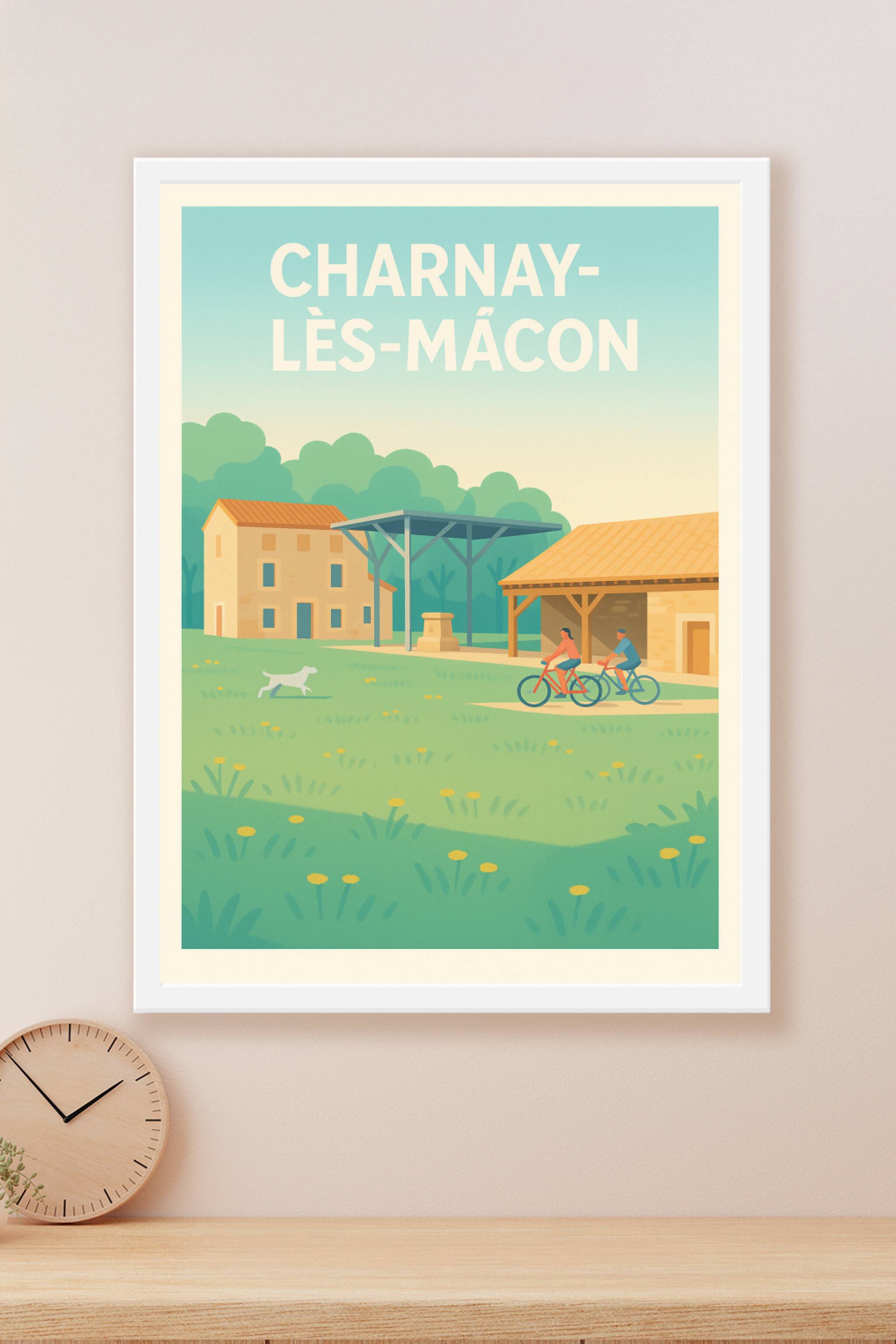Apportez une touche de sérénité champêtre à votre décoration avec cette affiche illustrant un charmant paysage de Charnay-lès-Mâcon. On y découvre deux cyclistes au cœur d'une prairie fleurie, entourés de maisons traditionnelles et d'une atmosphère paisible.L'impression Fine Art de cette affiche garantit une qualité exceptionnelle, réalisée sur un papier 305g coton qui sublime les couleurs douces et l'ambiance apaisante de l'illustration. Ce poster est disponible en formats A1 à A4, avec ou sans cadre, pour s'adapter parfaitement à votre intérieur. Offrez-vous un souvenir élégant et authentique de cette belle région, ou faites plaisir à un proche amoureux de la nature et du vélo.