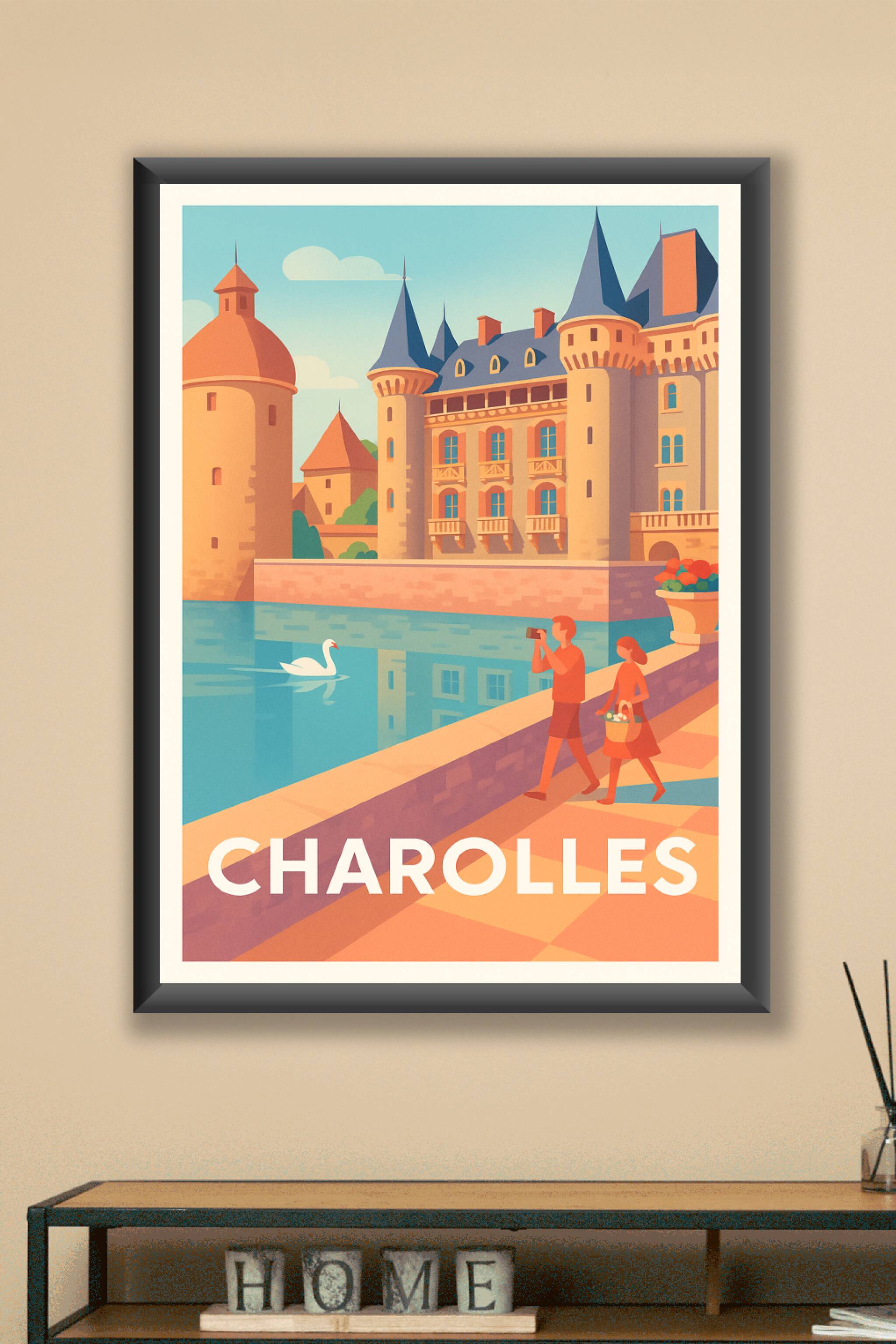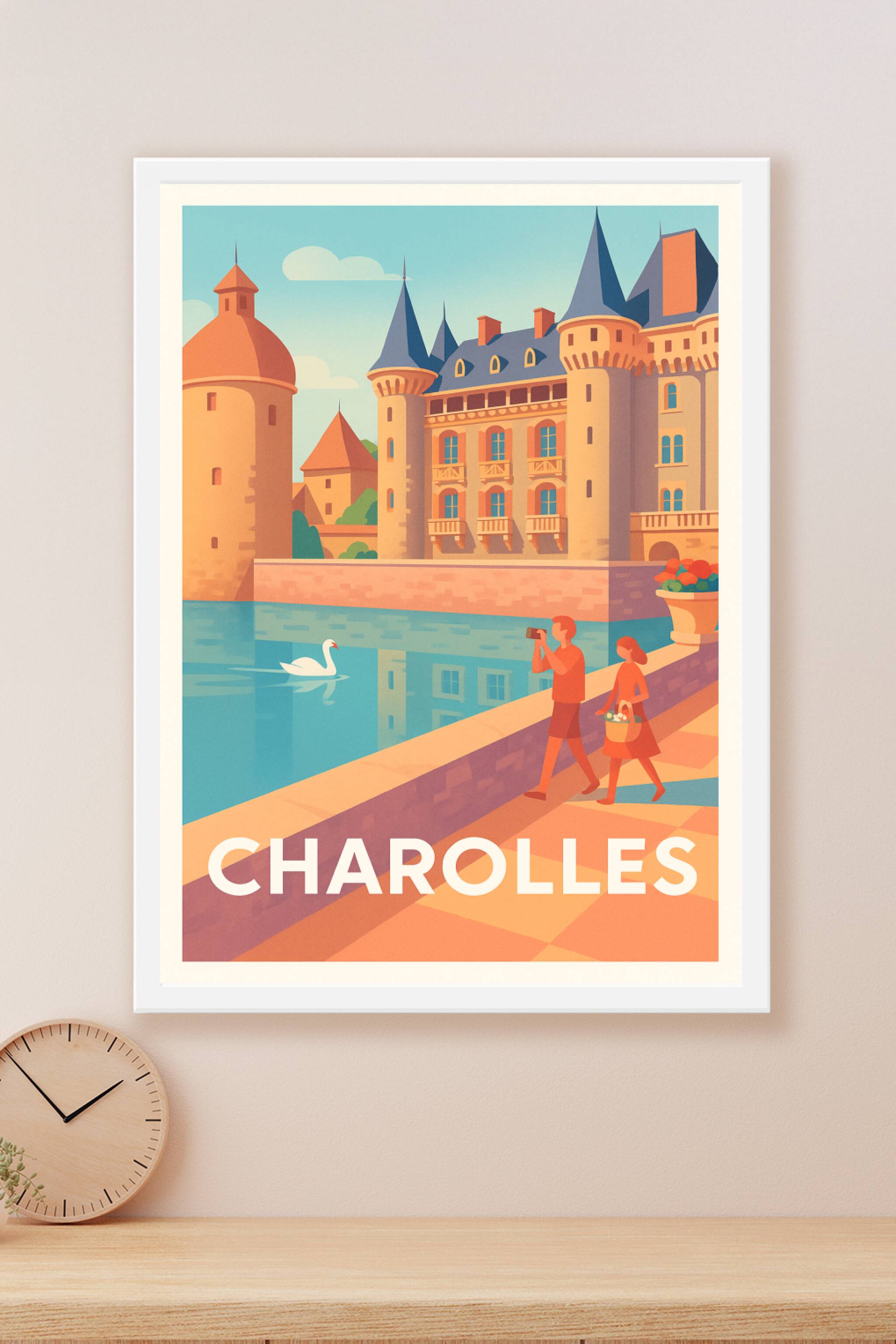 Découvrez Charolles à travers cette affiche illustrée qui capture la beauté majestueuse du château et la douceur de ses environs. Ce poster au styl...