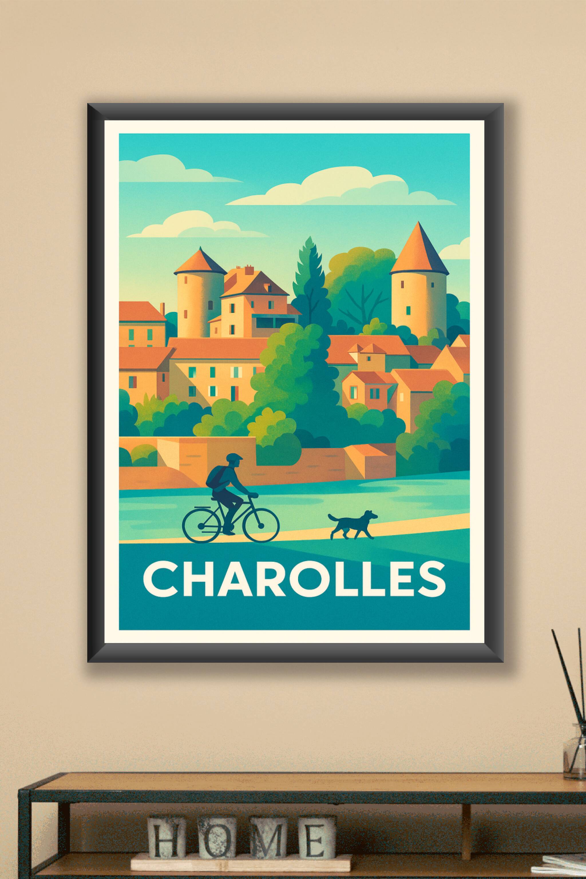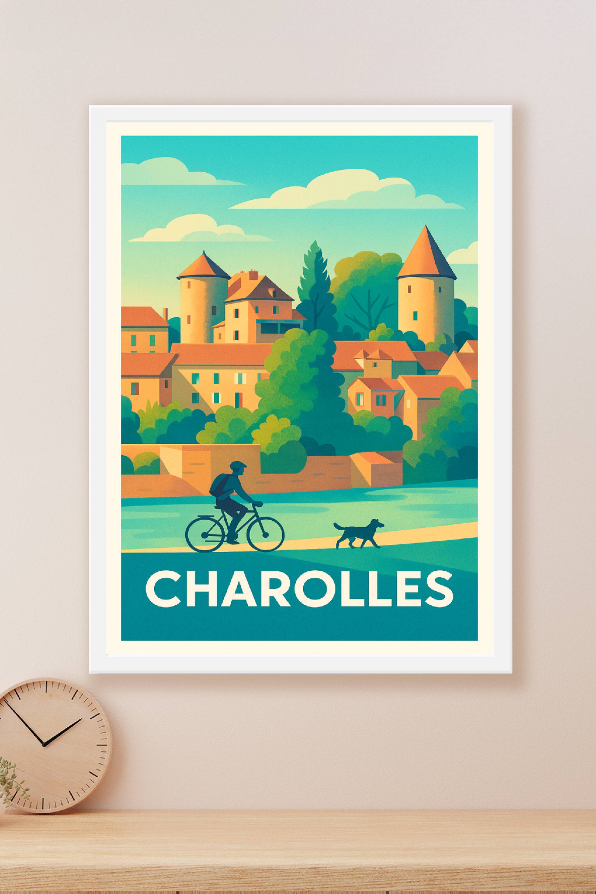 Découvrez Charolles à travers cette superbe affiche illustrée, qui capture le charme paisible de cette ville bourguignonne emblématique. La scène m...