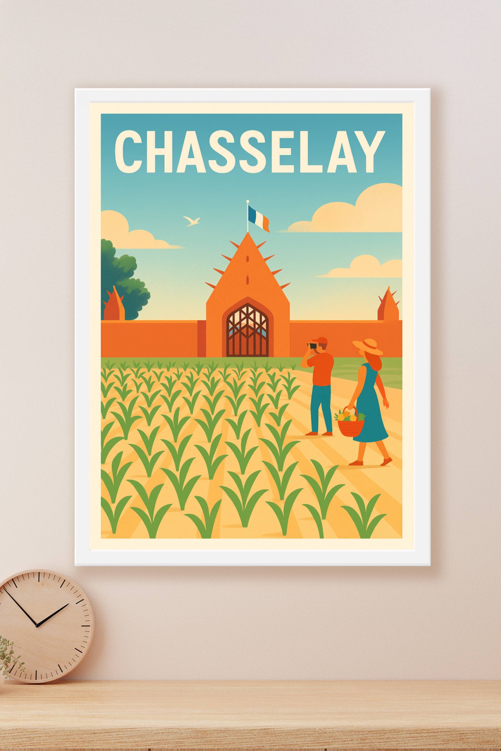 Découvrez cette affiche vintage illustrant Chasselay, avec son paysage champêtre et l'architecture remarquable mettant en avant un bâtiment embléma...