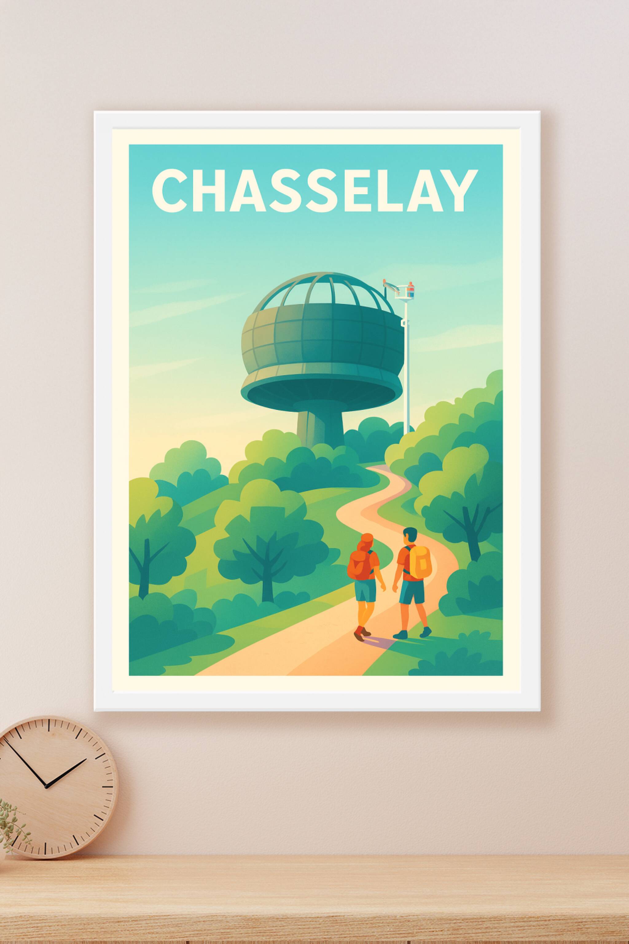 Découvrez l'univers singulier de Chasselay avec cette affiche illustrée mettant en avant son impressionnant radar météo surplombant un sentier buco...