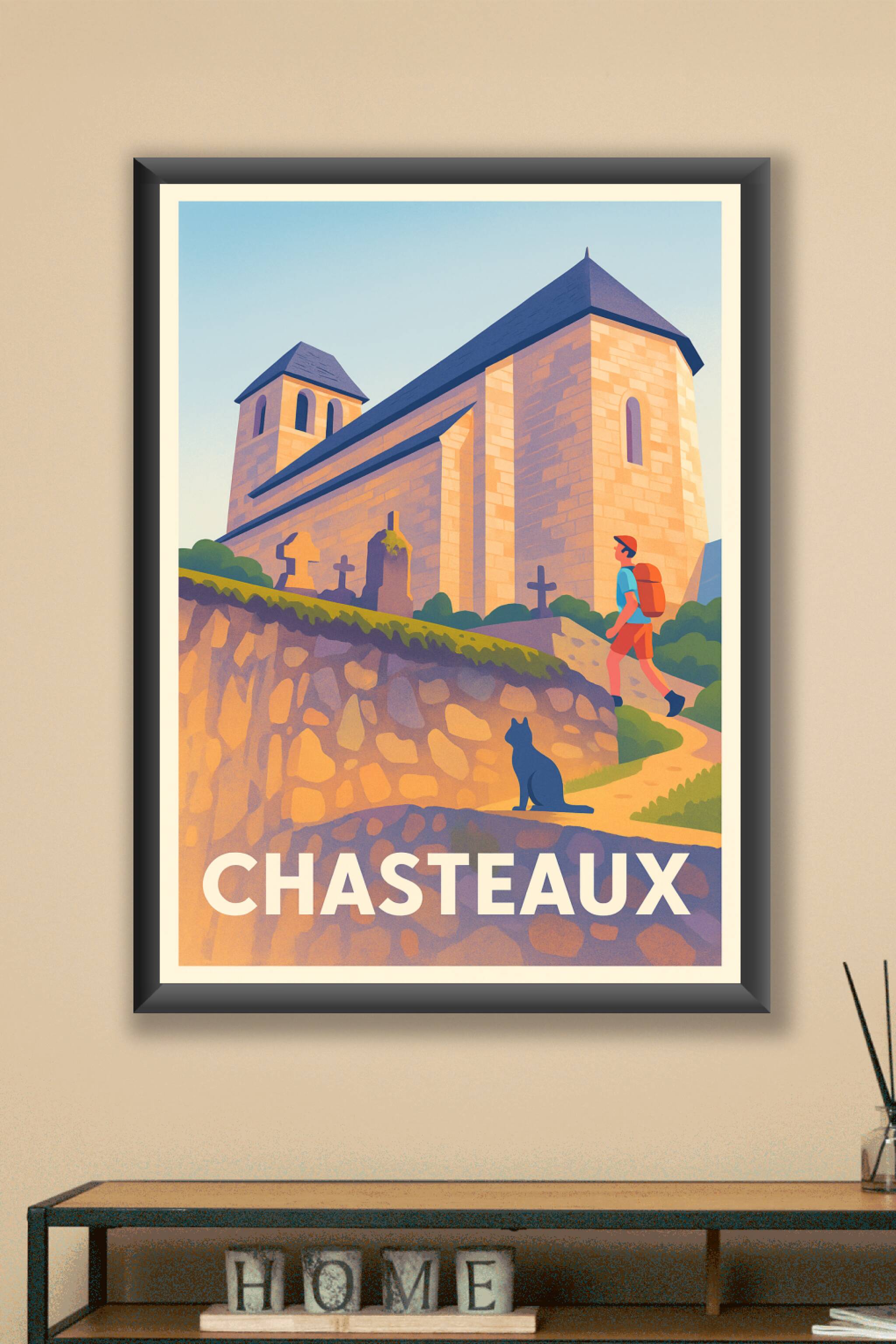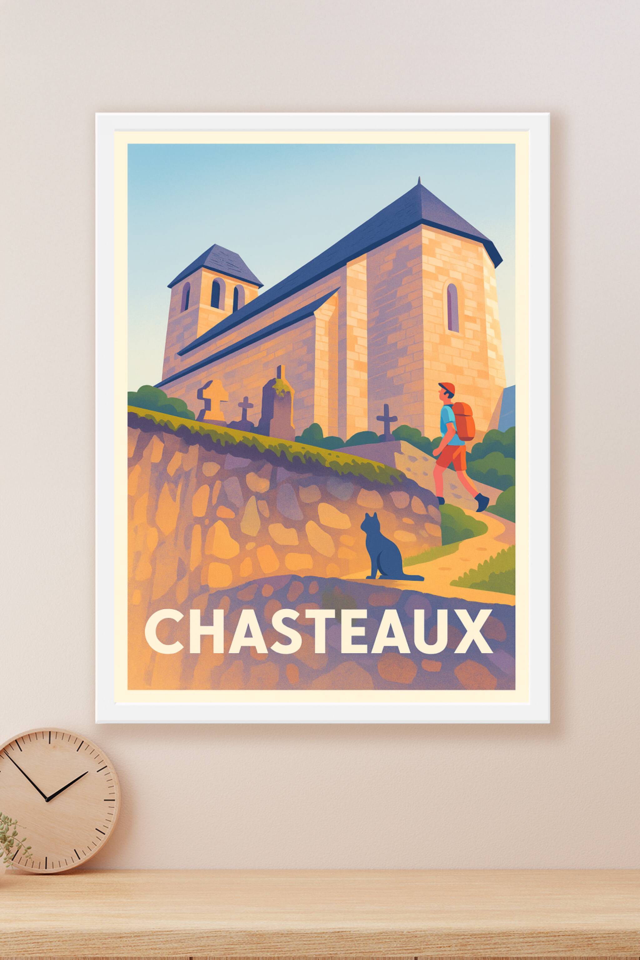 Découvrez la sérénité de Chasteaux à travers cette affiche illustrée, où une église ancienne se dresse majestueusement sous un ciel bleu limpide. U...