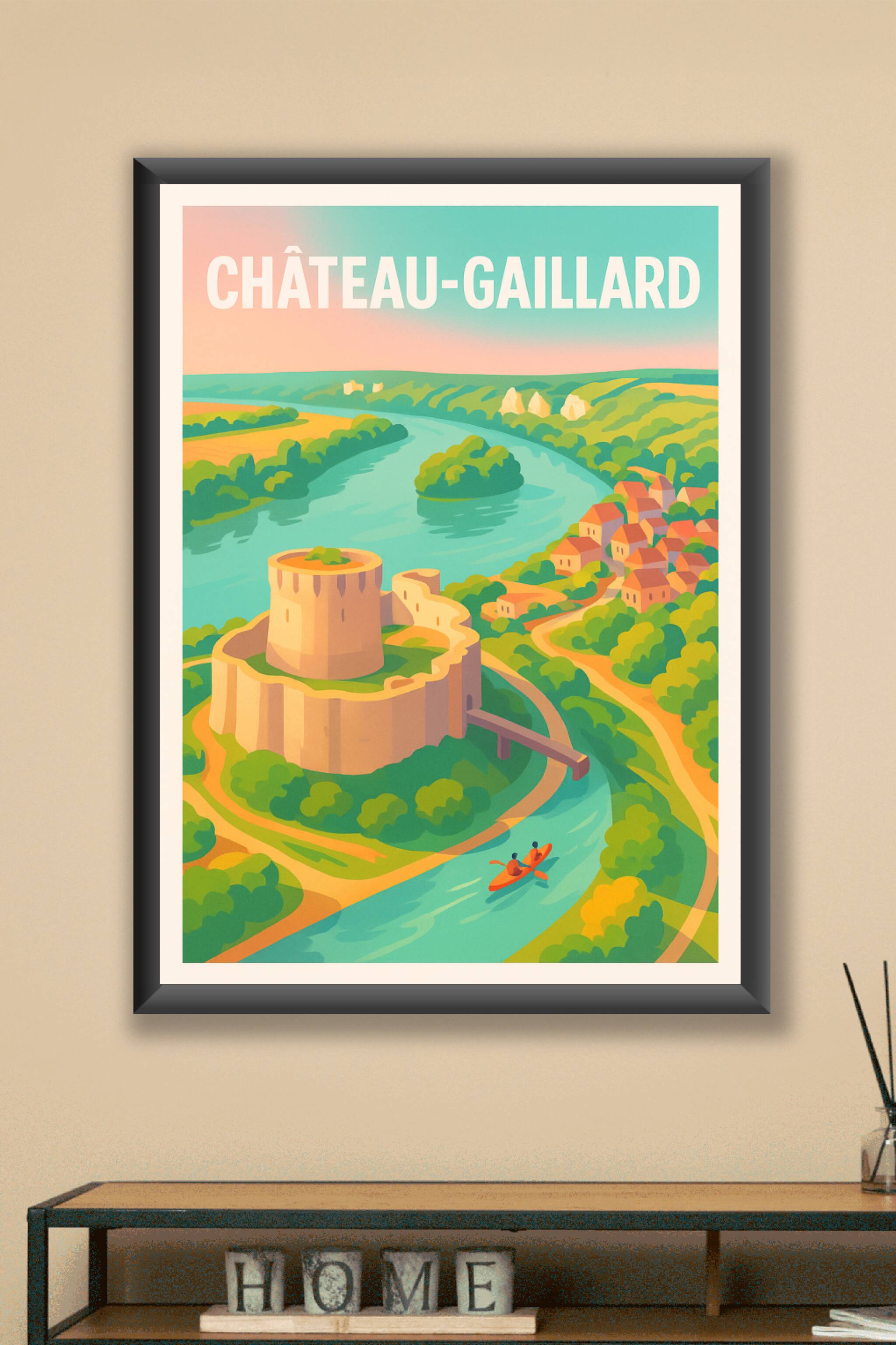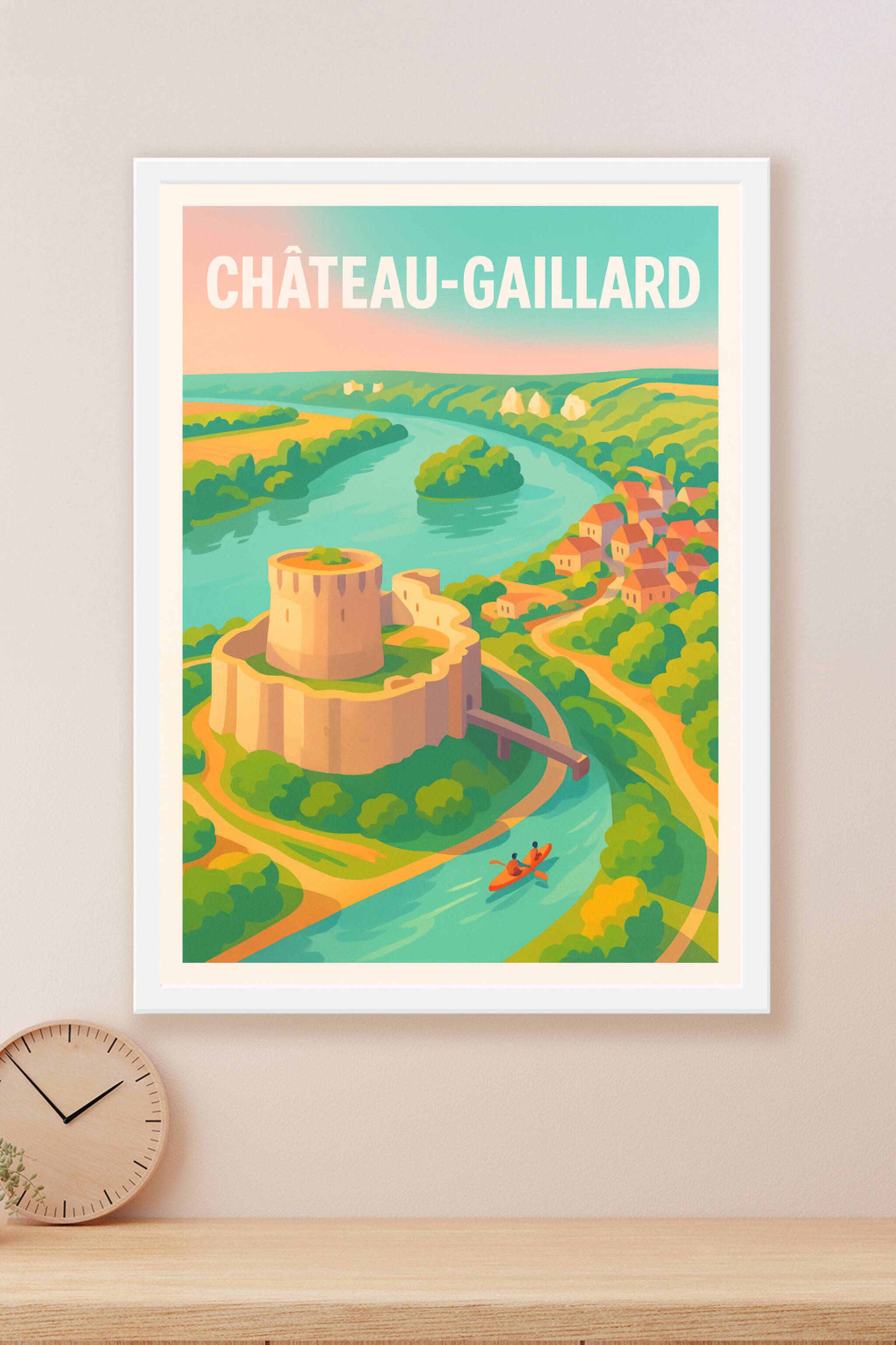 Découvrez le charme authentique de Château-Gaillard avec cette affiche illustrée qui met en lumière son imposant château fort entouré par le cours ...