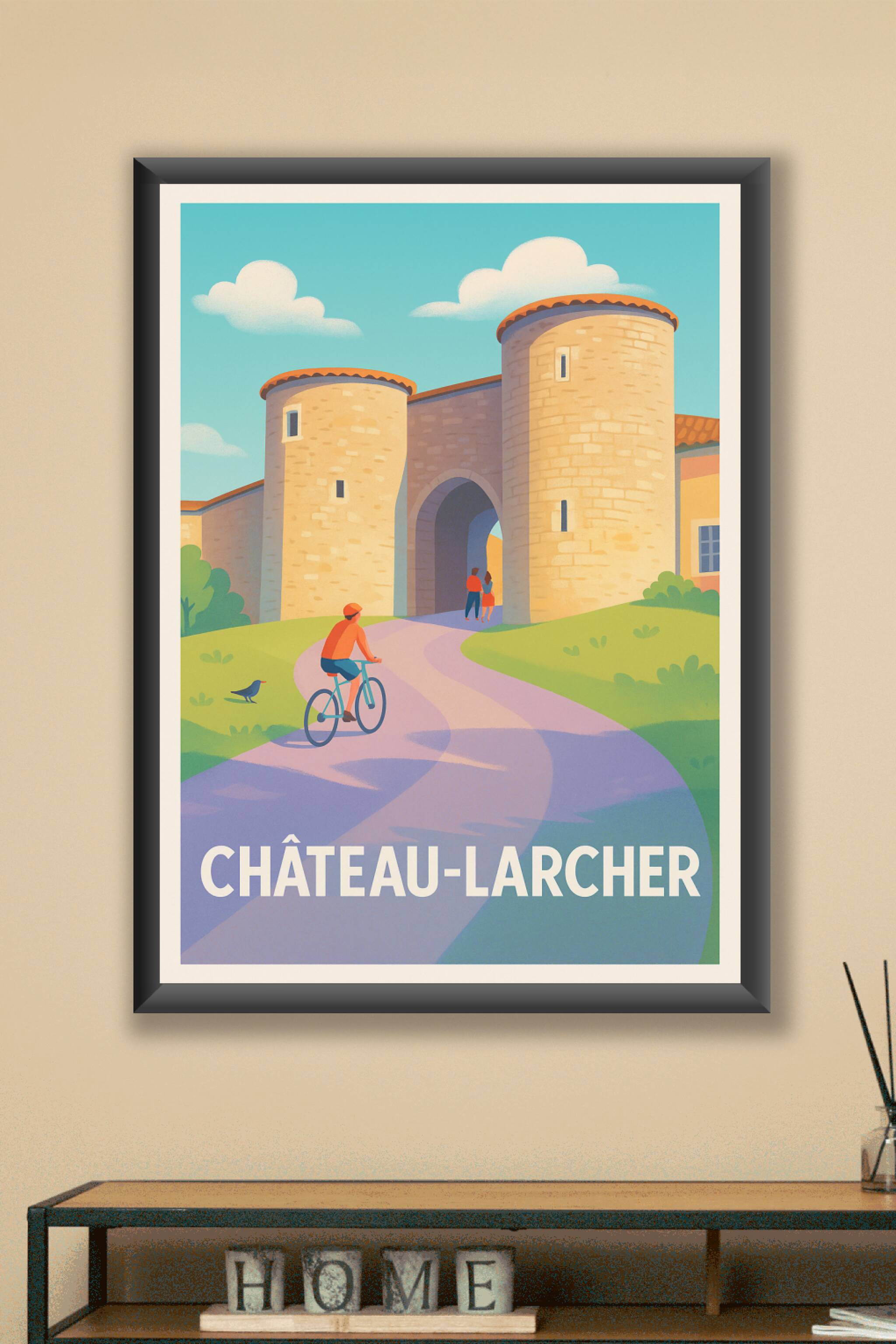 Apportez une touche d'histoire et de tranquillité à votre décoration intérieure avec cette affiche représentant l'architecture emblématique de Château-Larcher. Ce poster illustre une scène sereine où un cycliste et un couple profitent du cadre paisible offert par les anciennes tours en pierre sous un ciel bleu clair.Vous pouvez choisir entre plusieurs formats allant de A1 à A4, avec ou sans cadre, selon vos préférences et l'espace disponible chez vous. Imprimée en tirage « Fine Art » sur papier 305g coton de haute qualité, cette affiche offre une finition exceptionnelle et des couleurs vibrantes qui sublimeront tout intérieur. Profitez d'une impression premium, 100% fabriquée en France, pour un souvenir authentique et élégant de Château-Larcher.