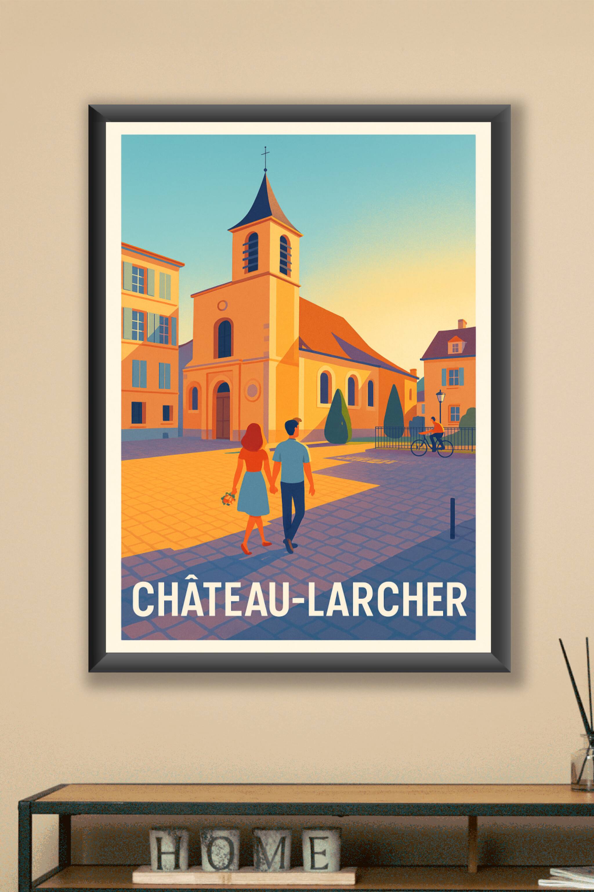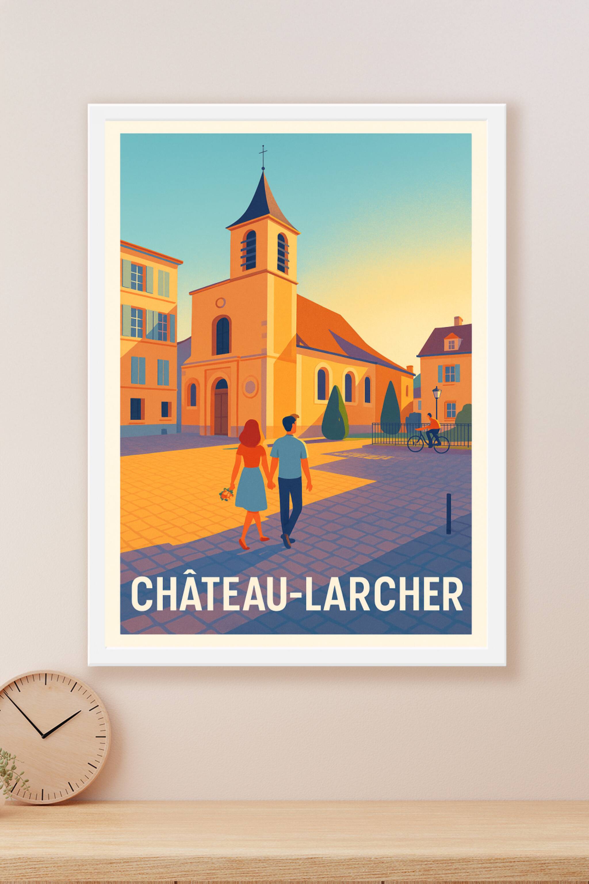 Offrez-vous une balade pleine de charme avec ce poster illustré représentant une scène douce et lumineuse de Château-Larcher. Cette affiche capture...