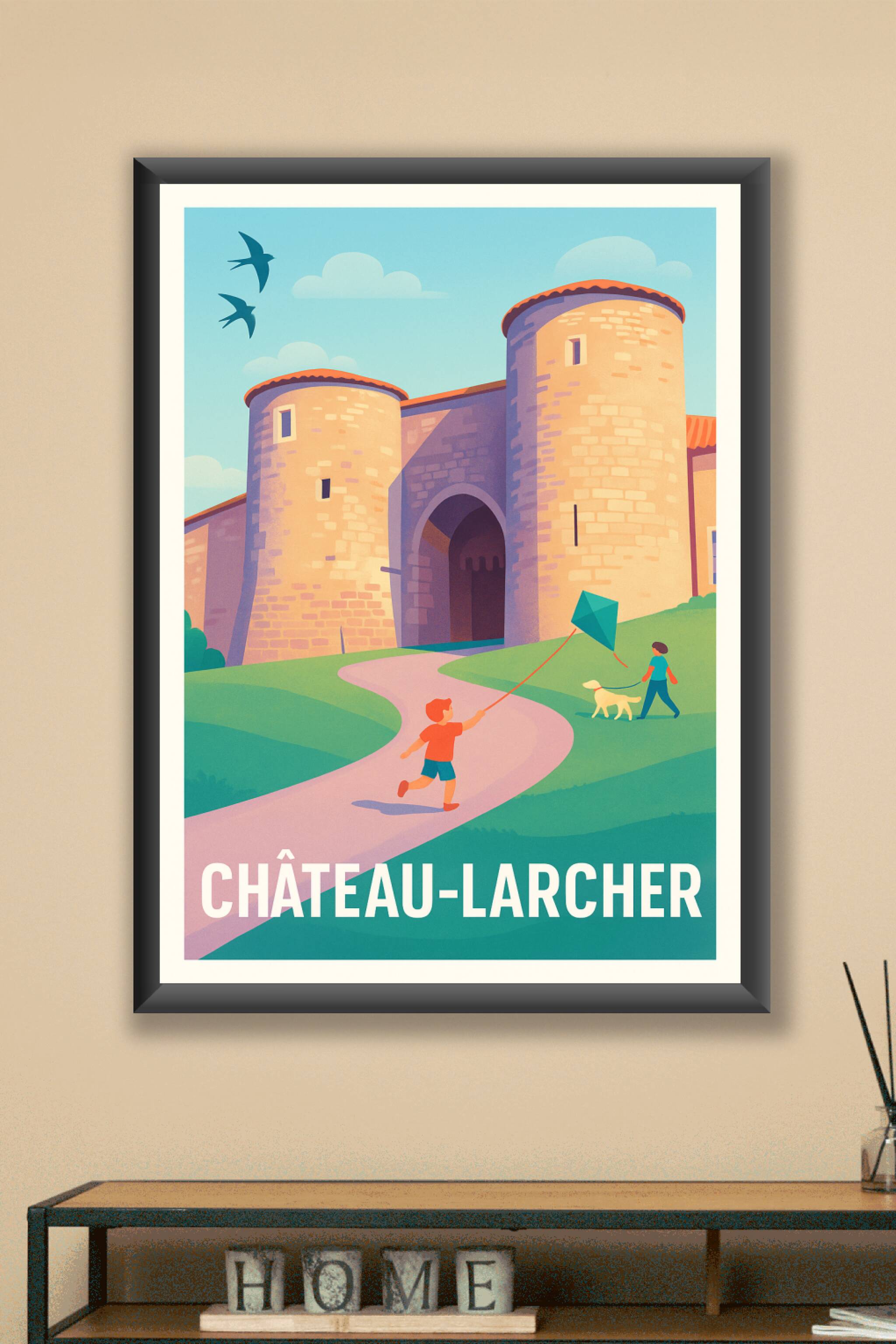 Découvrez l'élégance historique de Château-Larcher à travers cette affiche illustrée qui capture la majesté de son château fortifié. Avec son style coloré et doux, ce poster évoque une balade joyeuse où enfants et animaux partagent des moments de liberté au pied des tours anciennes. Imprimée en tirage "Fine Art" sur papier 305g coton, cette affiche garantit une qualité d'impression remarquable et un rendu lumineux des couleurs. Disponible en formats A1 à A4, avec ou sans cadre, elle s'adapte parfaitement à votre intérieur pour offrir une touche d'histoire et de poésie à votre décoration. Faites entrer l'atmosphère unique de Château-Larcher chez vous grâce à ce poster d'exception, 100% fabriqué en France.