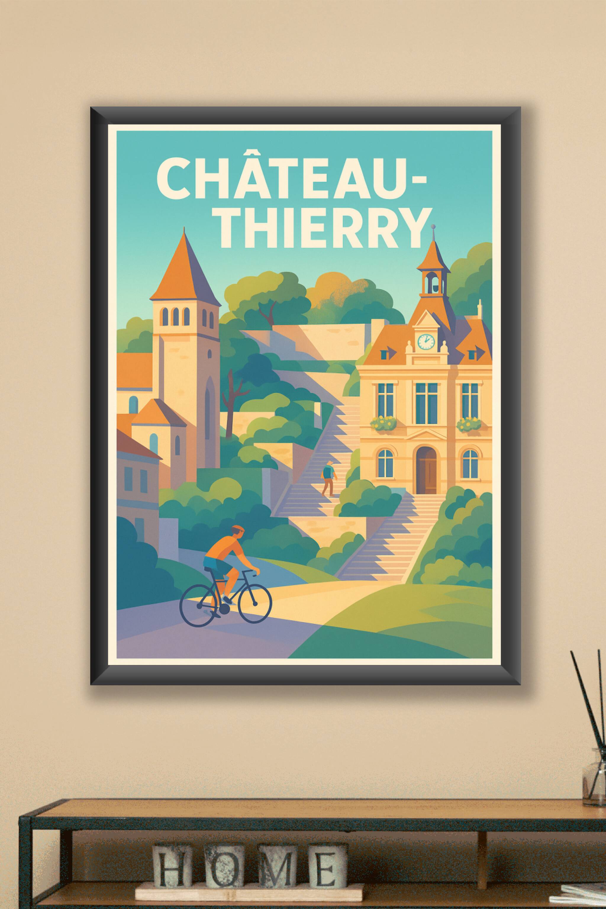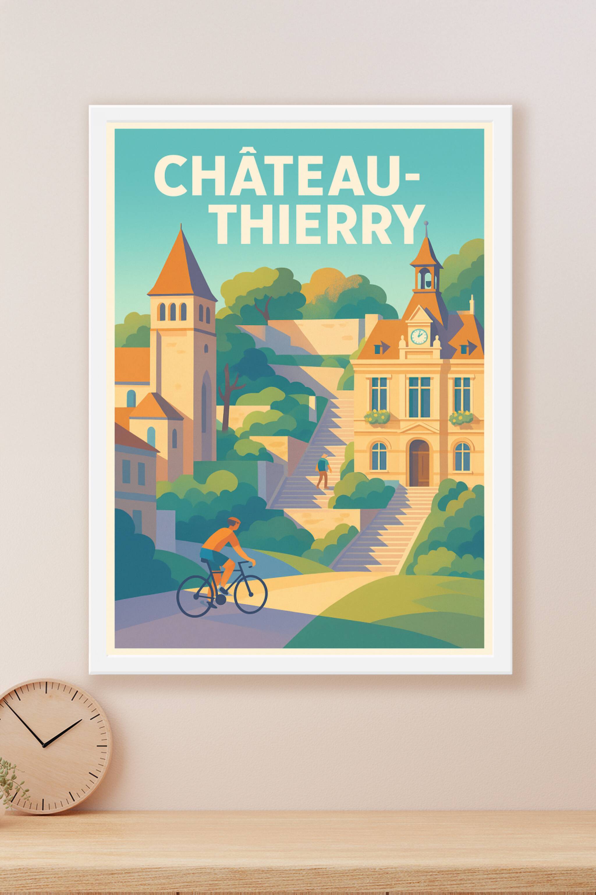 Découvrez le charme historique de Château-Thierry avec cette affiche illustrée qui met en valeur ses monuments emblématiques et son cadre bucolique...