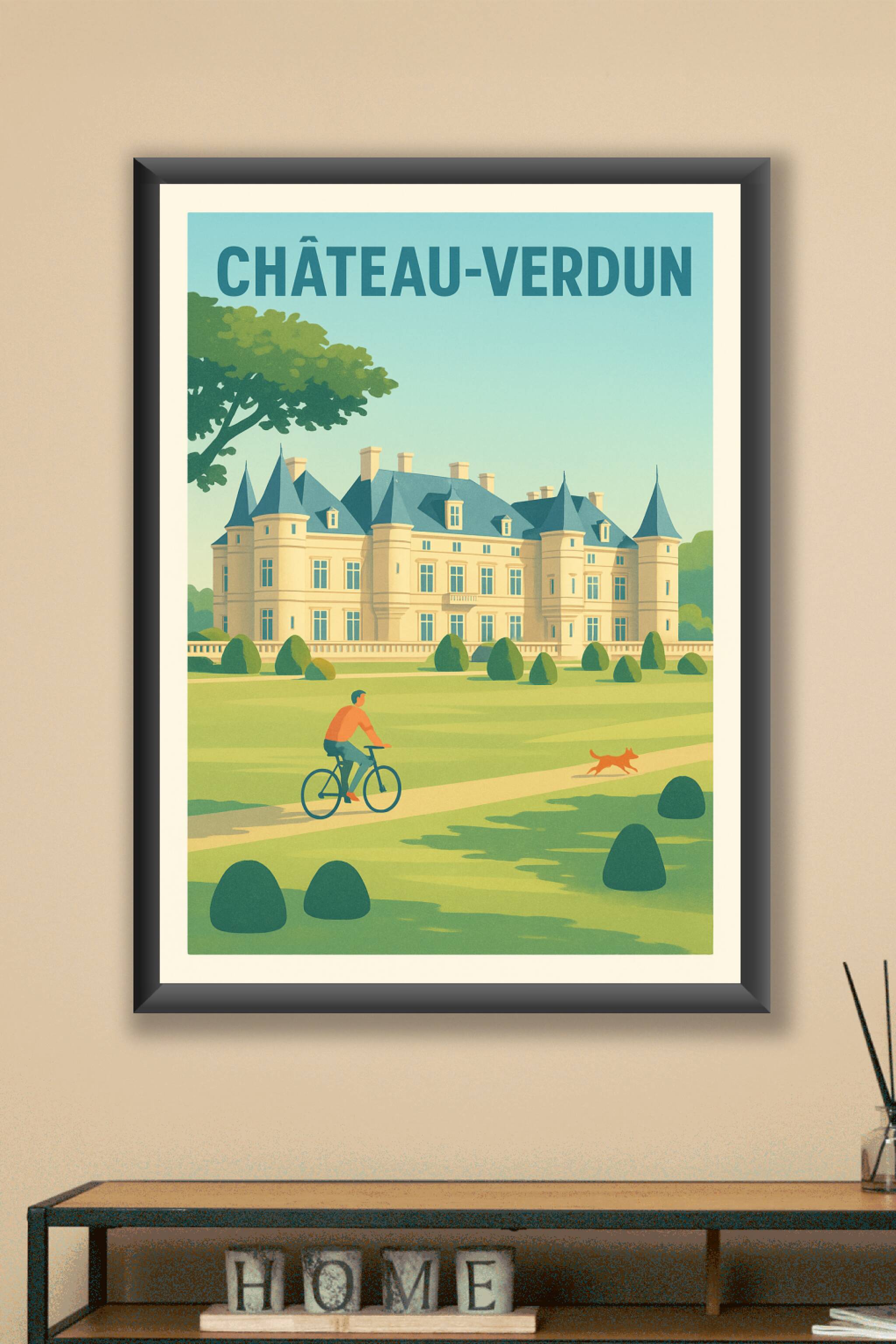 Découvrez la majesté et la tranquillité du Château de Verdun à travers cette affiche illustrée dans un style doux et élégant. Cette scène bucolique...
