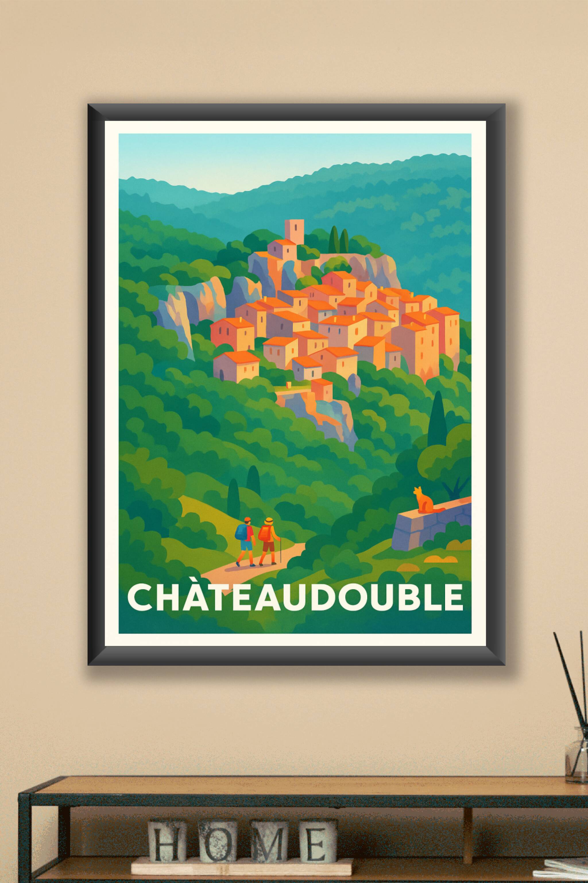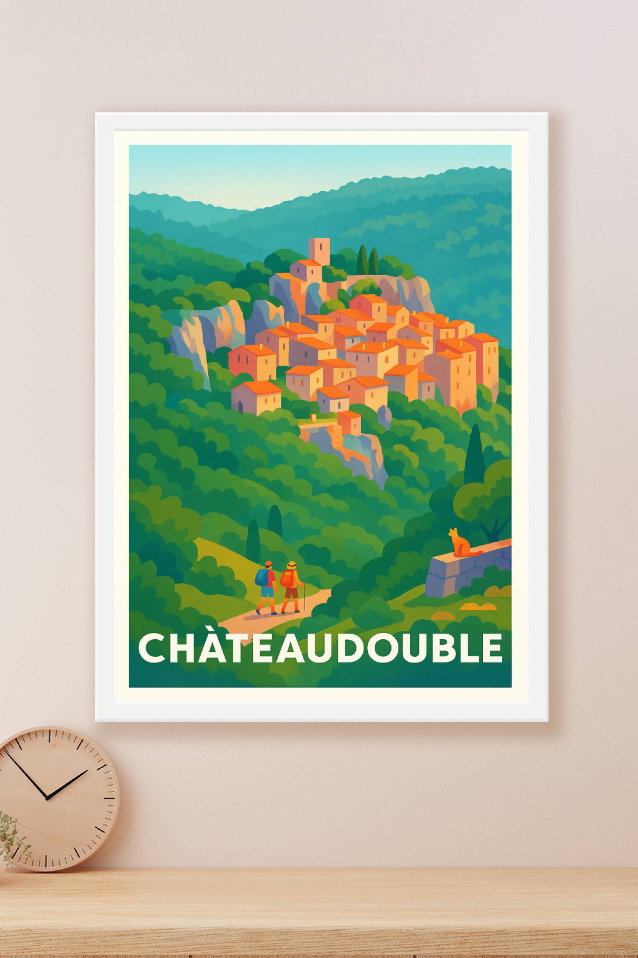 Découvrez la beauté authentique de Châteaudouble avec cette affiche illustrée qui capture l'essence d'un village typique du sud de la France, niché...