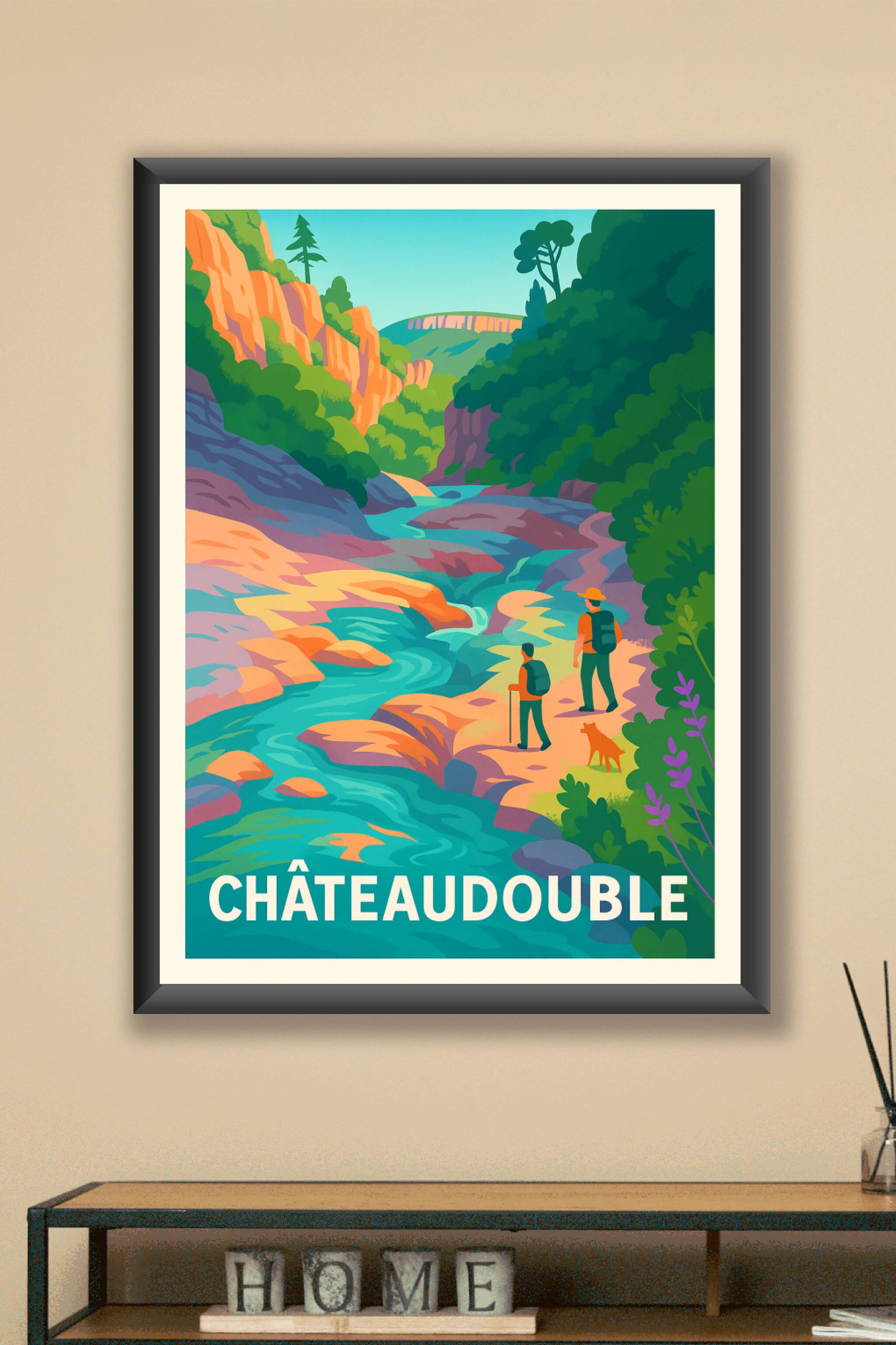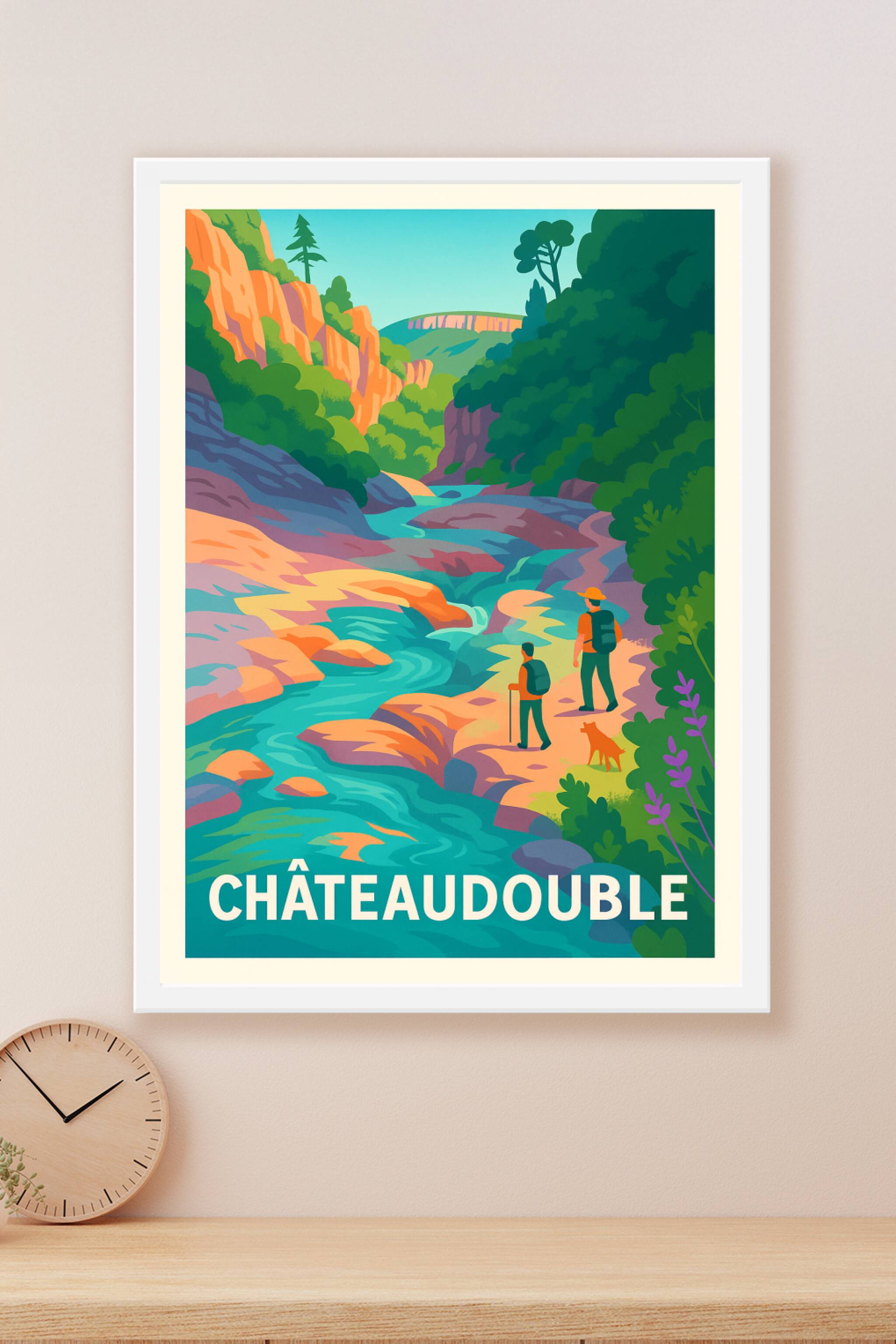 Découvrez l'évasion et la sérénité du paysage naturel autour de Châteaudouble avec cette affiche vibrante et colorée. Illustrant une randonnée au f...