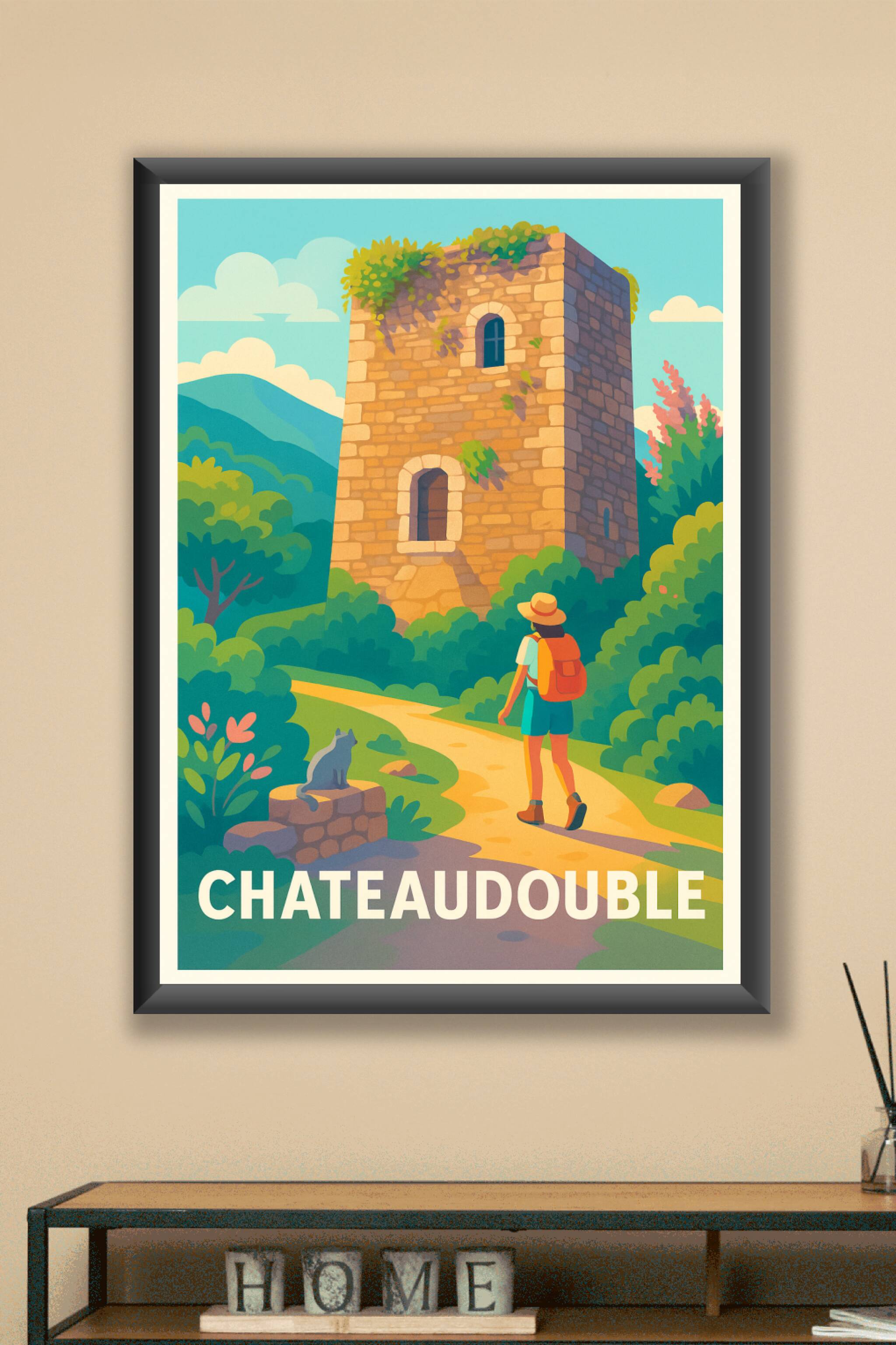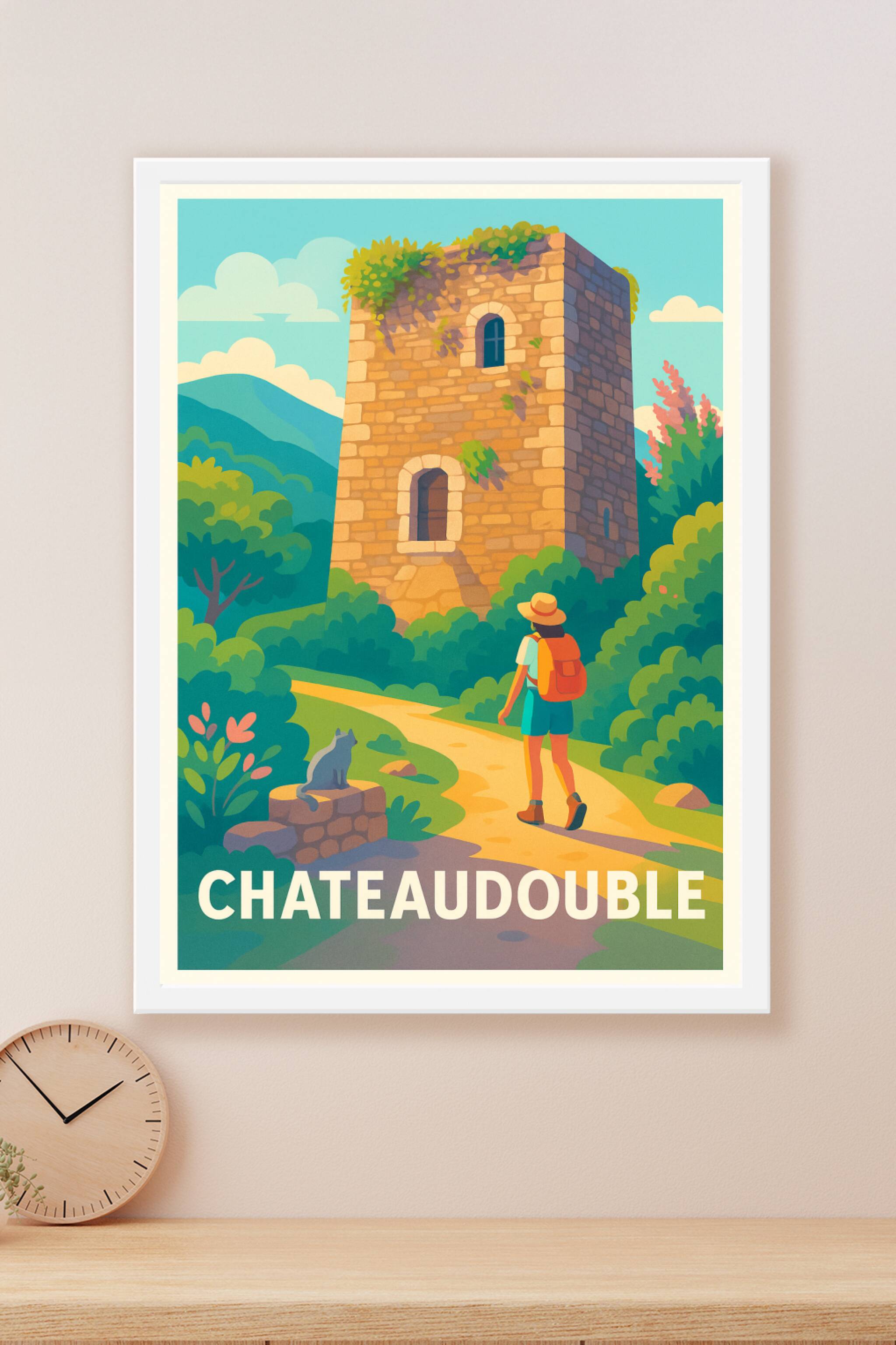 Découvrez l'ambiance paisible et bucolique de Chateaudouble avec cette affiche illustrée mettant en lumière la majestueuse tour en pierre nichée au...