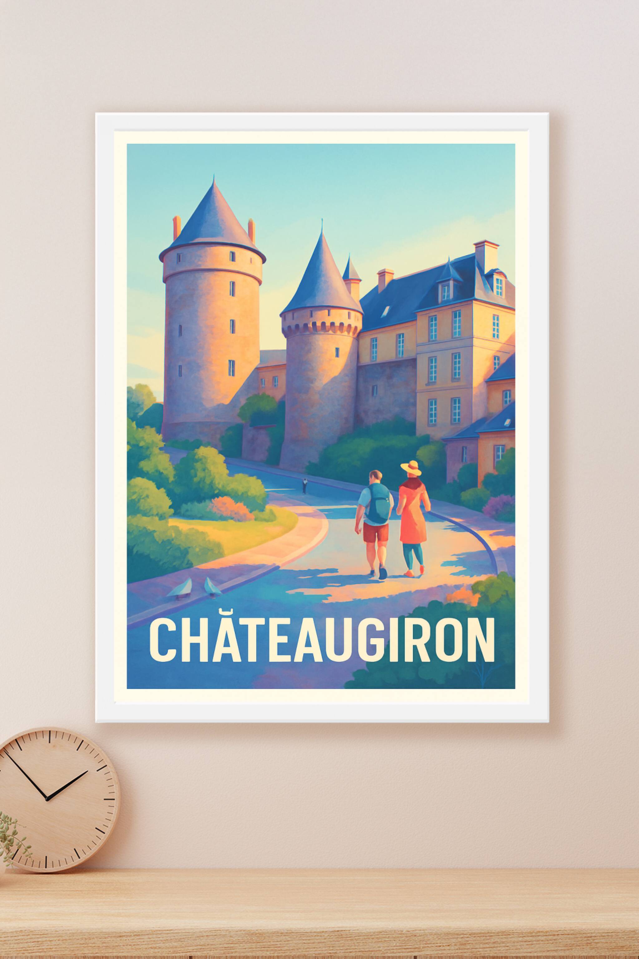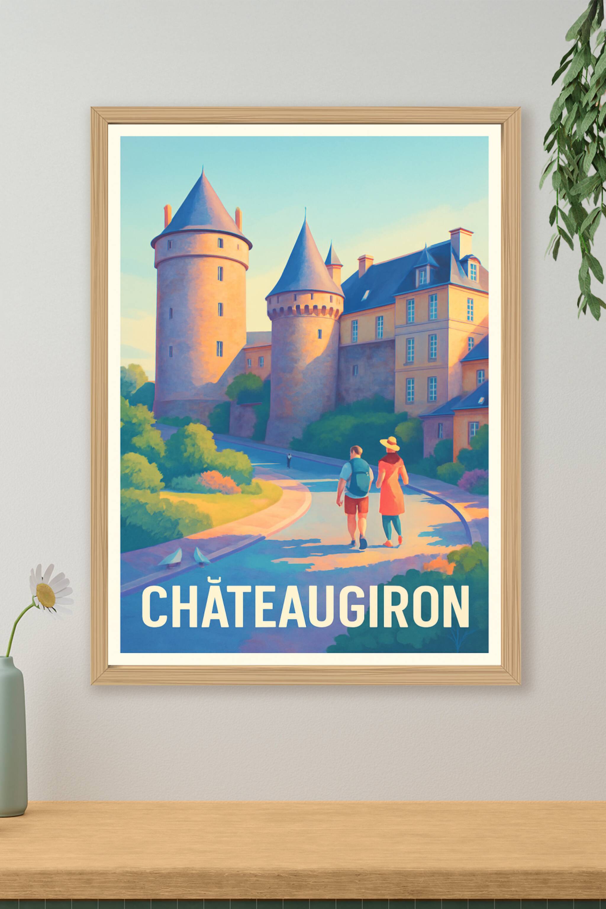 Découvrez la charmante ville historique de Châteaugiron avec cette affiche illustrée mettant en avant son célèbre château médiéval baigné par la lu...