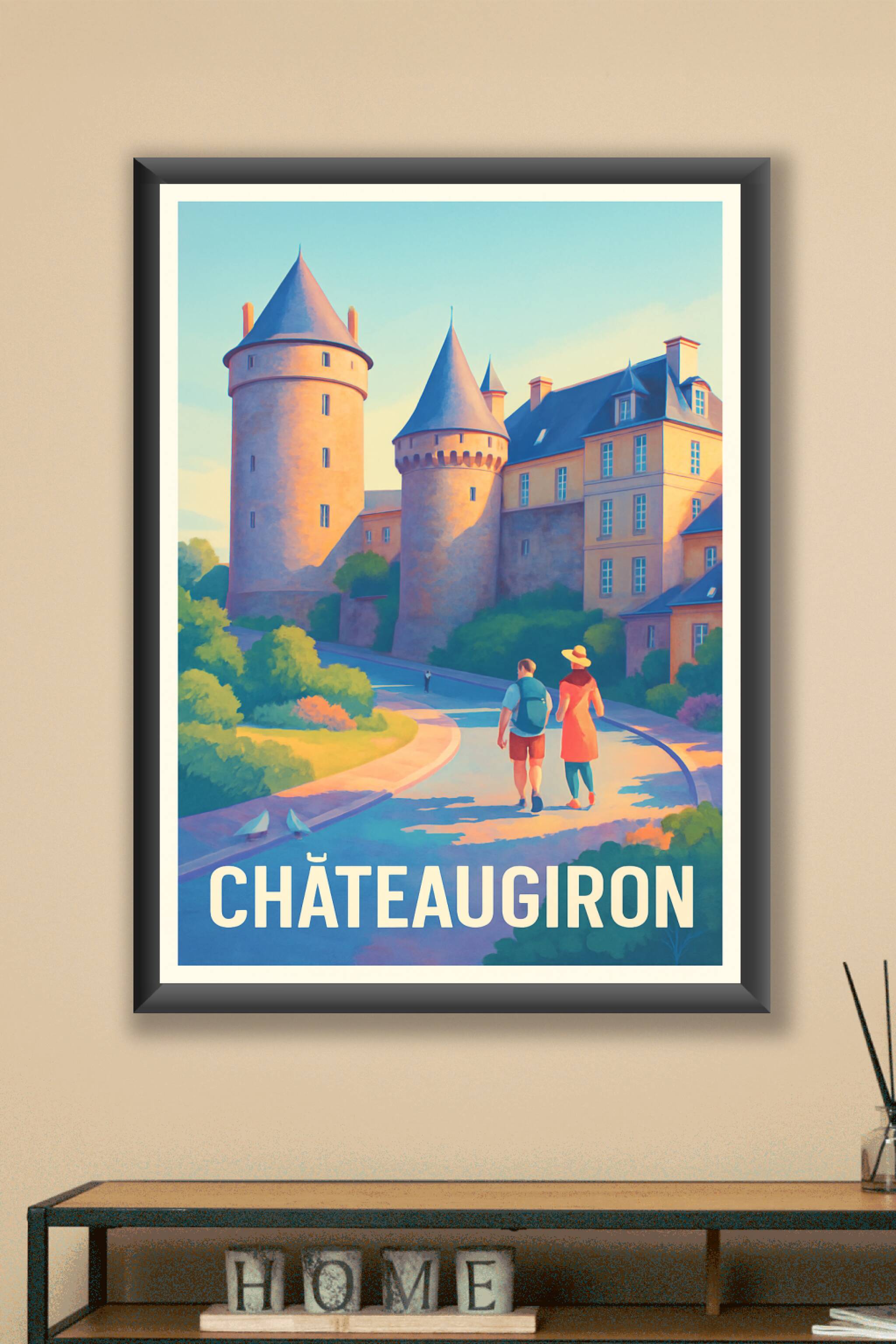 Découvrez la charmante ville historique de Châteaugiron avec cette affiche illustrée mettant en avant son célèbre château médiéval baigné par la lumière douce du coucher de soleil. Ce poster invite à la flânerie et à la découverte des ruelles pleines de charme breton. Imprimée en tirage "Fine Art" sur un papier coton 305g de haute qualité, cette affiche offre une restitution des couleurs exceptionnelle pour sublimer votre intérieur. Disponible en formats A1 à A4, avec ou sans cadre, elle s'adapte parfaitement à tous les espaces pour apporter une touche élégante et culturelle à votre décoration. Profitez d'une impression premium 100% fabriquée en France, idéale pour les amateurs de belles affiches et postérs de voyage.