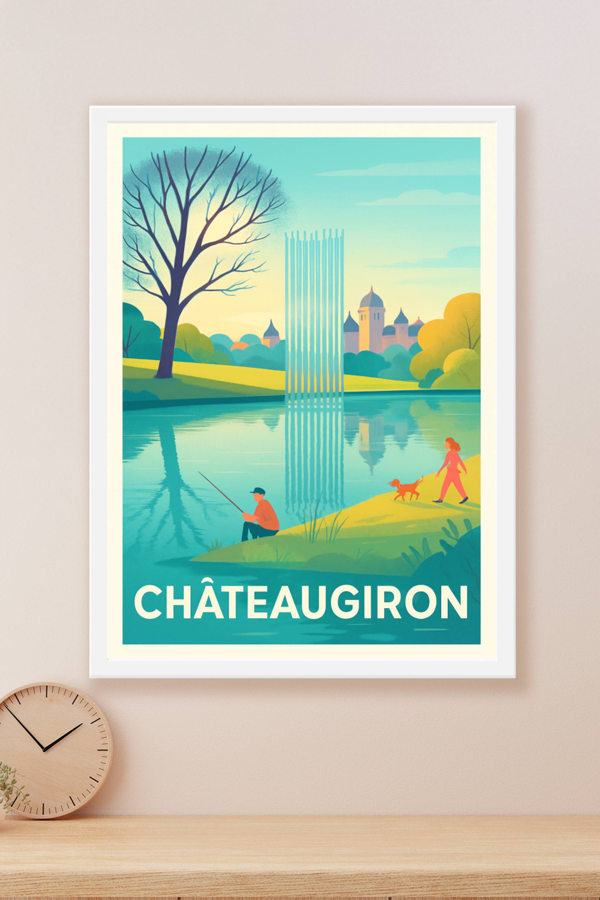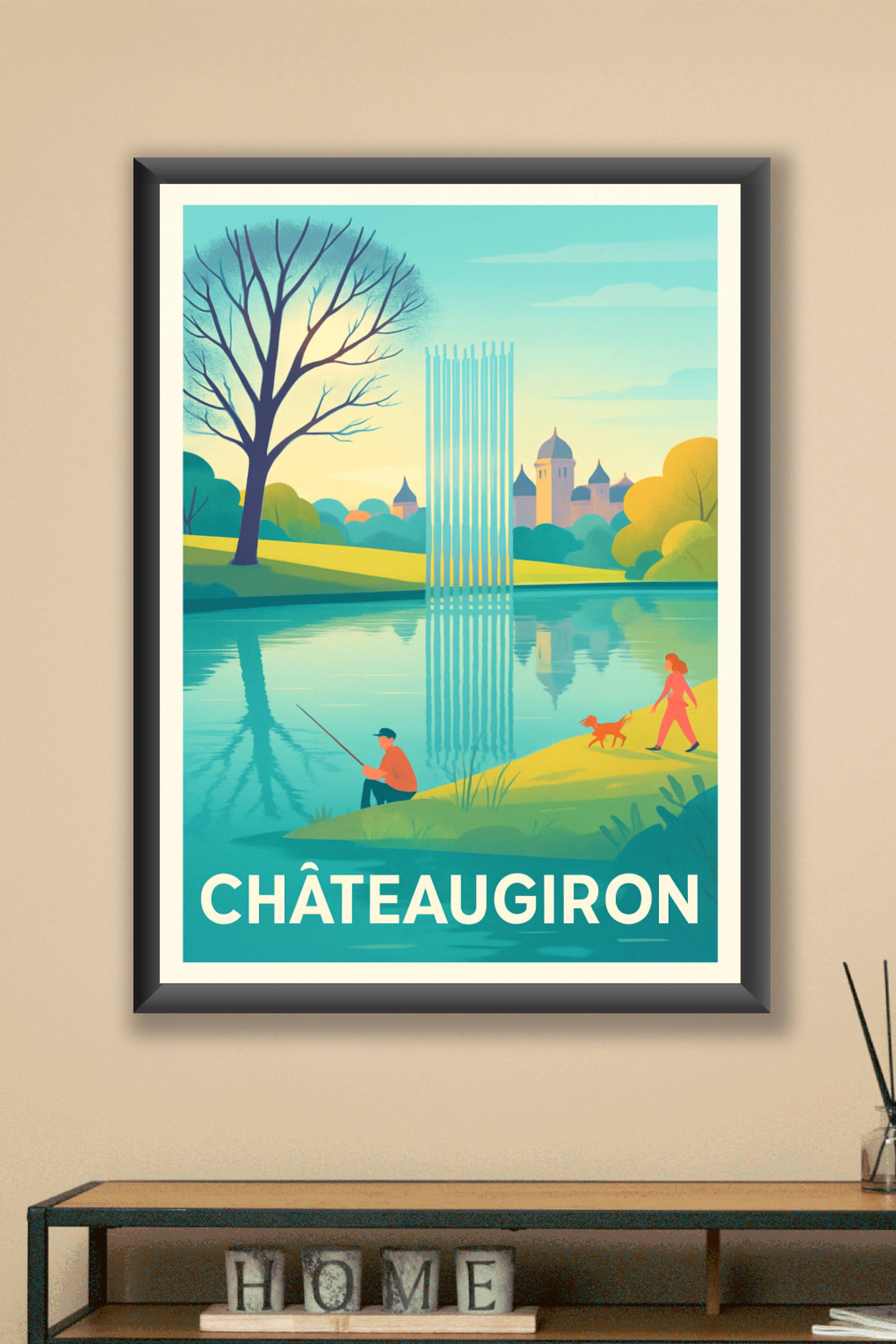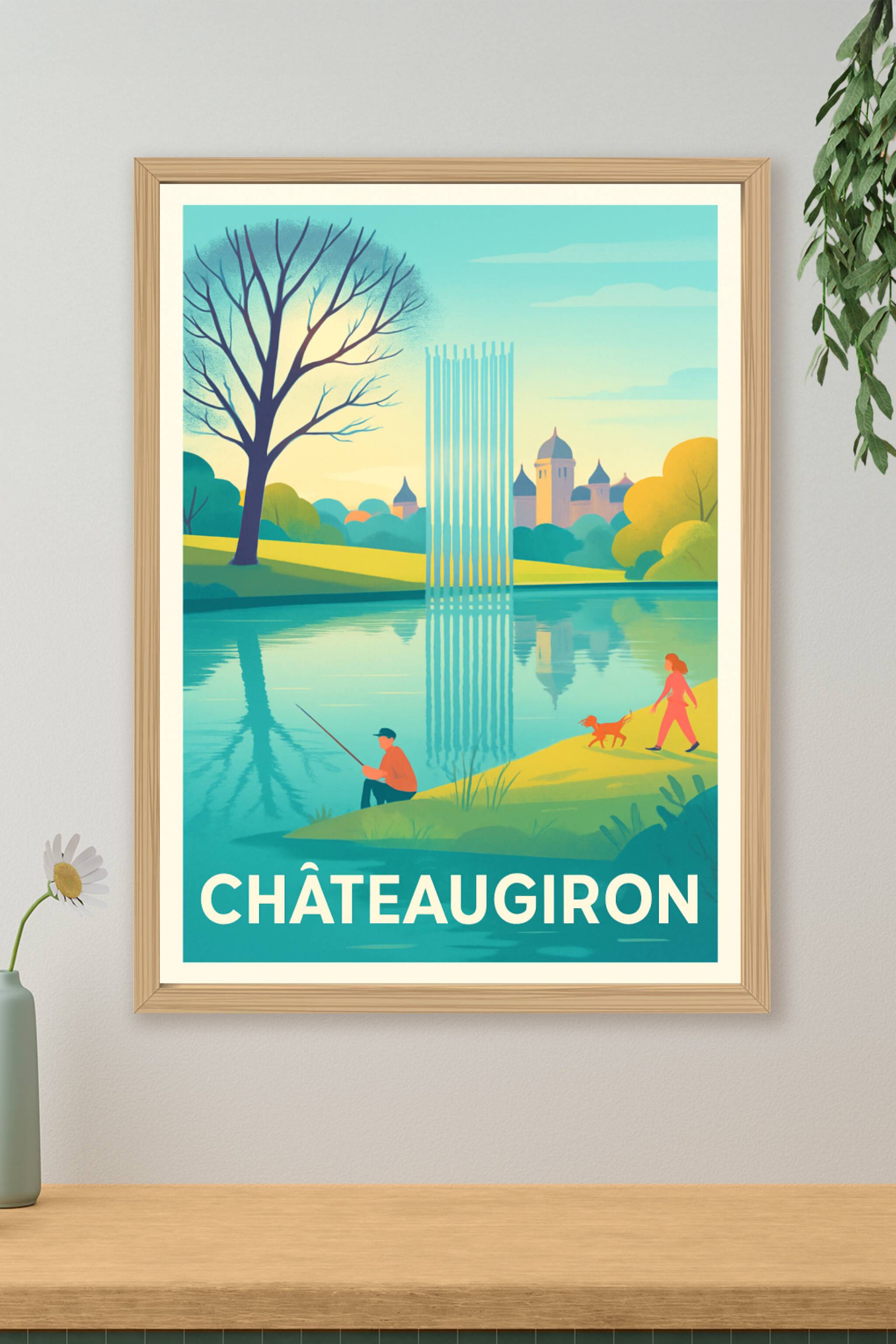 Apportez une touche de calme et de nature à votre intérieur avec cette affiche illustrant une scène paisible au bord de l'eau à Châteaugiron. On y ...