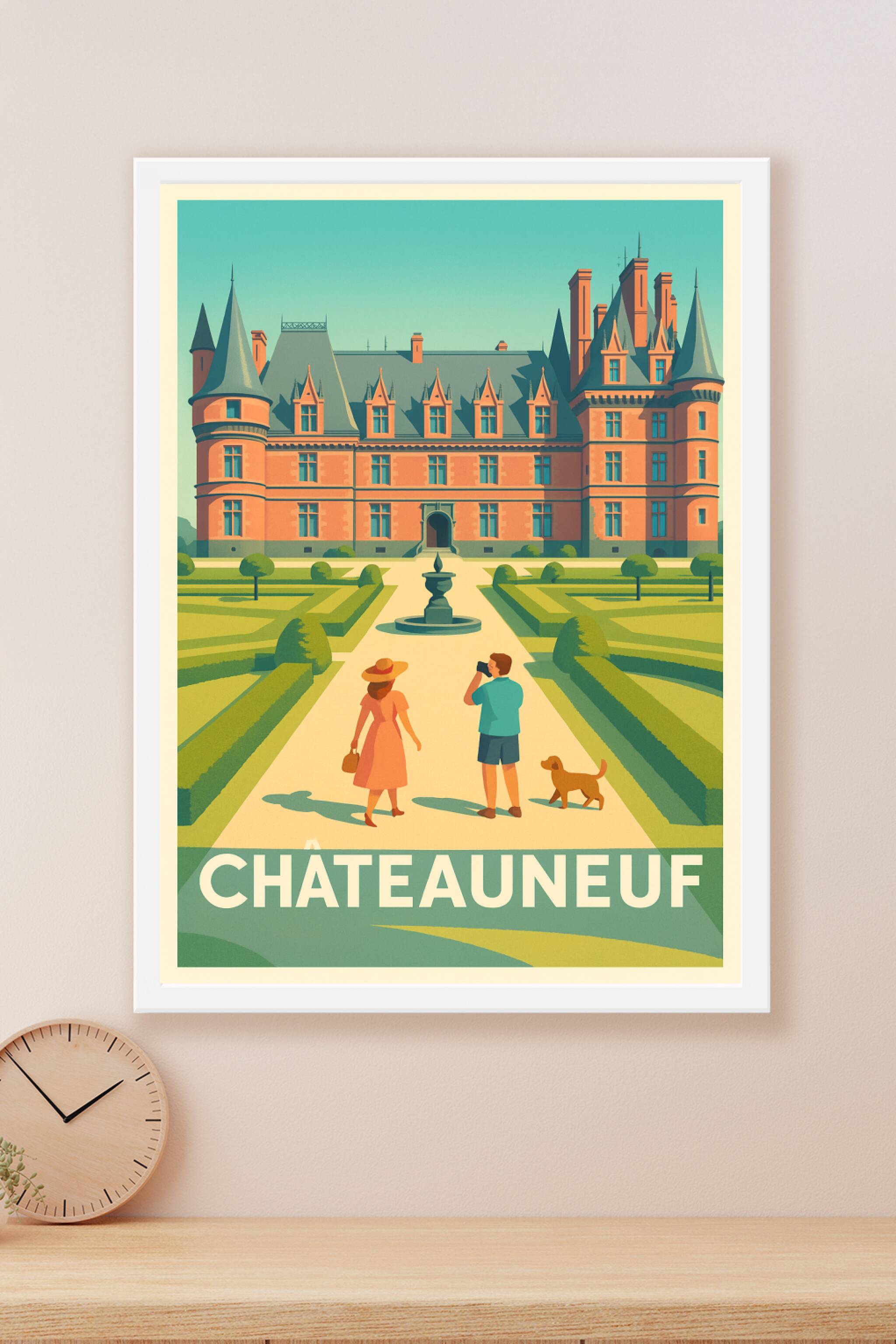 Découvrez la beauté intemporelle de Châteauneuf avec cette affiche illustrée représentant son magnifique château et ses jardins impeccablement dess...