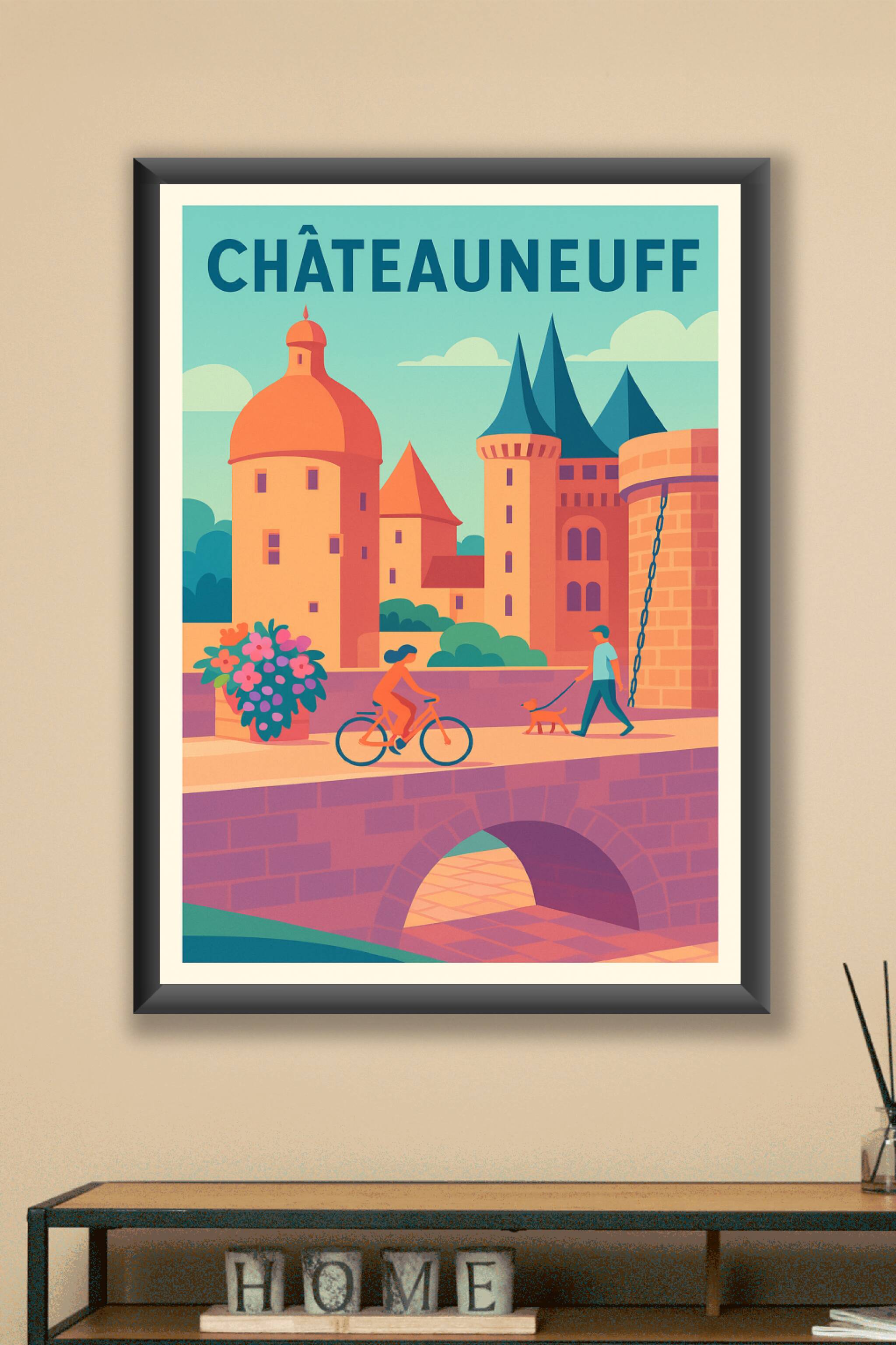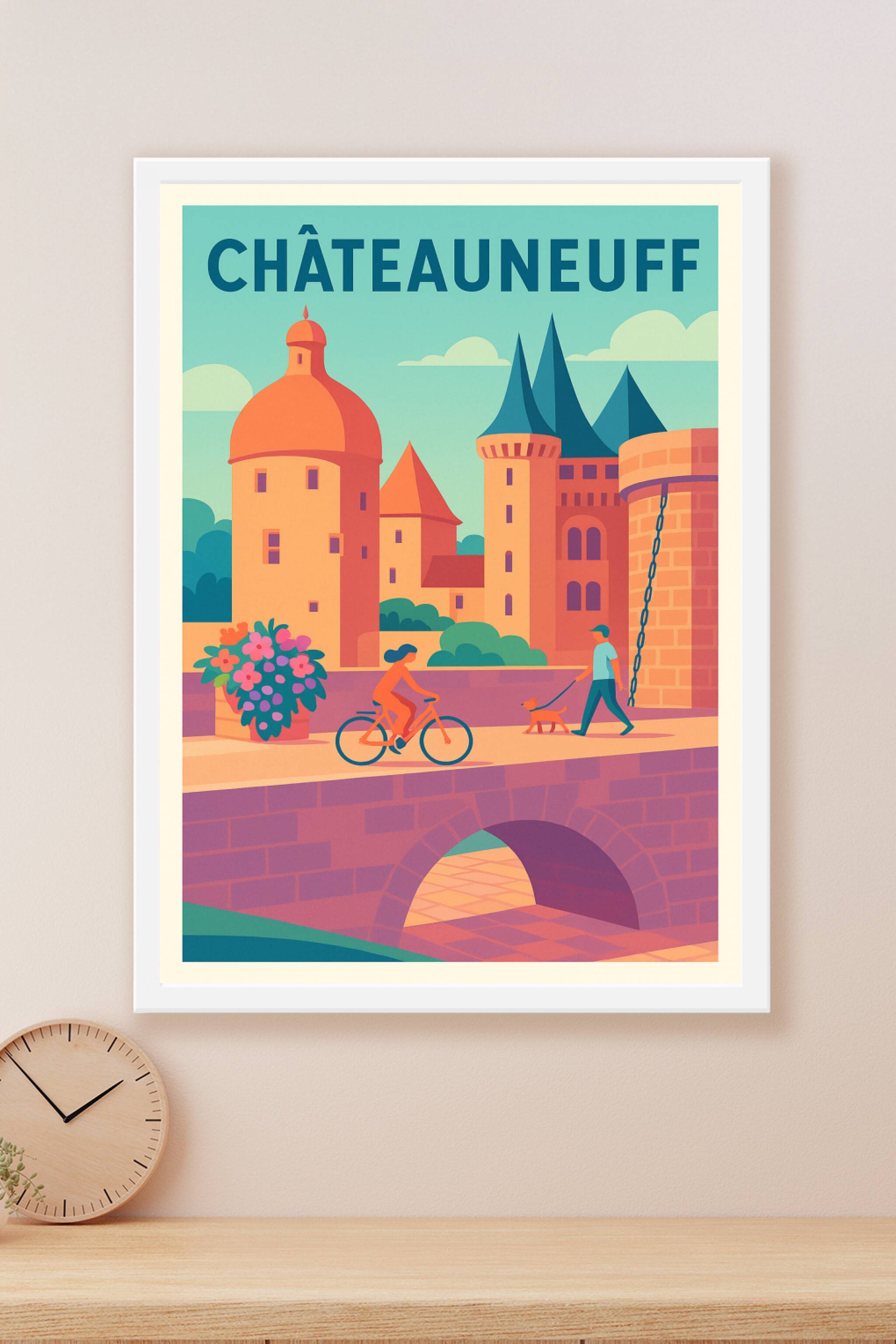 Découvrez l'atmosphère pittoresque de Châteauneuf à travers cette affiche au style illustratif moderne et coloré. Ce poster met en scène les célèbr...