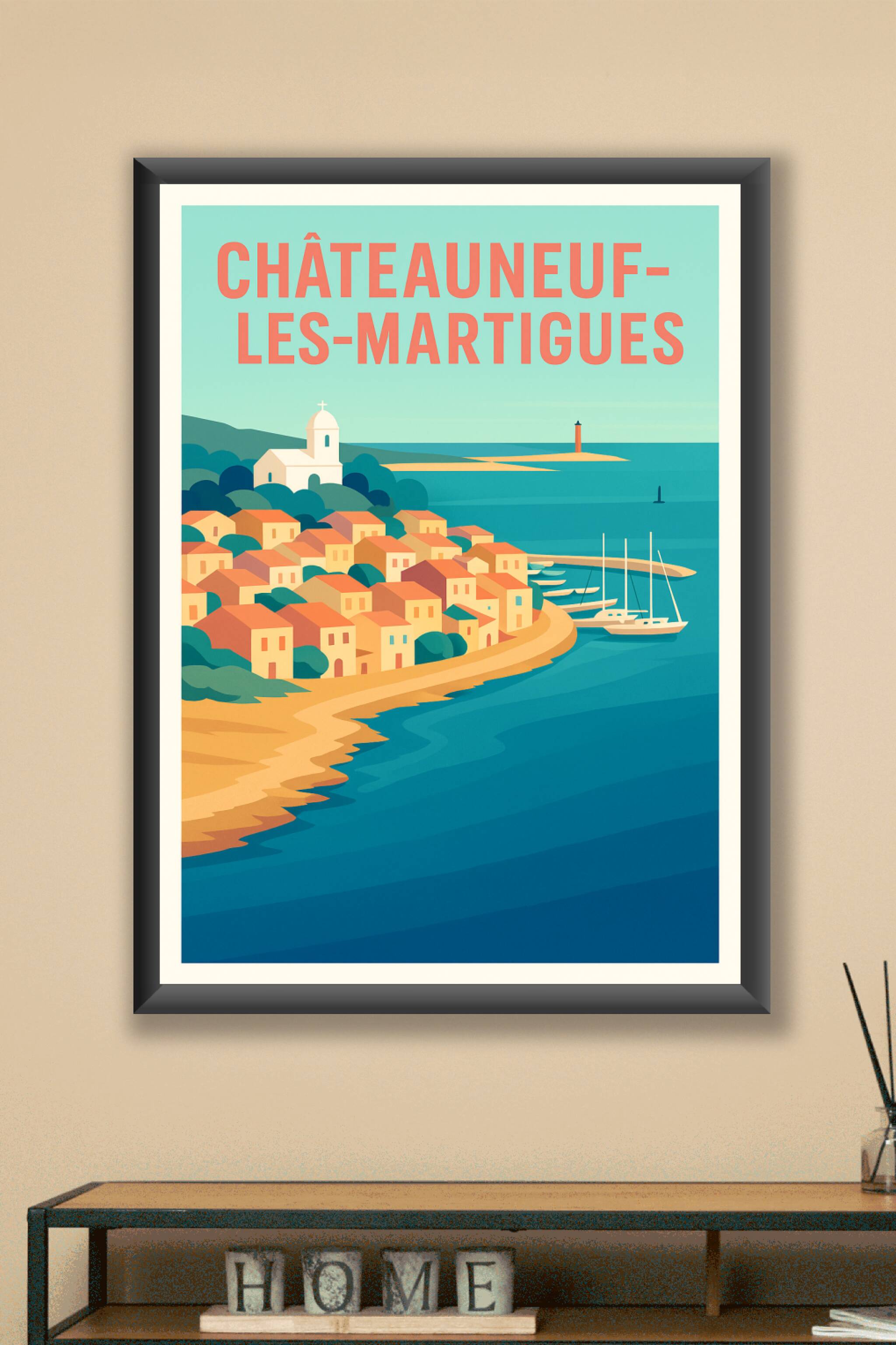 Découvrez l'élégance méditerranéenne avec cette affiche représentant Châteauneuf-les-Martigues, un village de pêcheurs aux maisons ocres baignées p...